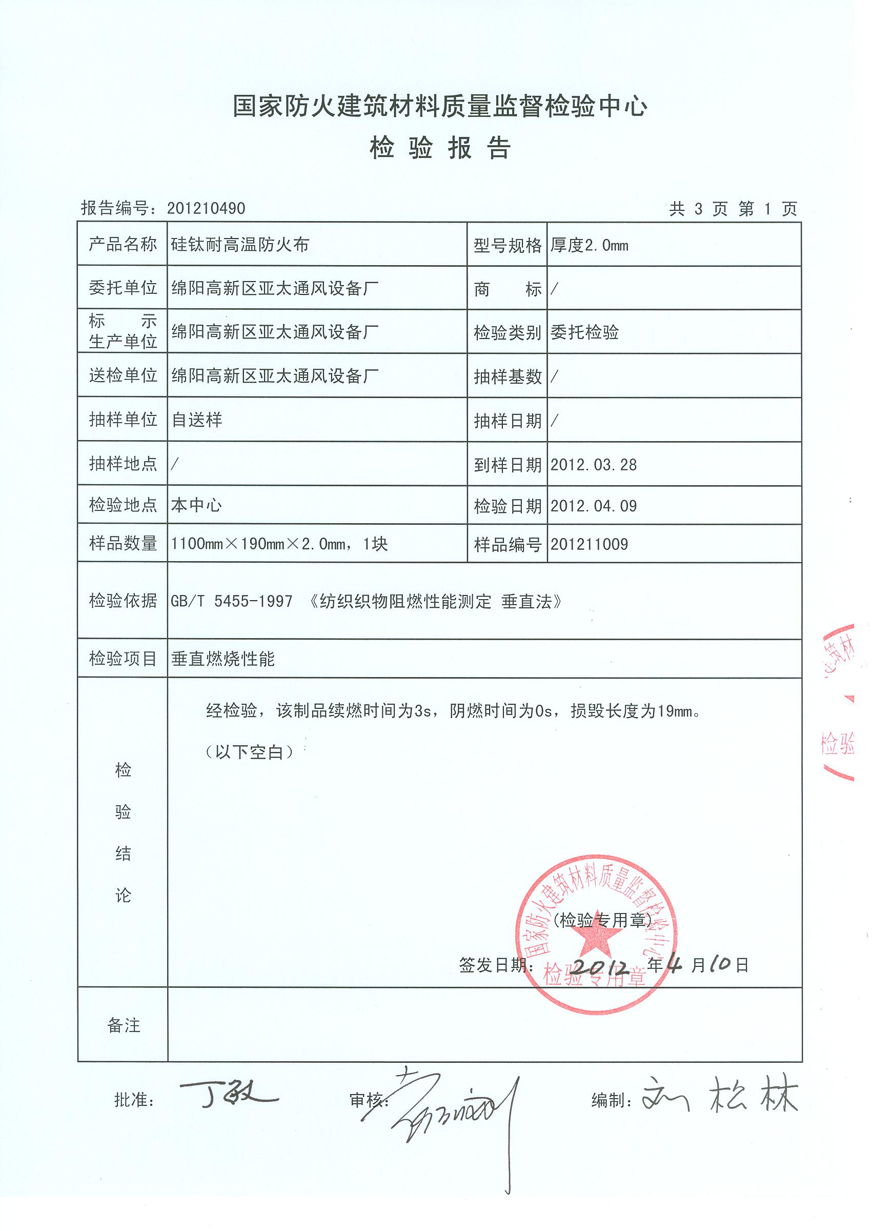 经检验,该制品续燃时间为3s,阴燃时间为0s,损毁长度为19mm。 (以下空白)