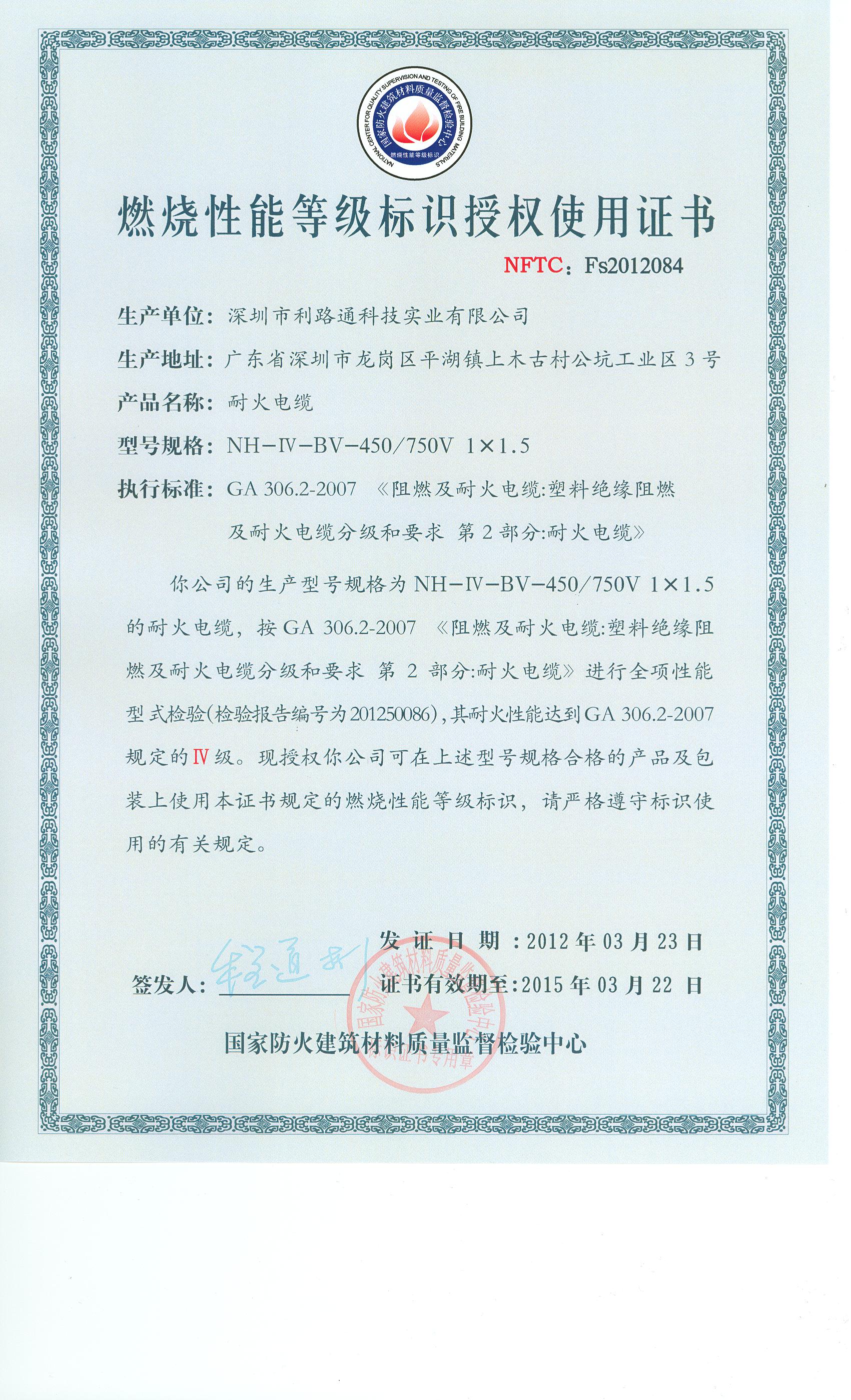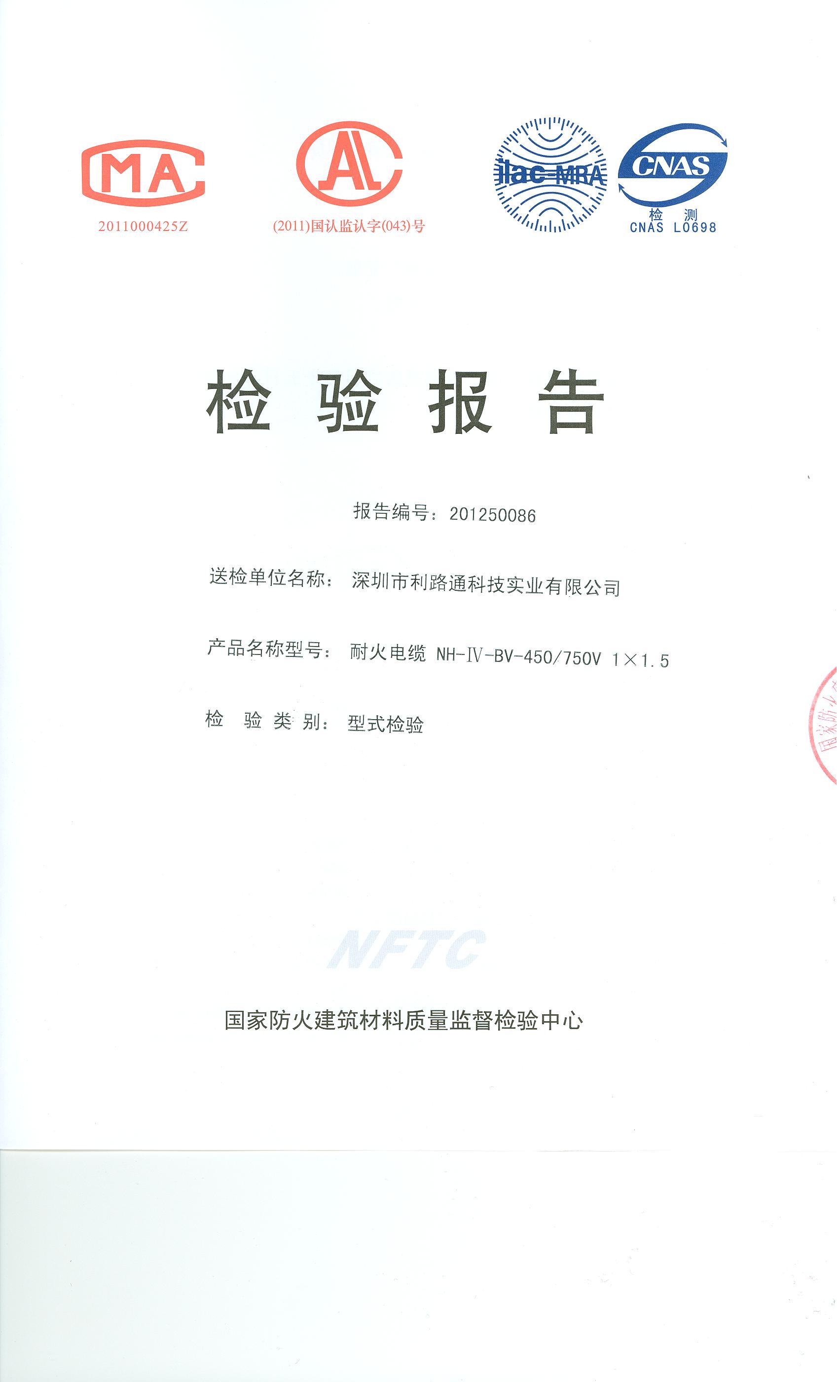 经检验,该NH-Ⅳ-BV-450/750V 1×1.5耐火电缆耐火性能符合Ⅳ级规定要求,其它各项技术指标均合格。 按GA 306.2-2007综合判定,该产品质量合格。(以下空白)