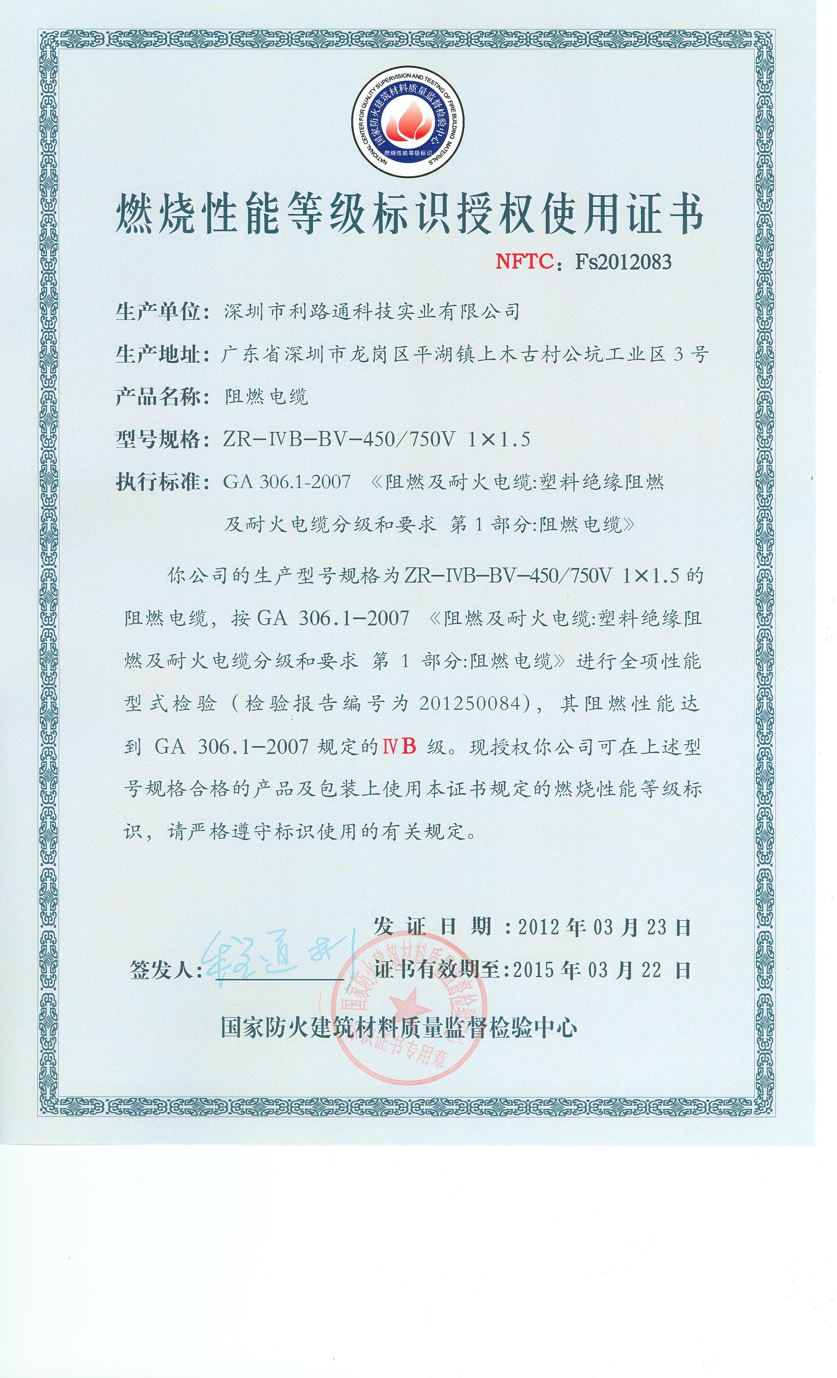 经检验,该ZR-ⅣB-BV-450/750V 1×1.5阻燃电缆阻燃性能符合ⅣB级规定要求,其它各项技术指标均合格。 按GA 306.1-2007综合判定,该产品质量合格。(以下空白)