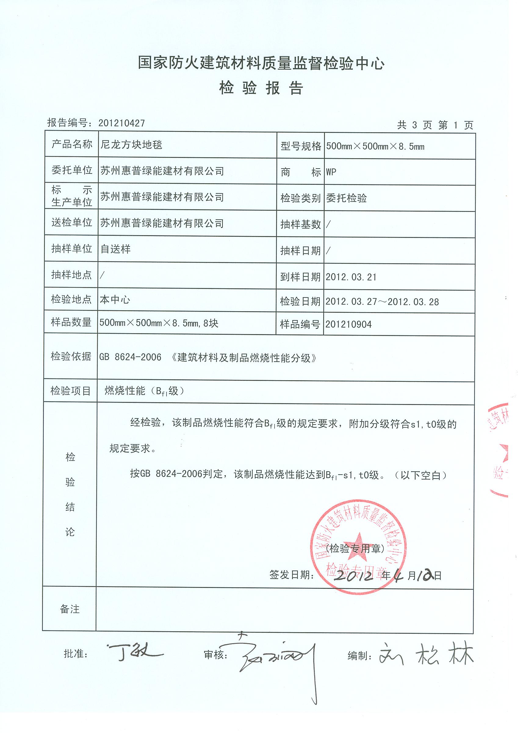 经检验,该制品燃烧性能符合B_(fl)级的规定要求,附加分级符合s1,t0级的 规定要求。 按GB 8624-2006判定,该制品燃烧性能达到B_(fl)-s1,t0级。(以下空白)