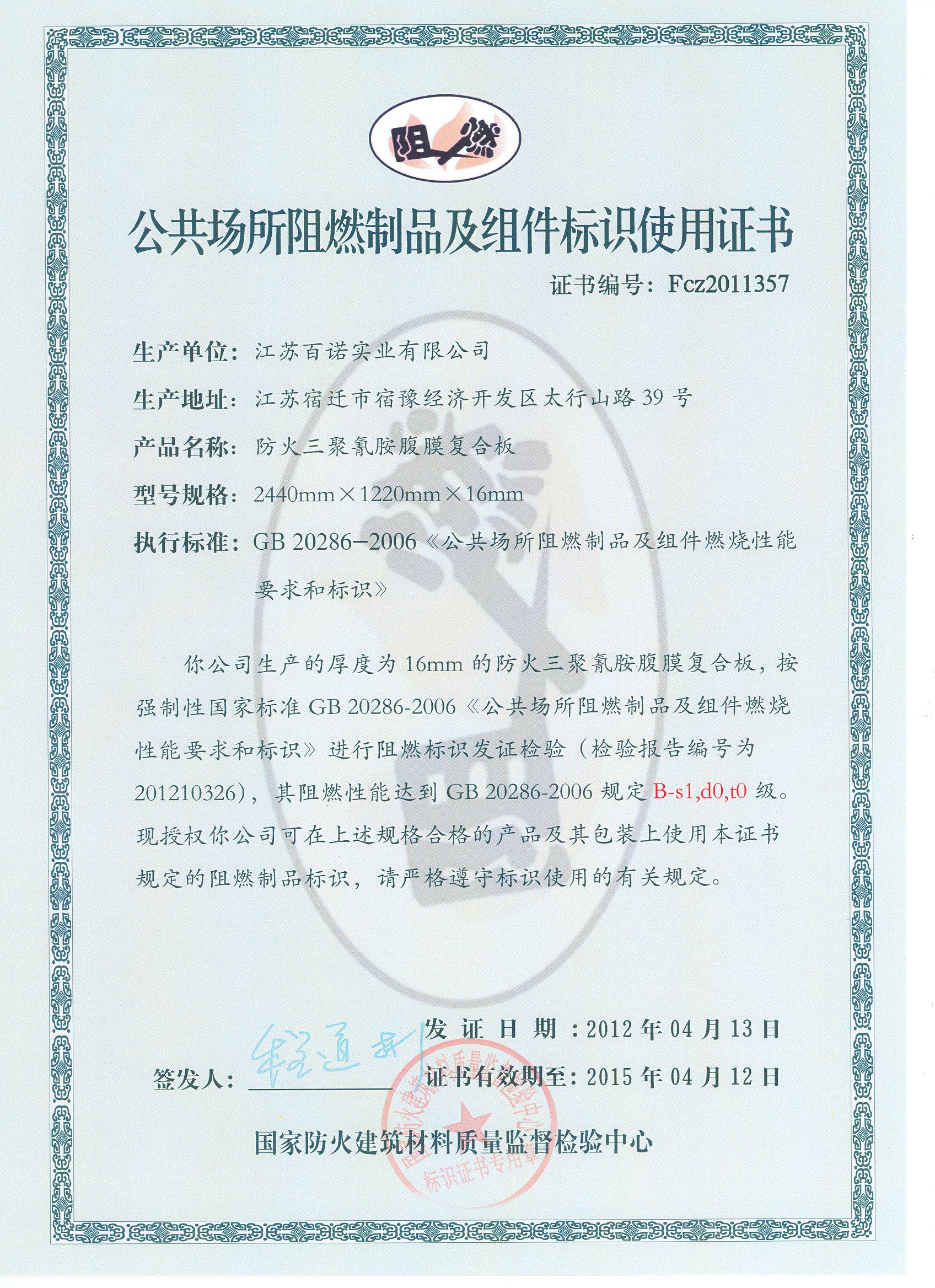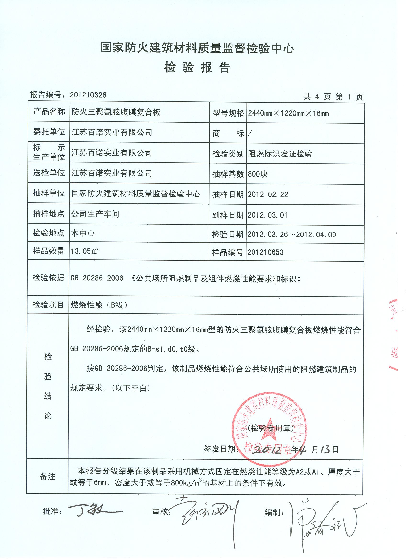 经检验,该2440mm×1220mm×16mm型的防火三聚氰胺腹膜复合板燃烧性能符合GB 20286-2006规定的B-s1,d0,t0级。 按GB 20286-2006判定,该制品燃烧性能符合公共场所使用的阻燃建筑制品的规定要求。(以下空白)