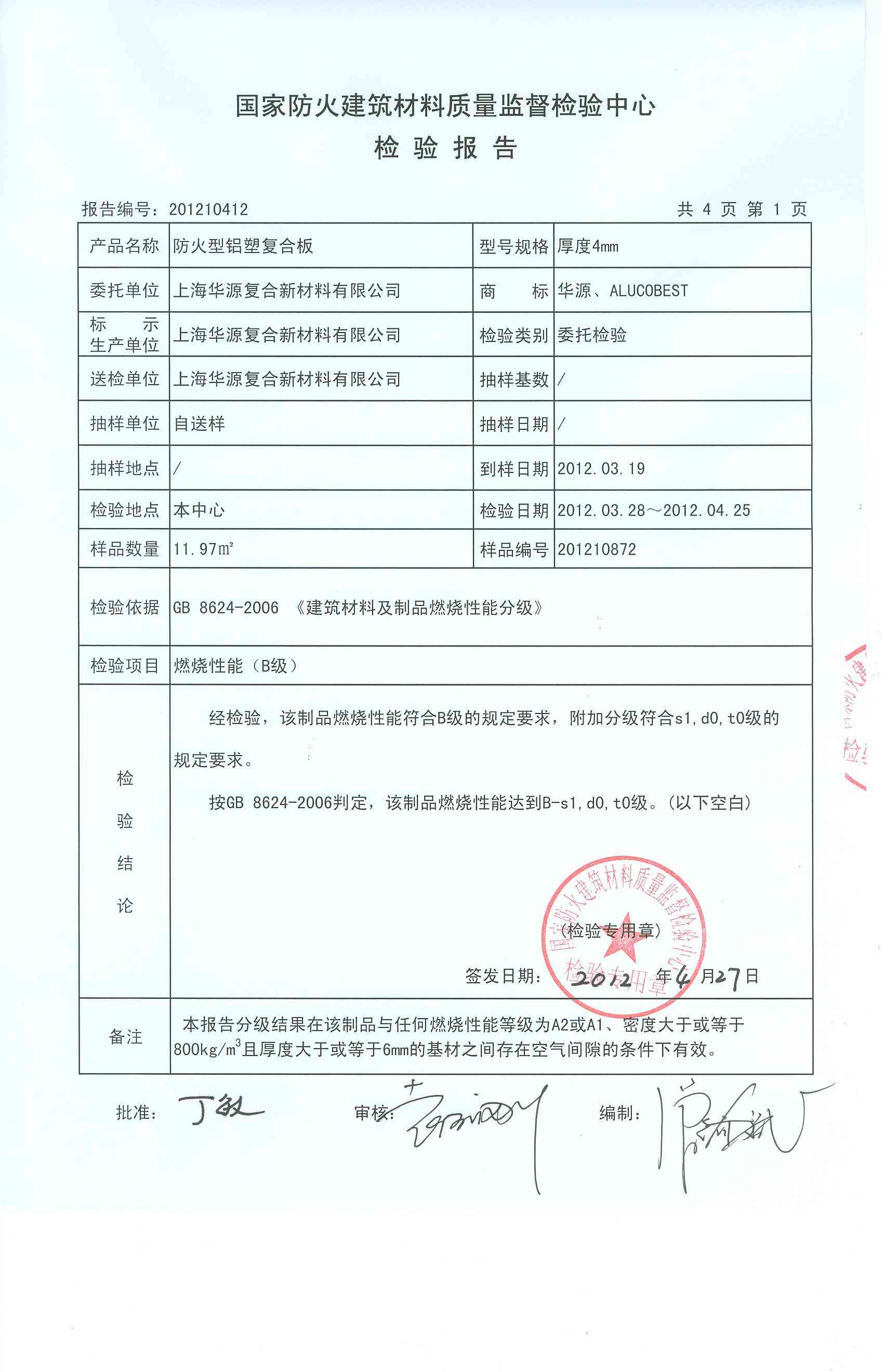 经检验,该制品燃烧性能符合B级的规定要求,附加分级符合s1,d0,t0级的 规定要求。 按GB 8624-2006判定,该制品燃烧性能达到B-s1,d0,t0级。(以下空白)