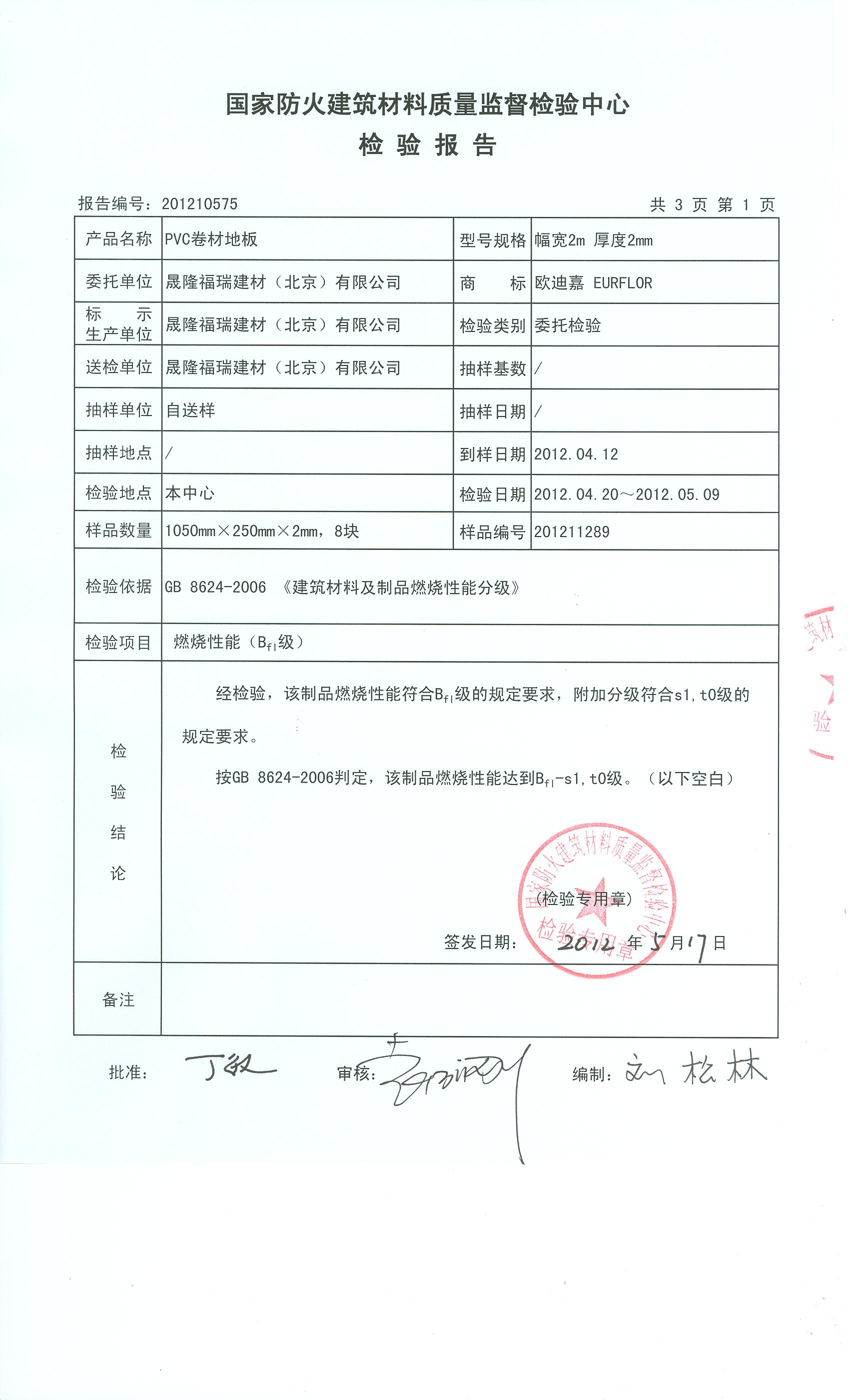 经检验,该制品燃烧性能符合B_(fl)级的规定要求,附加分级符合s1,t0级的 规定要求。 按GB 8624-2006判定,该制品燃烧性能达到B_(fl)-s1,t0级。(以下空白)
