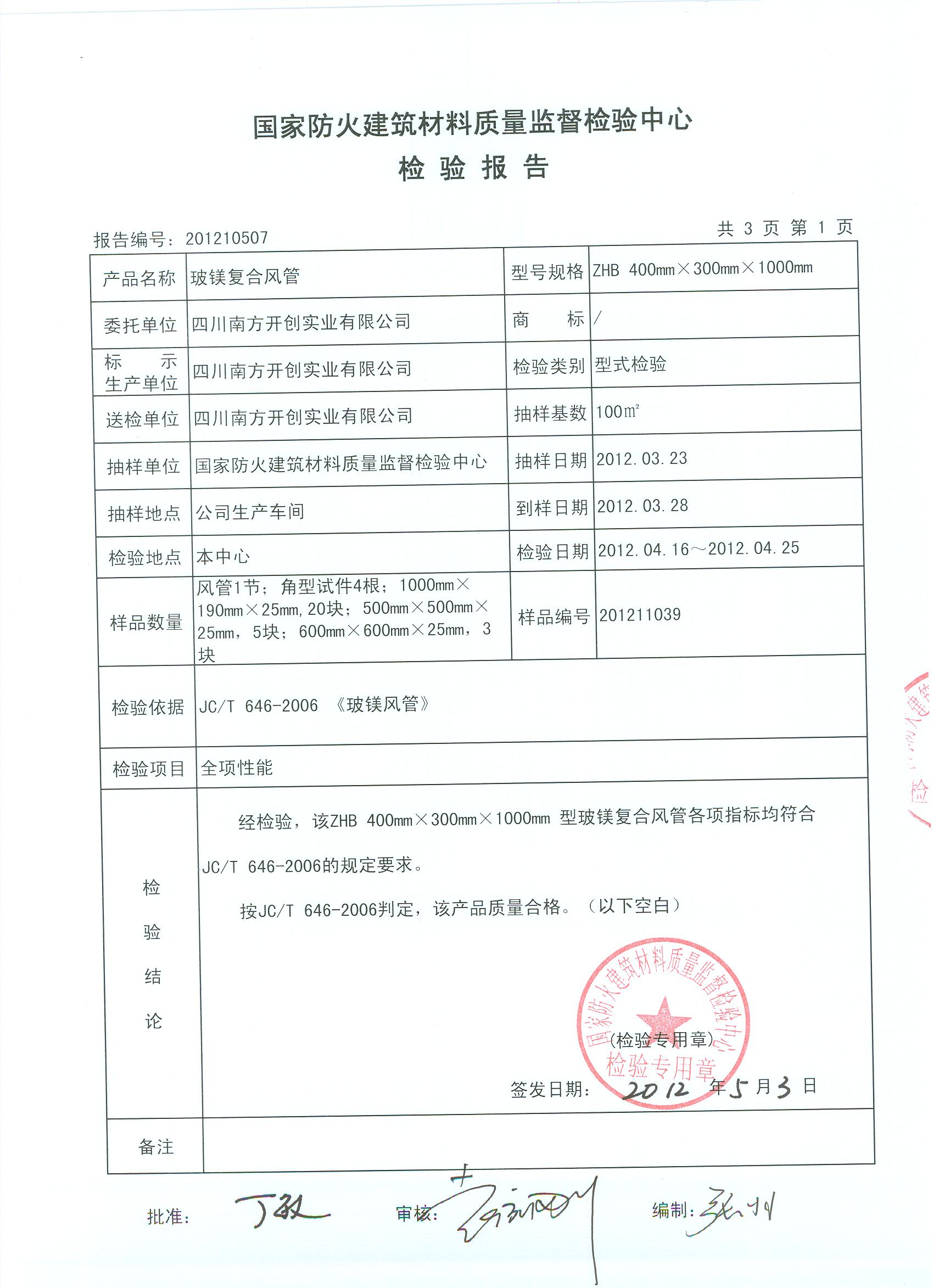 经检验,该ZHB 400mm×300mm×1000mm 型玻镁复合风管各项指标均符合JC/T 646-2006的规定要求。 按JC/T 646-2006判定,该产品质量合格。(以下空白)
