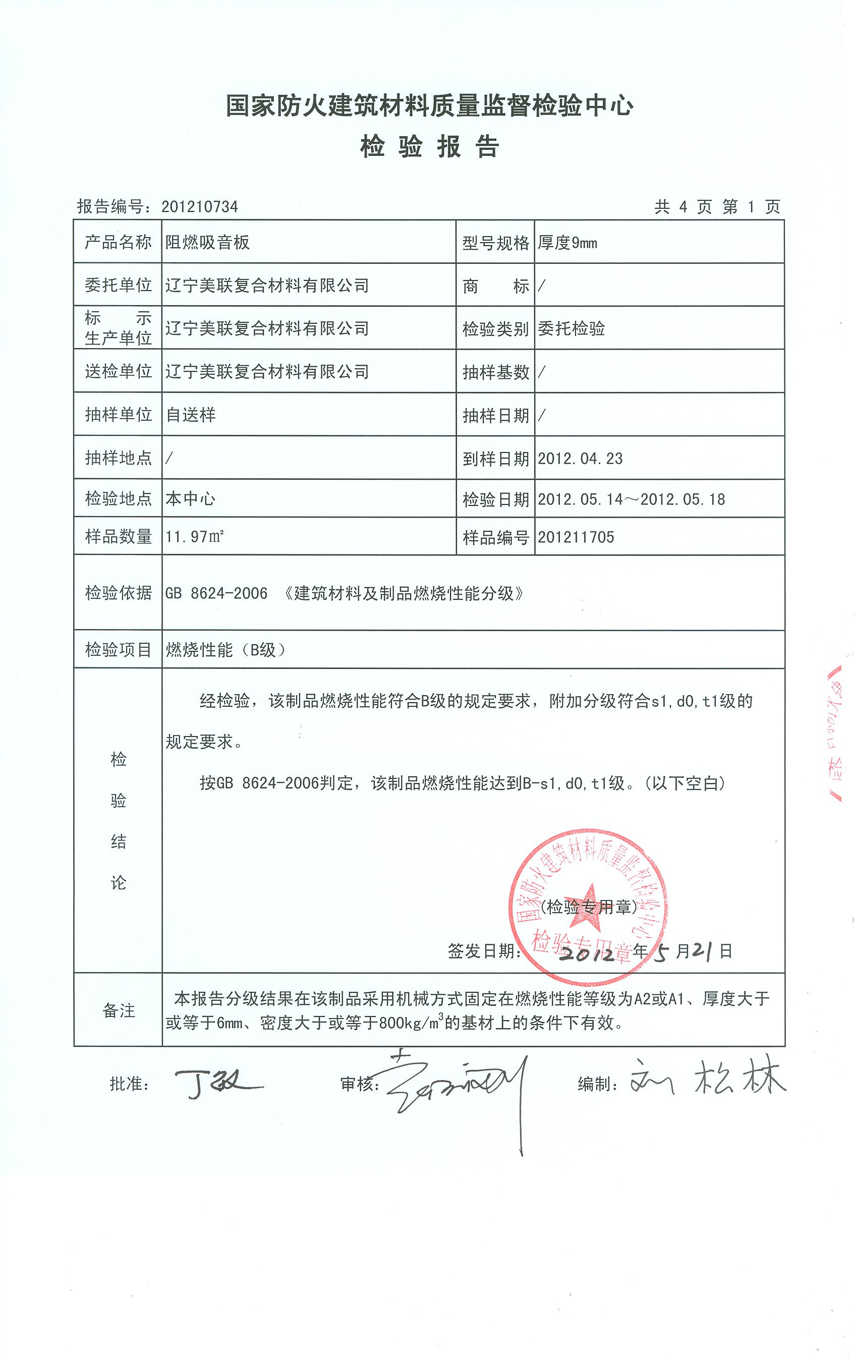 经检验,该制品燃烧性能符合B级的规定要求,附加分级符合s1,d0,t1级的 规定要求。 按GB 8624-2006判定,该制品燃烧性能达到B-s1,d0,t1级。(以下空白)