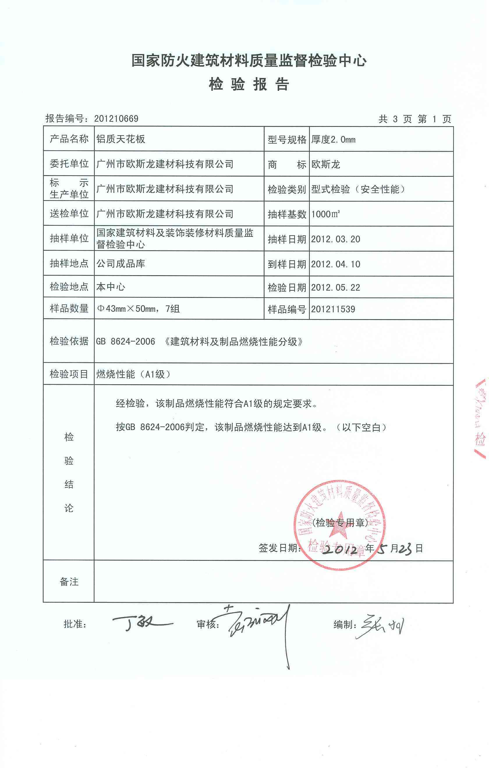 经检验,该制品燃烧性能符合A1级的规定要求。 按GB 8624-2006判定,该制品燃烧性能达到A1级。(以下空白)