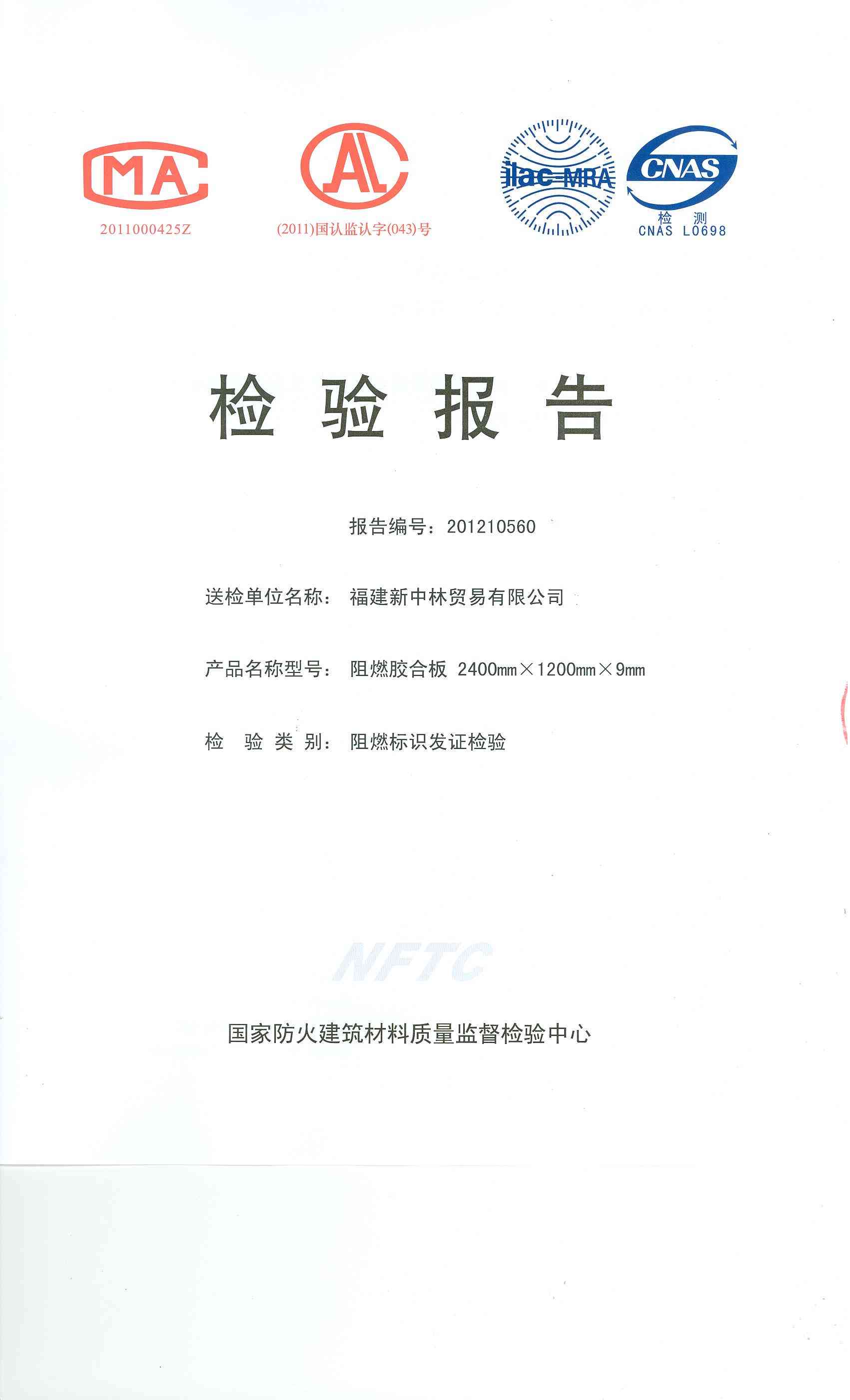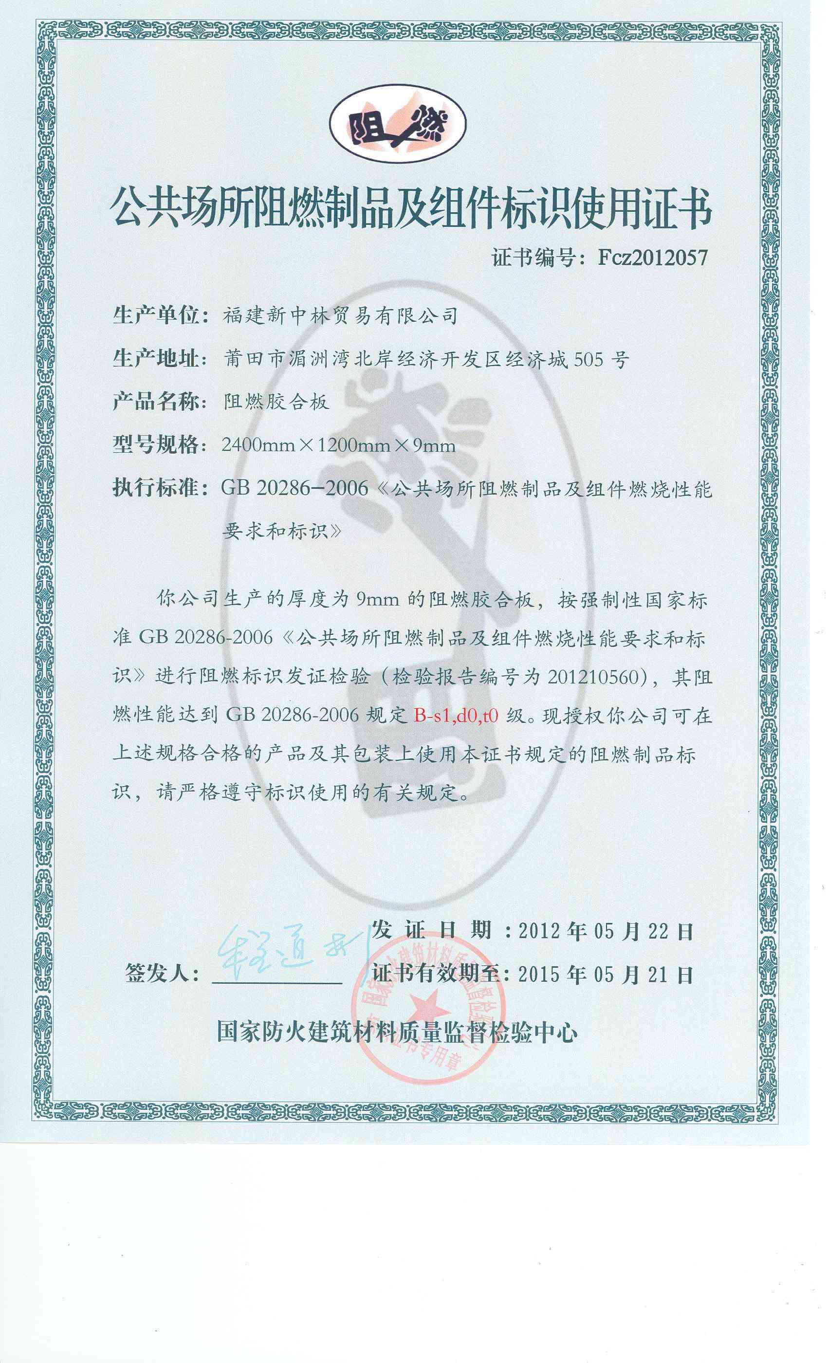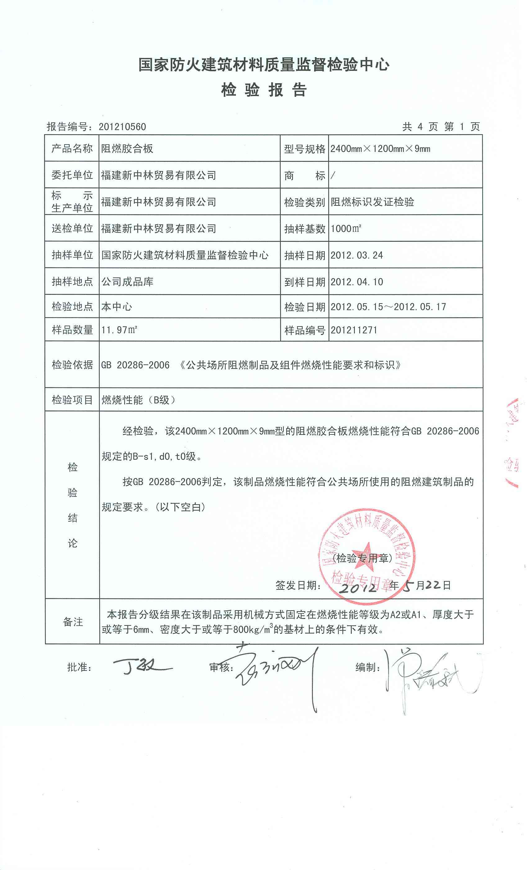 经检验,该2400mm×1200mm×9mm型的阻燃胶合板燃烧性能符合GB 20286-2006规定的B-s1,d0,t0级。 按GB 20286-2006判定,该制品燃烧性能符合公共场所使用的阻燃建筑制品的规定要求。(以下空白)
