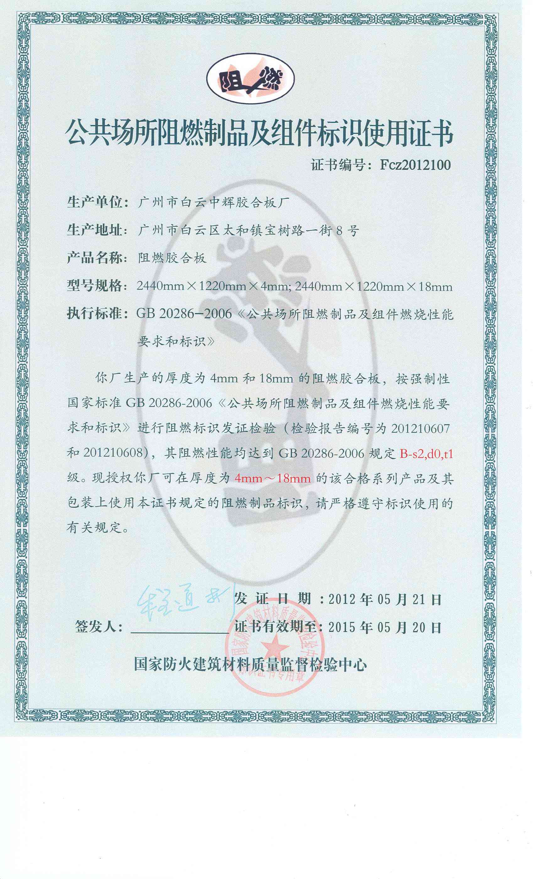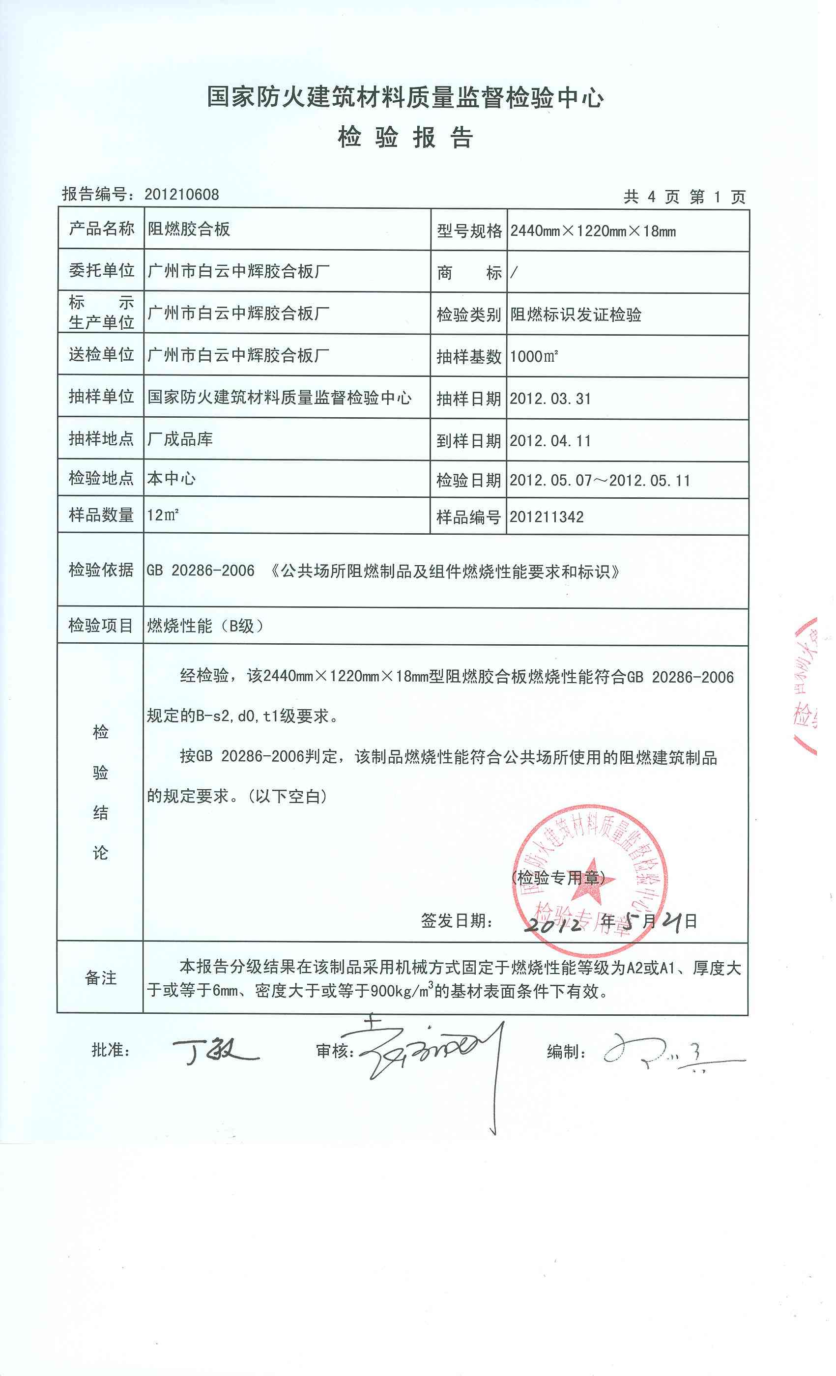 经检验,该2440mm×1220mm×18mm型阻燃胶合板燃烧性能符合GB 20286-2006规定的B-s2,d0,t1级要求。 按GB 20286-2006判定,该制品燃烧性能符合公共场所使用的阻燃建筑制品的规定要求。(以下空白)