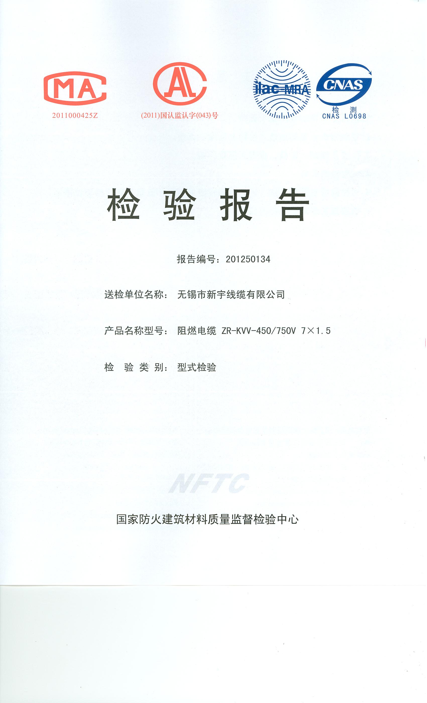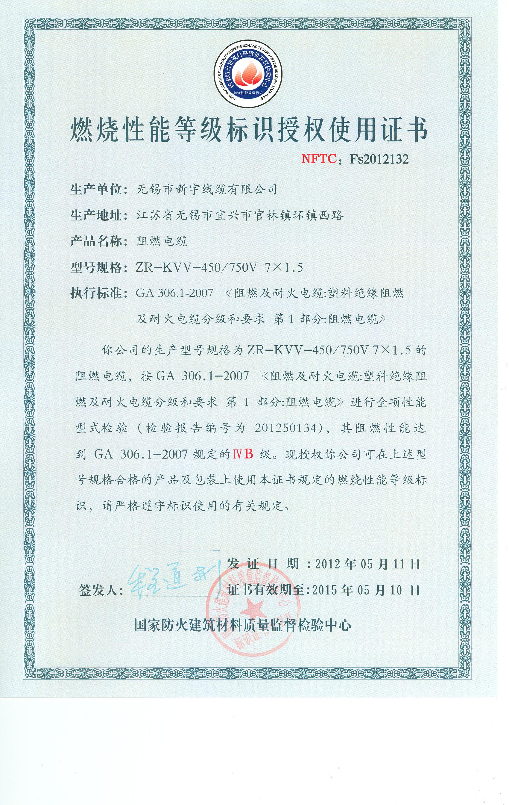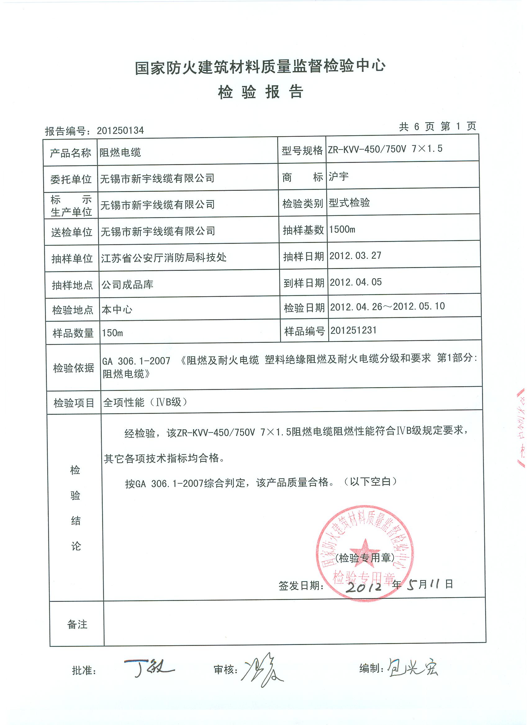 经检验,该ZR-KVV-450/750V 7×1.5阻燃电缆阻燃性能符合ⅣB级规定要求,其它各项技术指标均合格。 按GA 306.1-2007综合判定,该产品质量合格。(以下空白)
