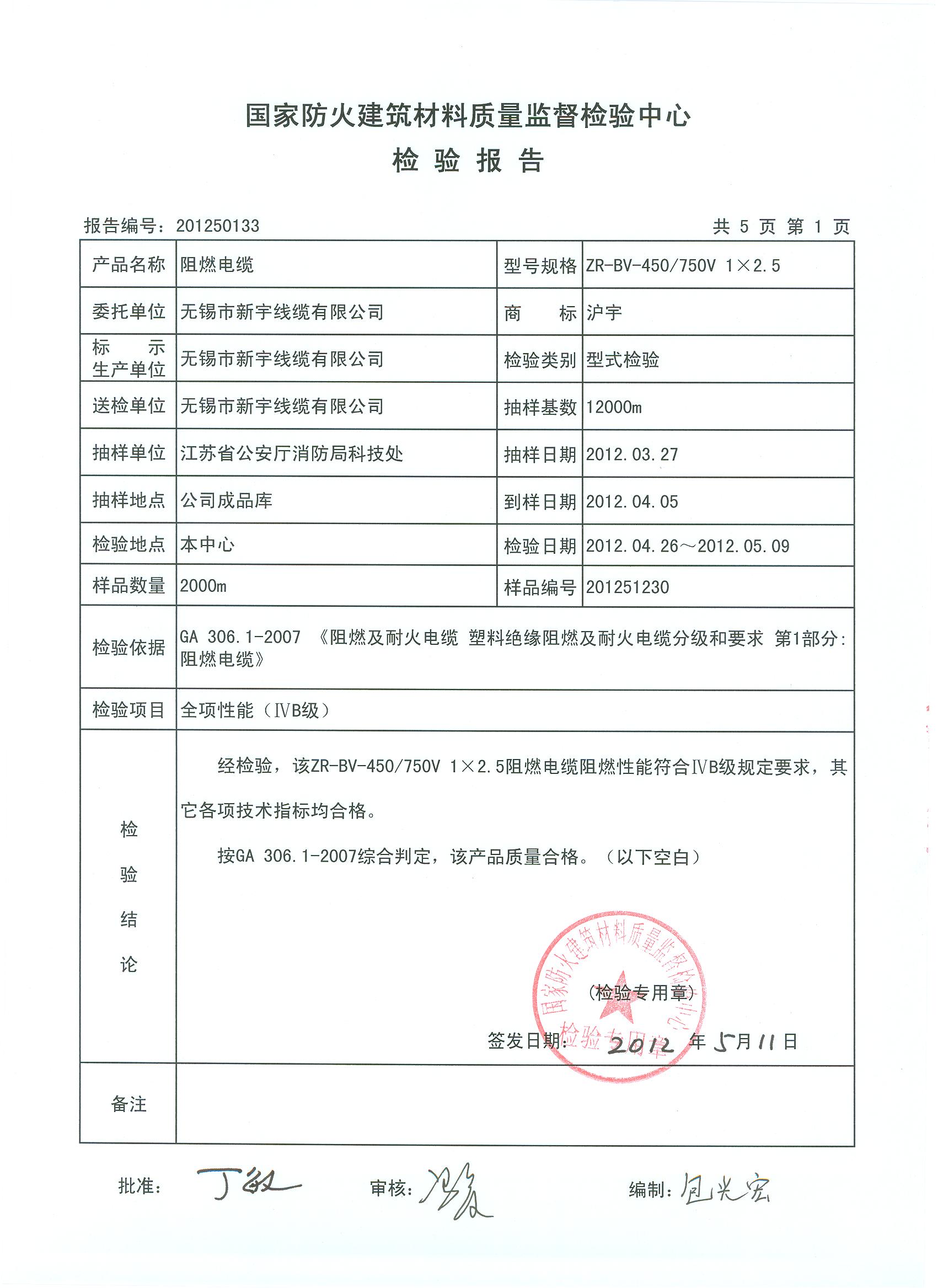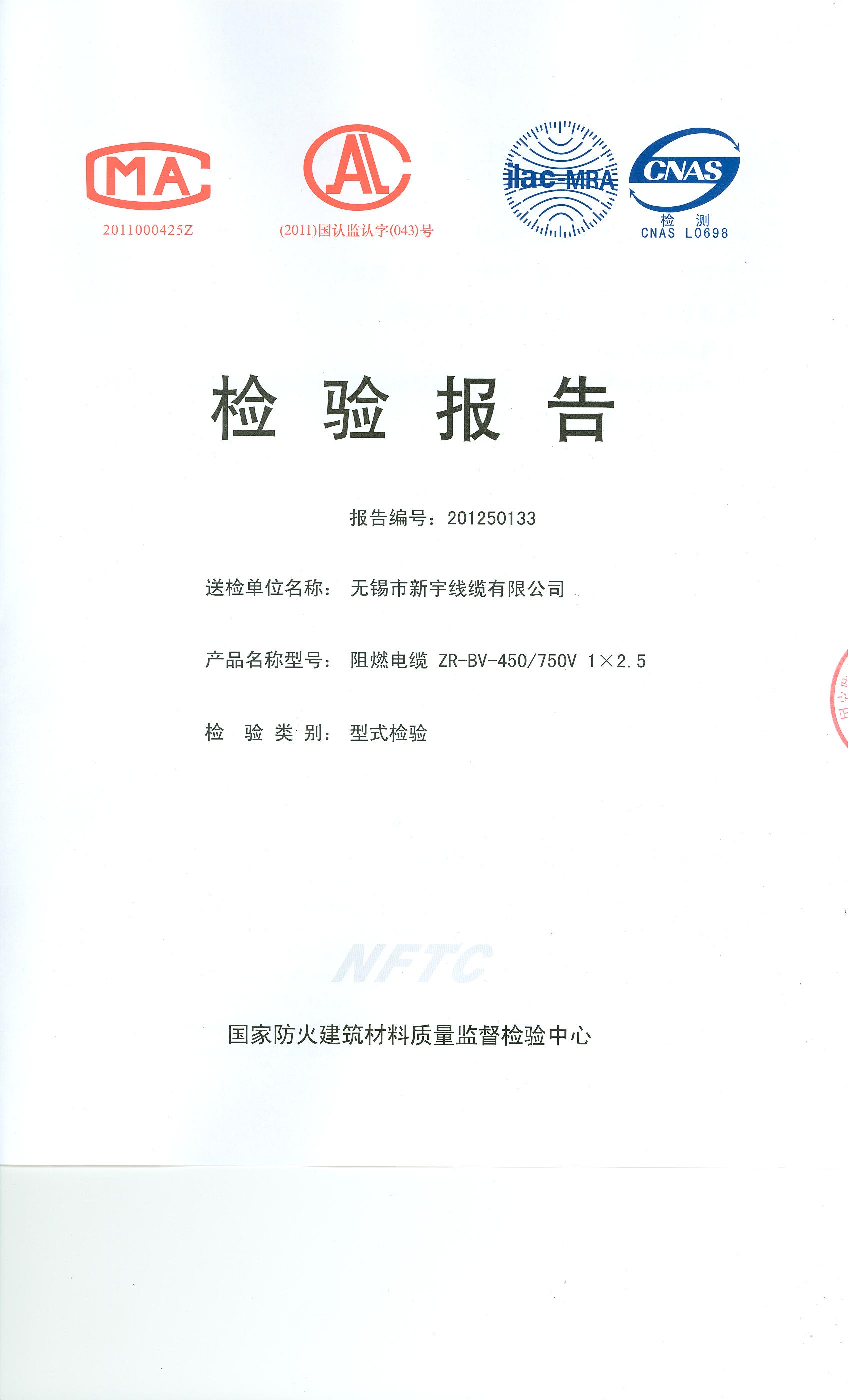 经检验,该ZR-BV-450/750V 1×2.5阻燃电缆阻燃性能符合ⅣB级规定要求,其它各项技术指标均合格。 按GA 306.1-2007综合判定,该产品质量合格。(以下空白)