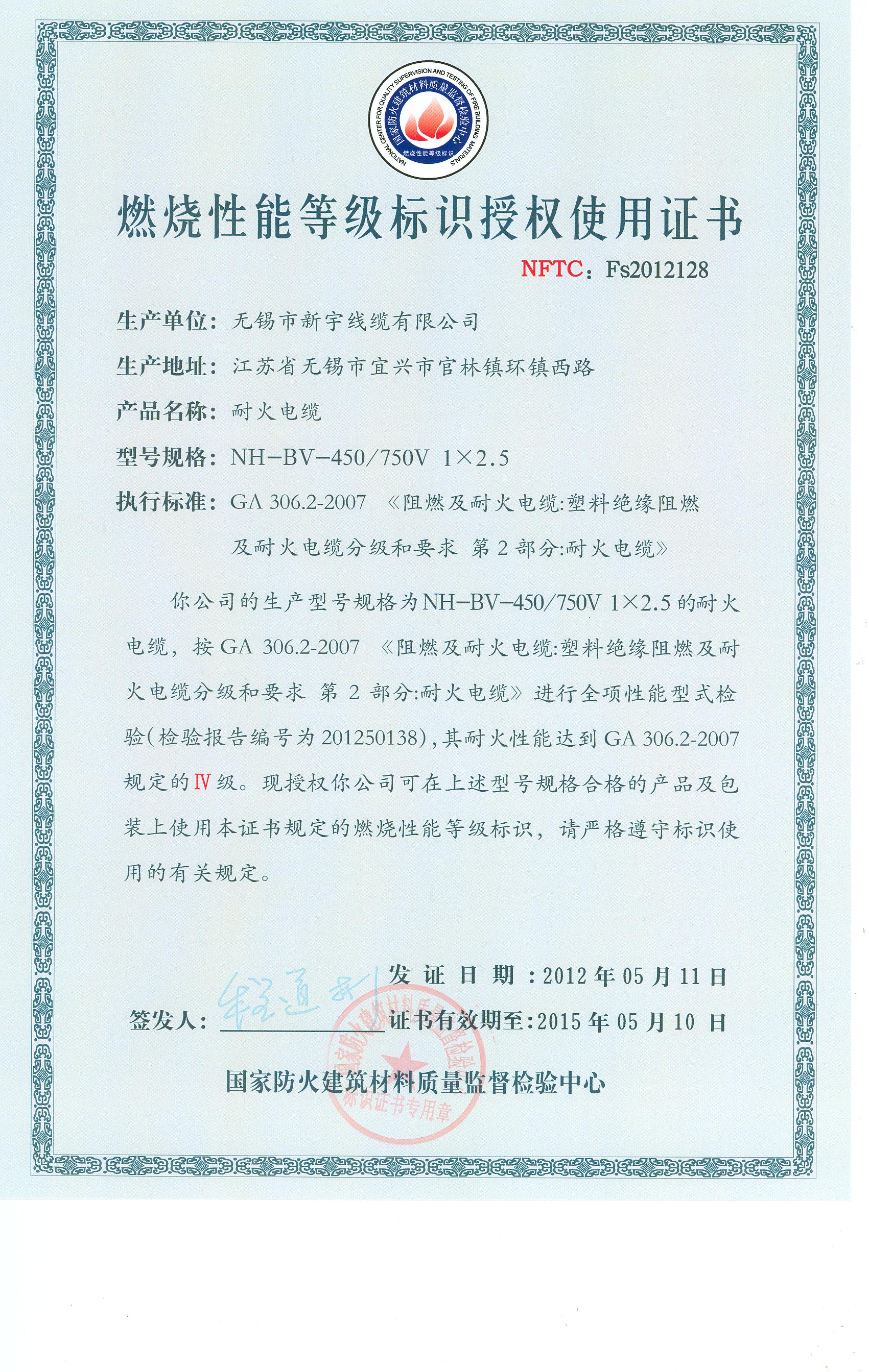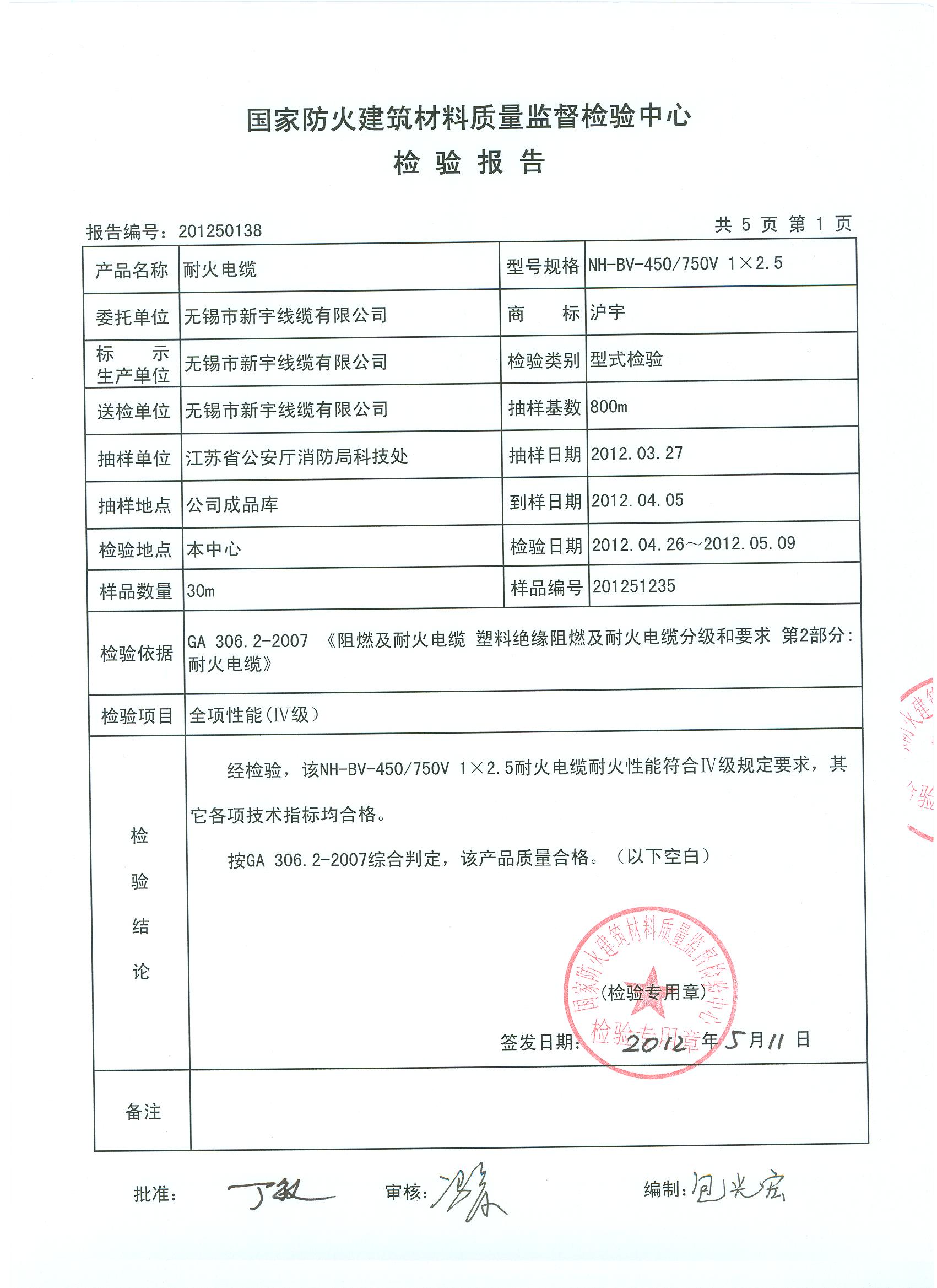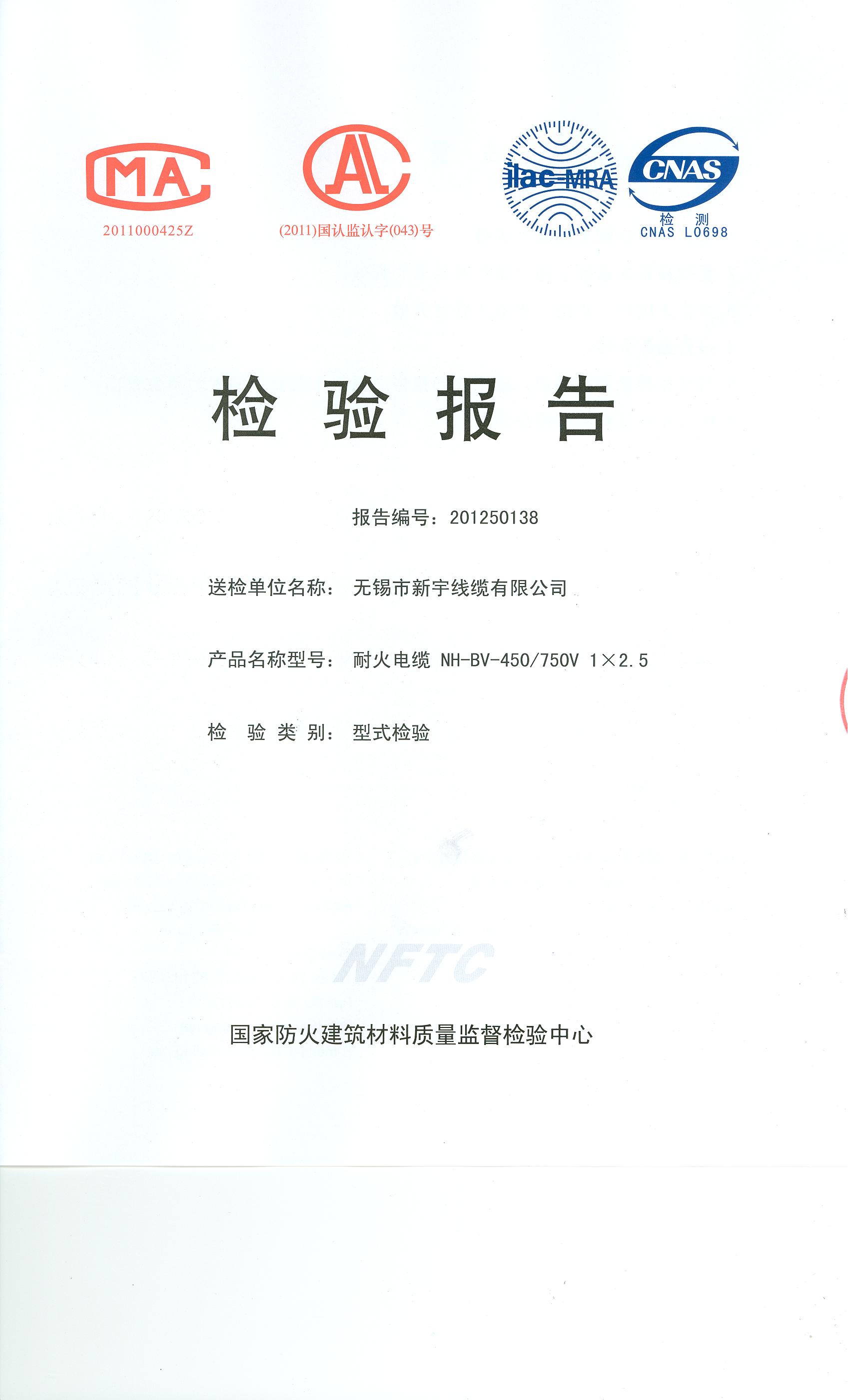 经检验,该NH-BV-450/750V 1×2.5耐火电缆耐火性能符合Ⅳ级规定要求,其它各项技术指标均合格。 按GA 306.2-2007综合判定,该产品质量合格。(以下空白)