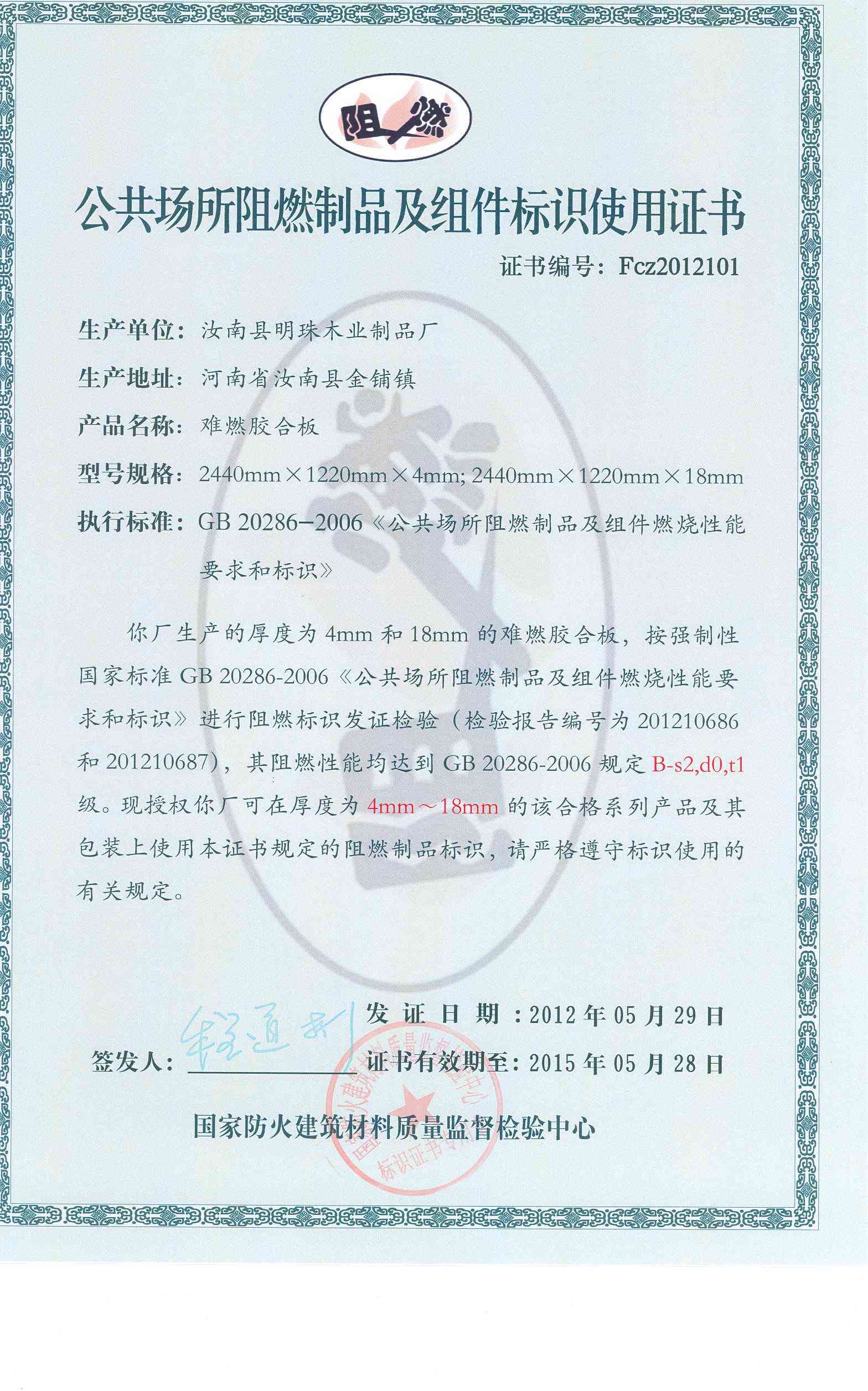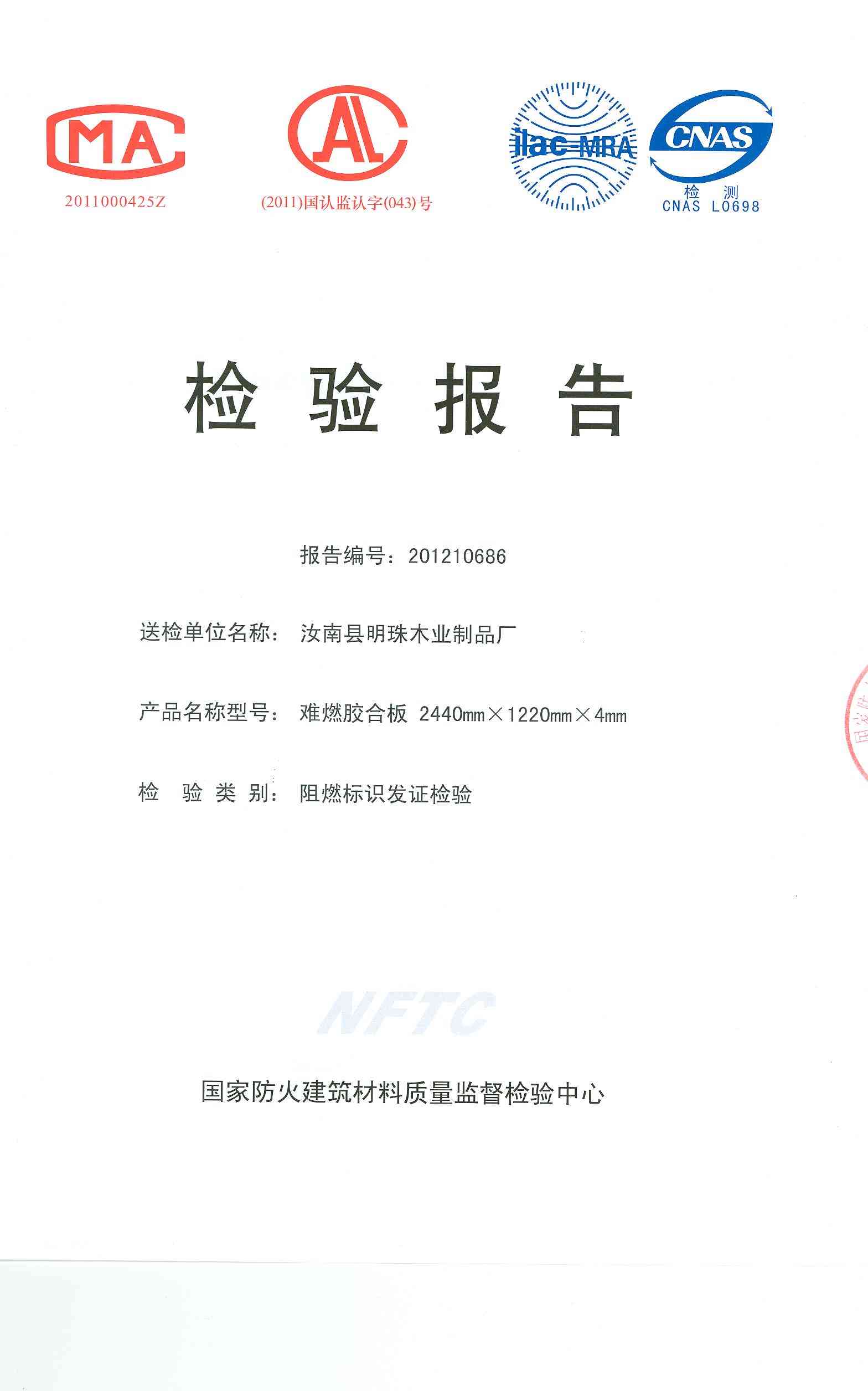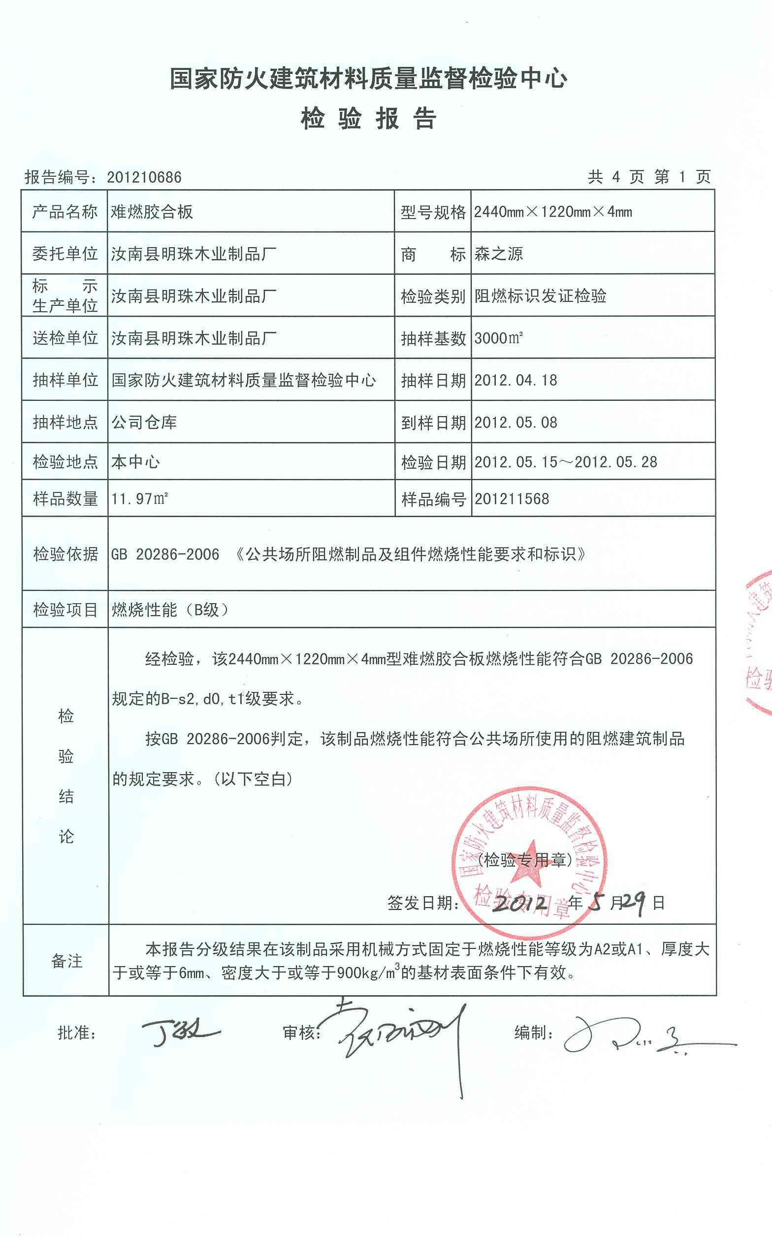 经检验,该2440mm×1220mm×4mm型难燃胶合板燃烧性能符合GB 20286-2006规定的B-s2,d0,t1级要求。 按GB 20286-2006判定,该制品燃烧性能符合公共场所使用的阻燃建筑制品的规定要求。(以下空白)
