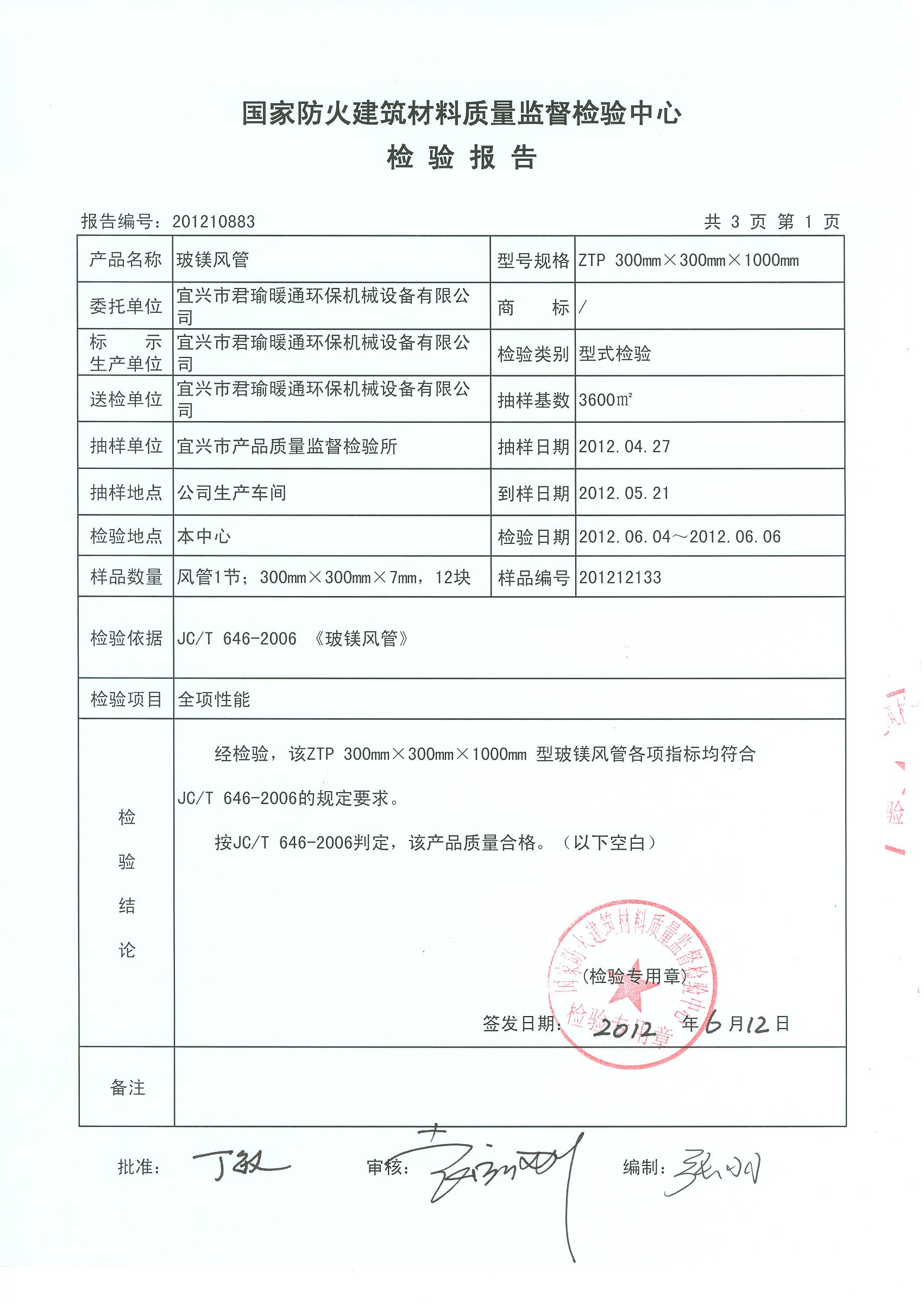 经检验,该ZTP 300mm×300mm×1000mm 型玻镁风管各项指标均符合JC/T 646-2006的规定要求。 按JC/T 646-2006判定,该产品质量合格。(以下空白)