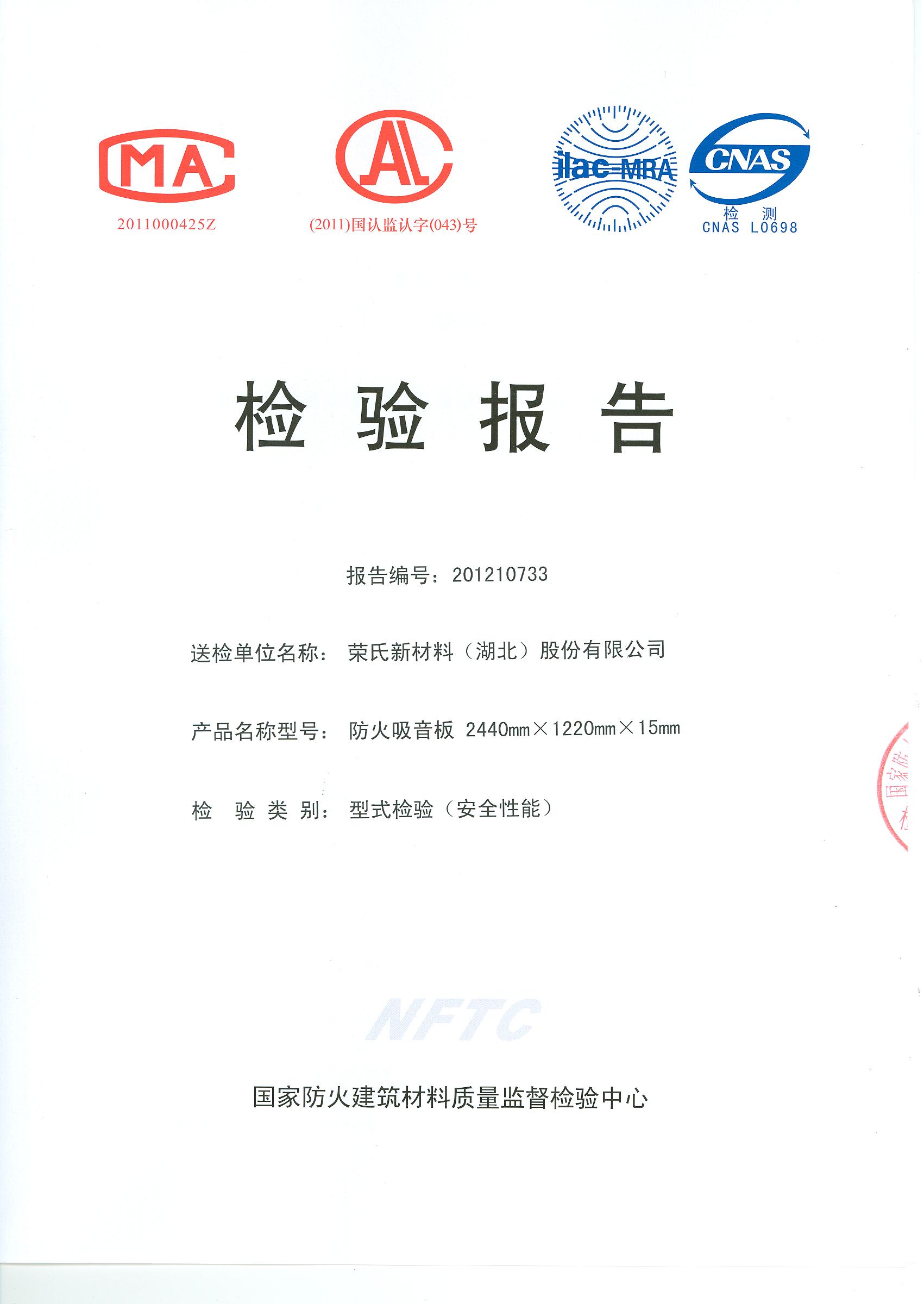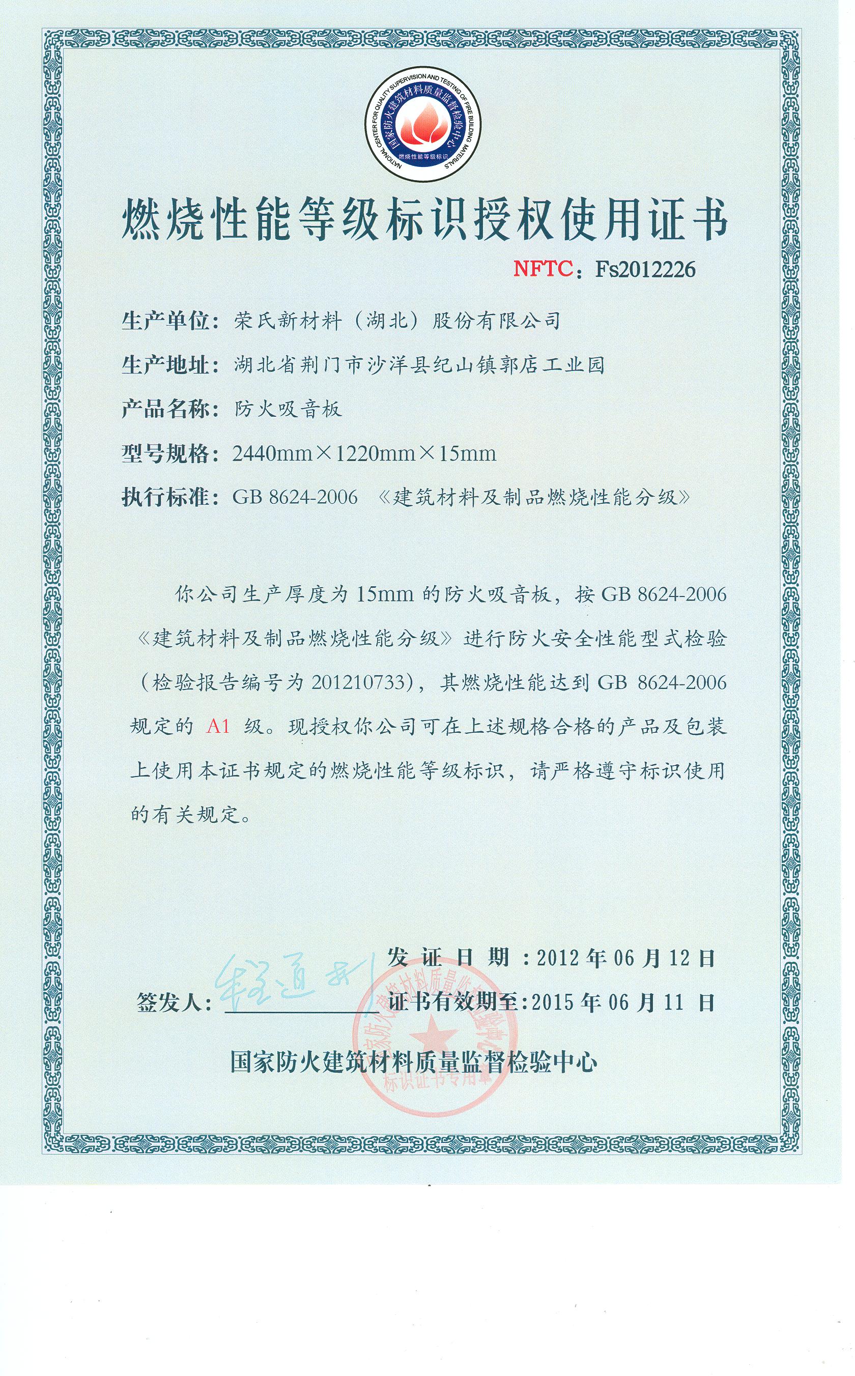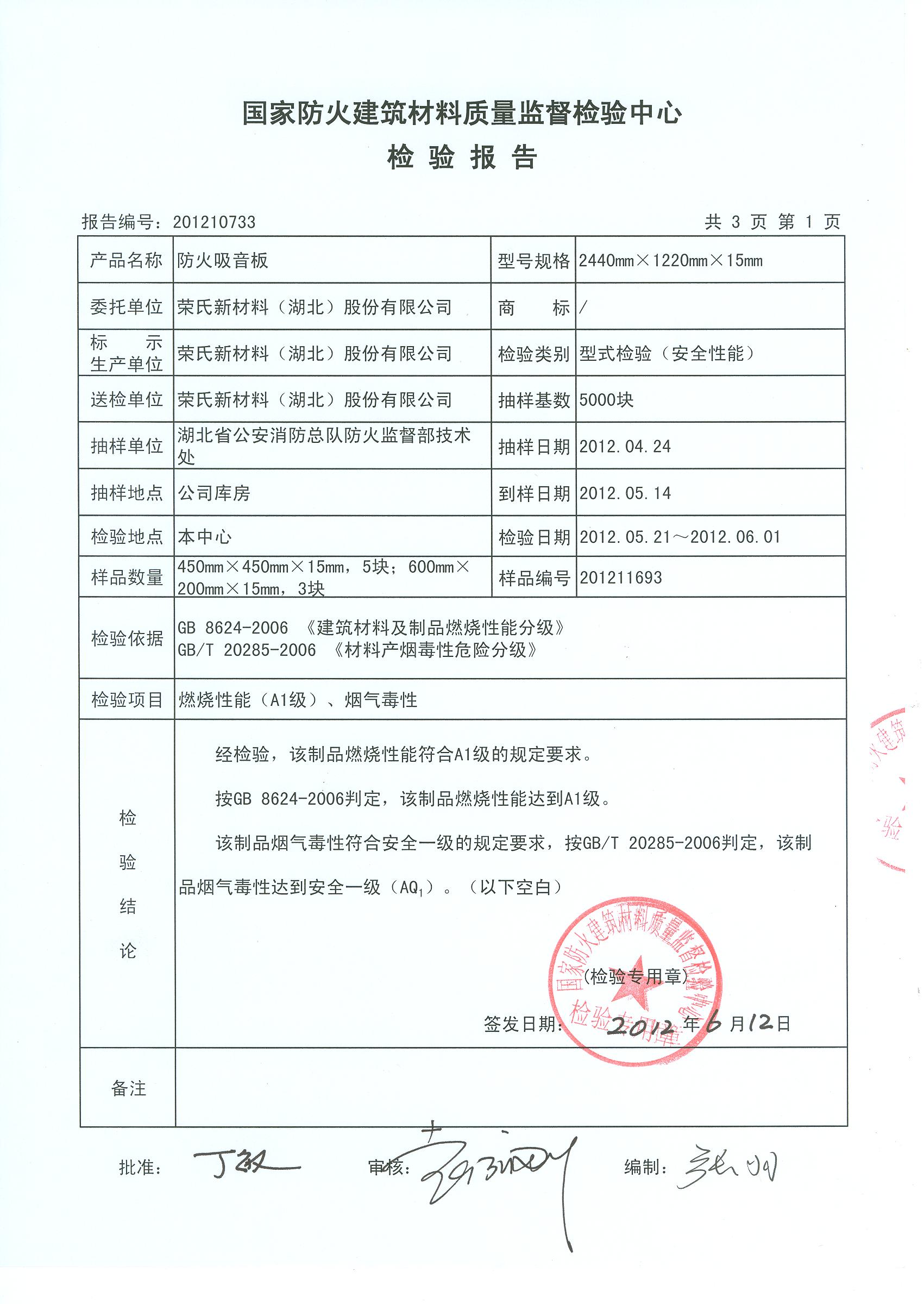 经检验,该制品燃烧性能符合A1级的规定要求。 按GB 8624-2006判定,该制品燃烧性能达到A1级。 该制品烟气毒性符合安全一级的规定要求,按GB/T 20285-2006判定,该制品烟气毒性达到安全一级(AQ1)。(以下空白)