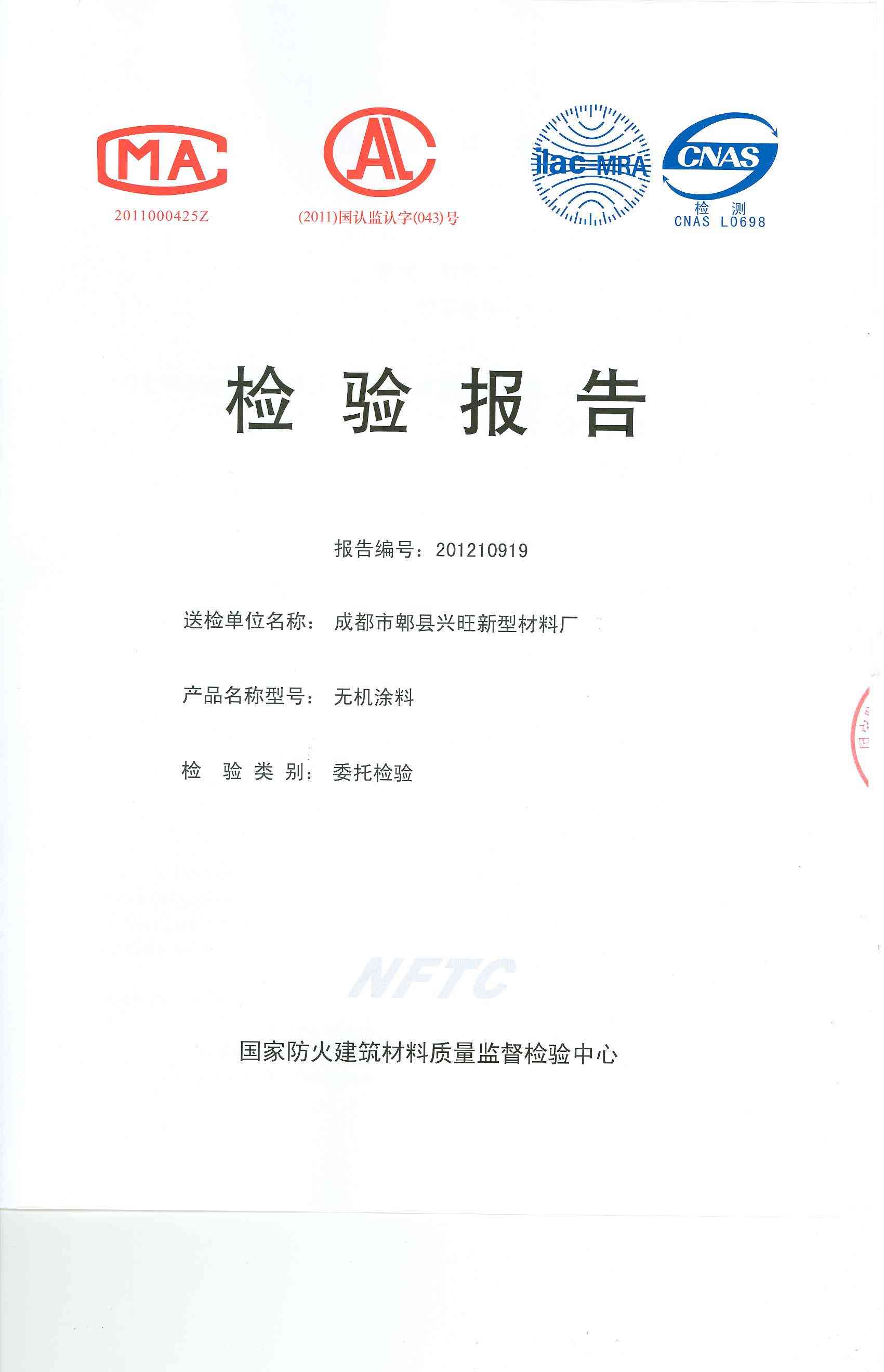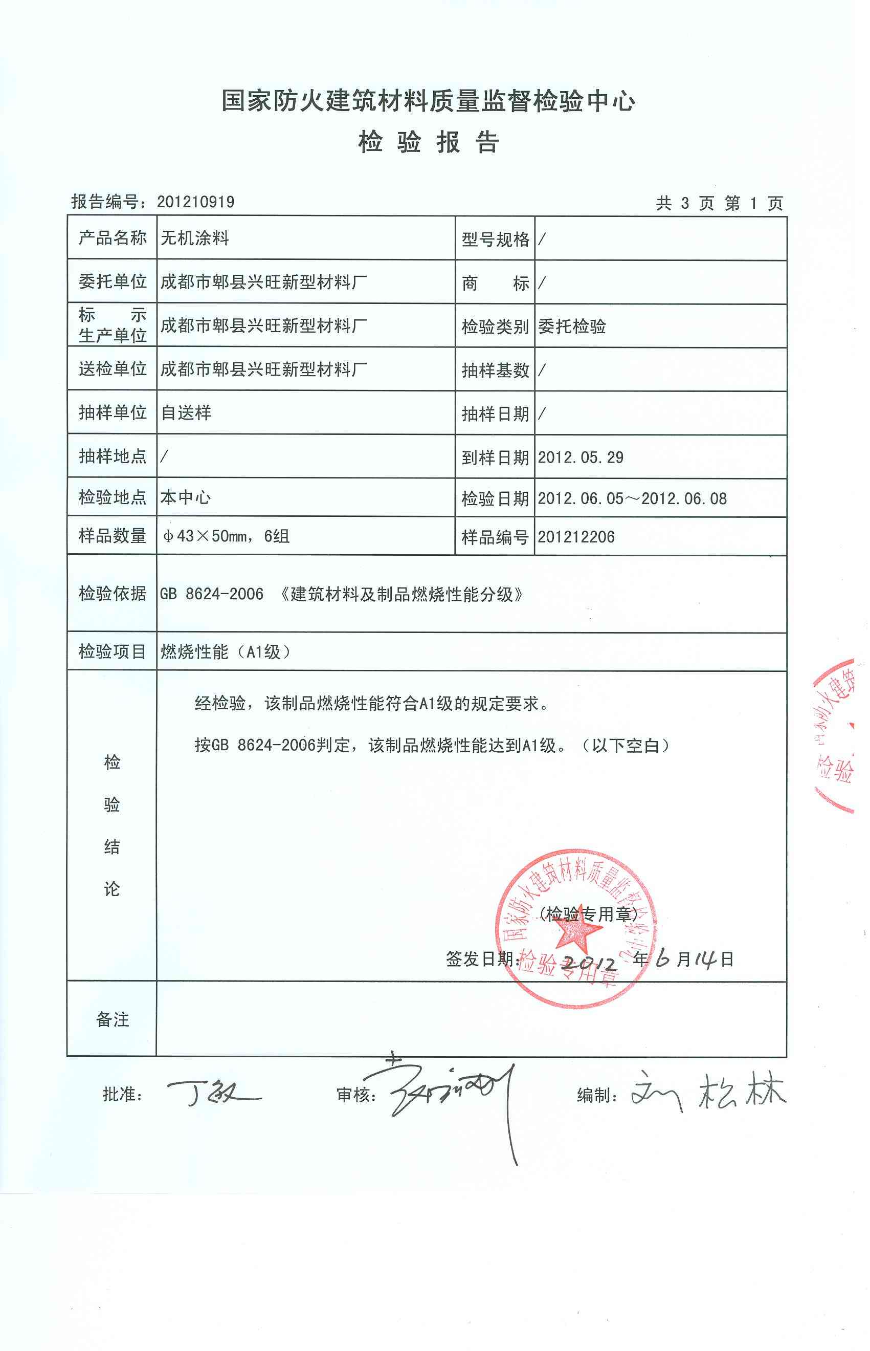 经检验,该制品燃烧性能符合A1级的规定要求。 按GB 8624-2006判定,该制品燃烧性能达到A1级。(以下空白)