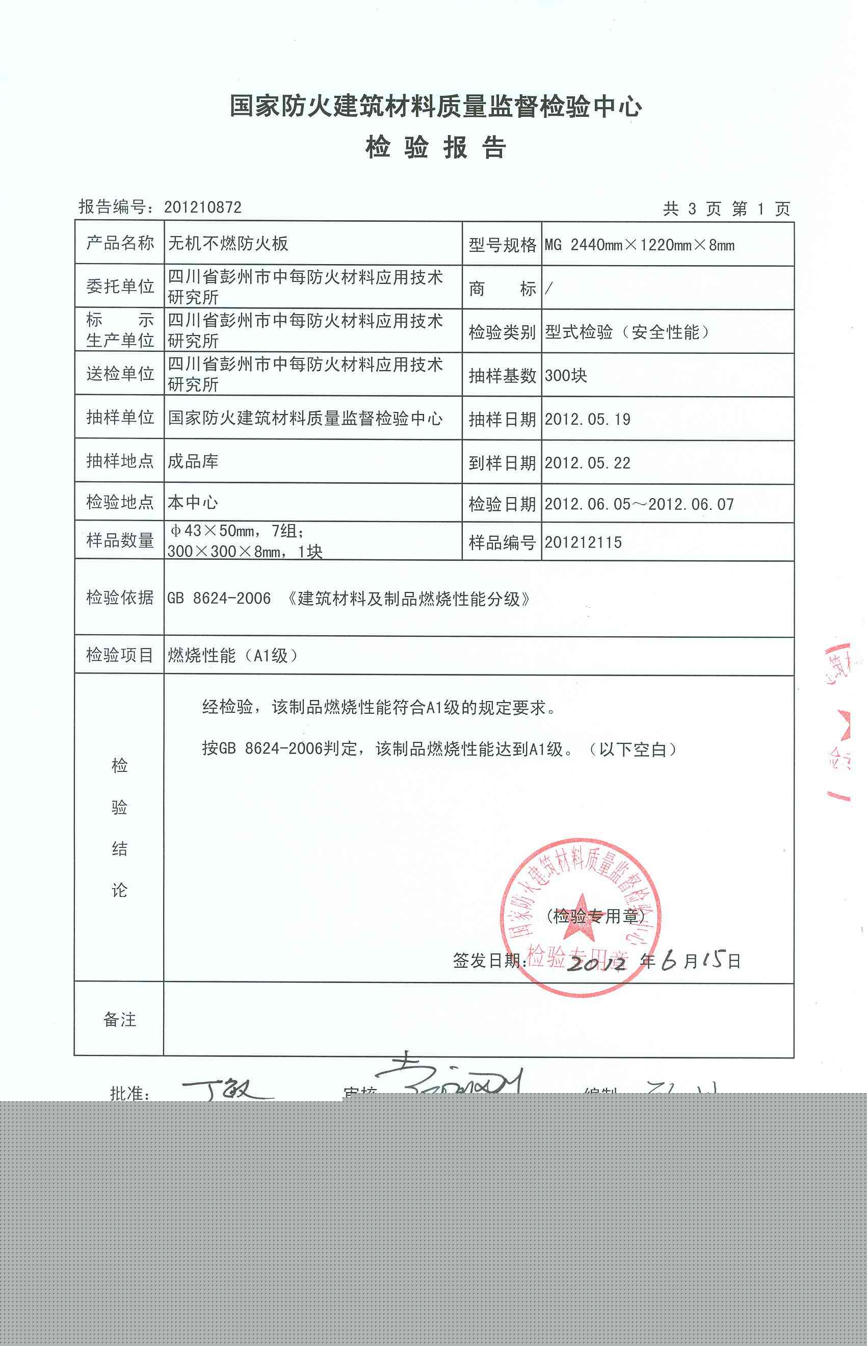 经检验,该制品燃烧性能符合A1级的规定要求。 按GB 8624-2006判定,该制品燃烧性能达到A1级。(以下空白)