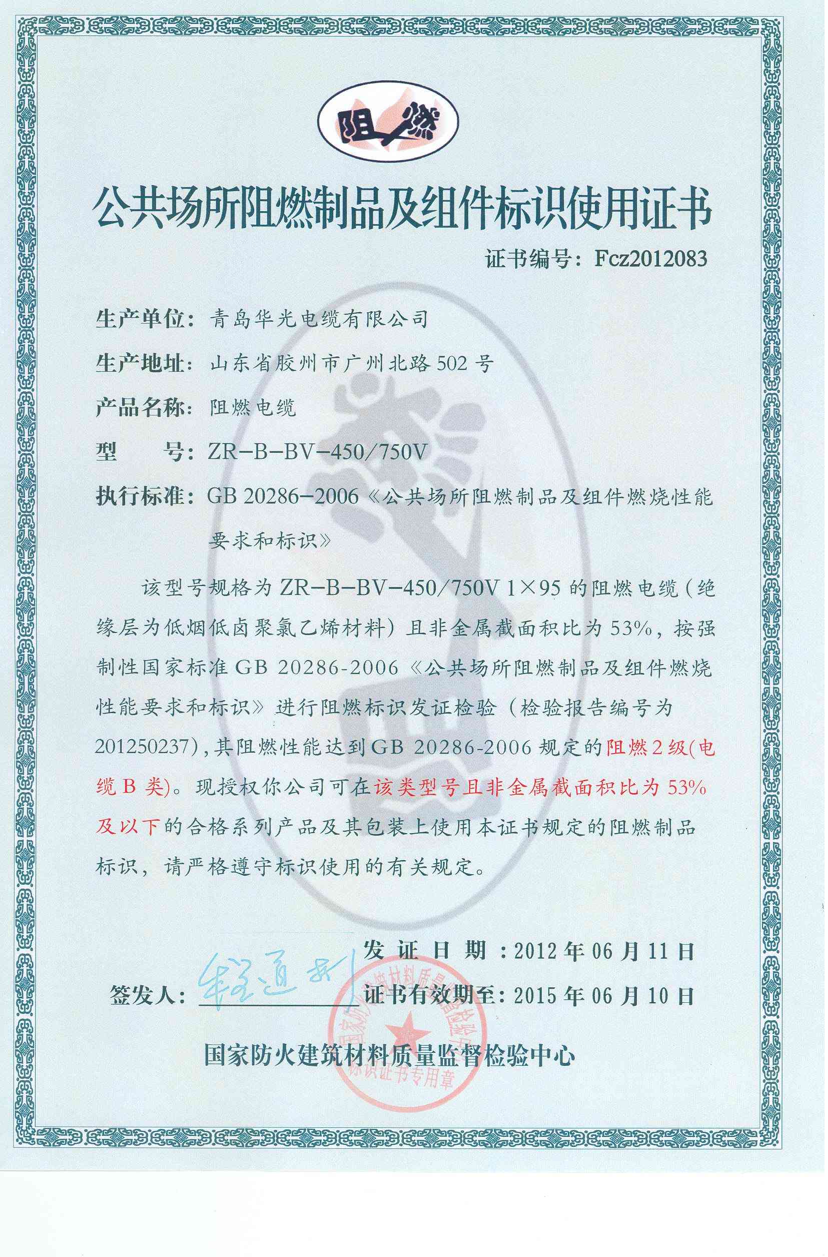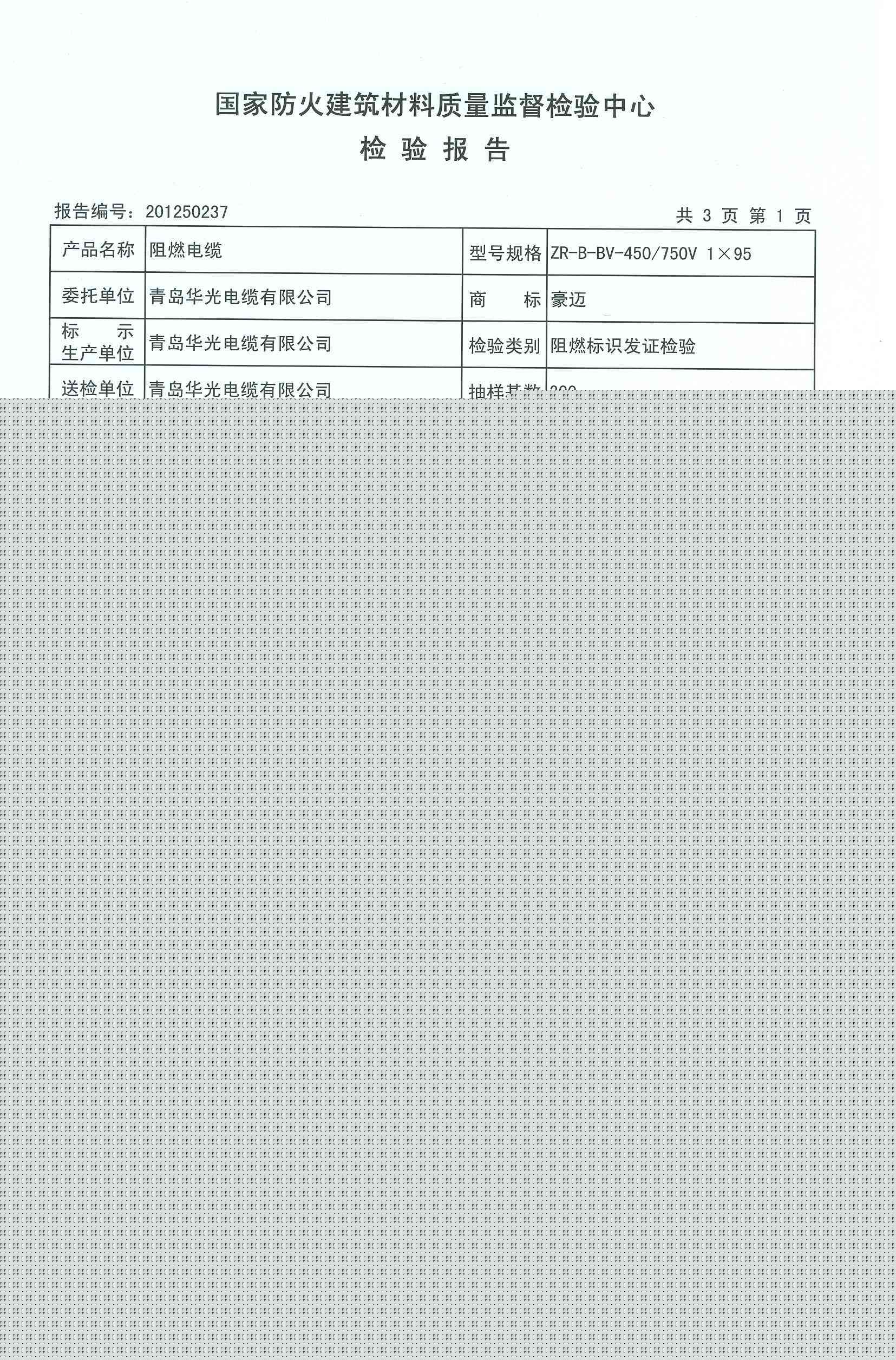 经检验,该ZR-B-BV-450/750V 1×95阻燃电缆符合标准规定的阻燃2级(电缆B类) 要求。 按GB 20286-2006判定,该产品阻燃2级(电缆B类)合格。(以下空白)