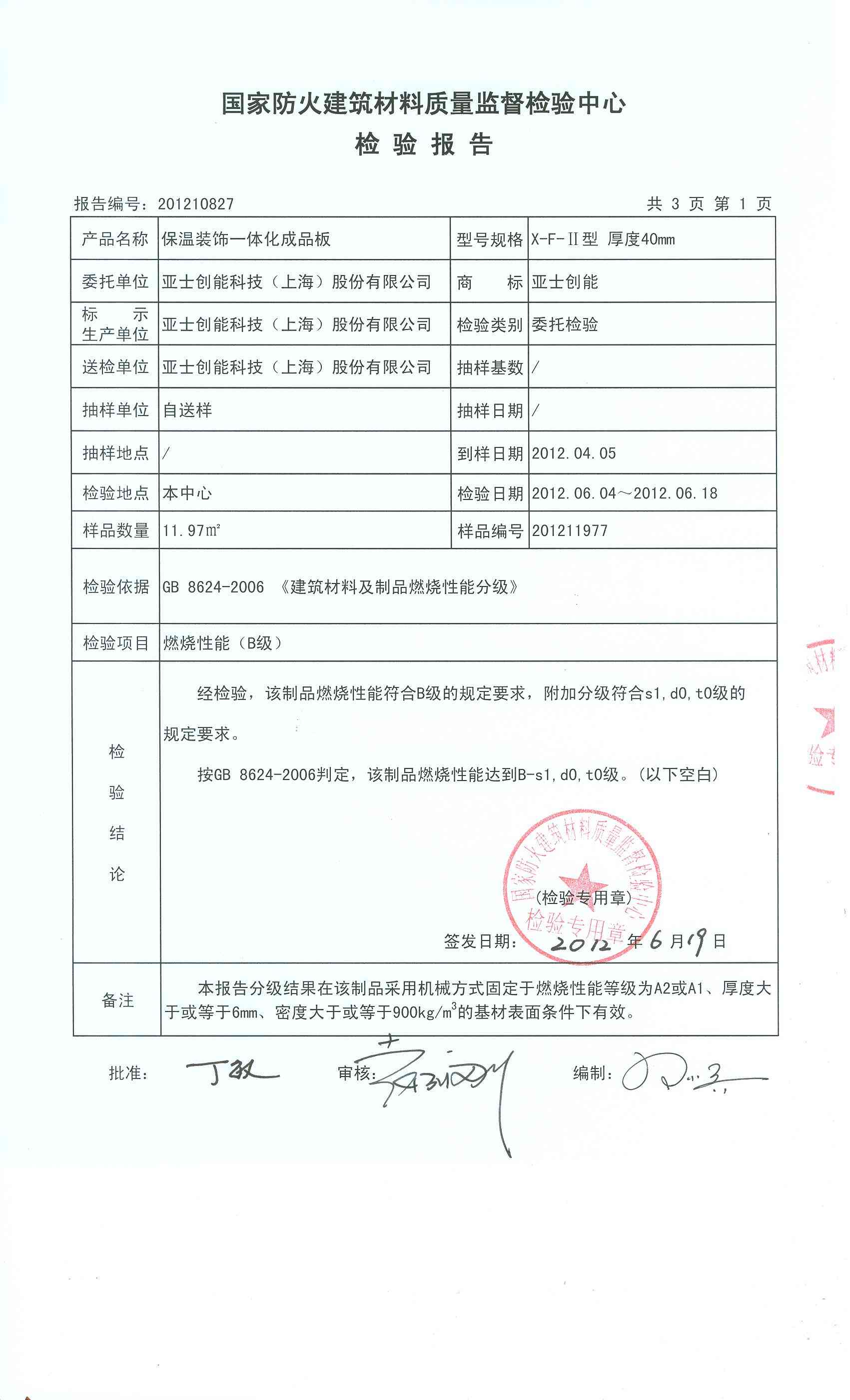 经检验,该制品燃烧性能符合B级的规定要求,附加分级符合s1,d0,t0级的 规定要求。 按GB 8624-2006判定,该制品燃烧性能达到B-s1,d0,t0级。(以下空白)