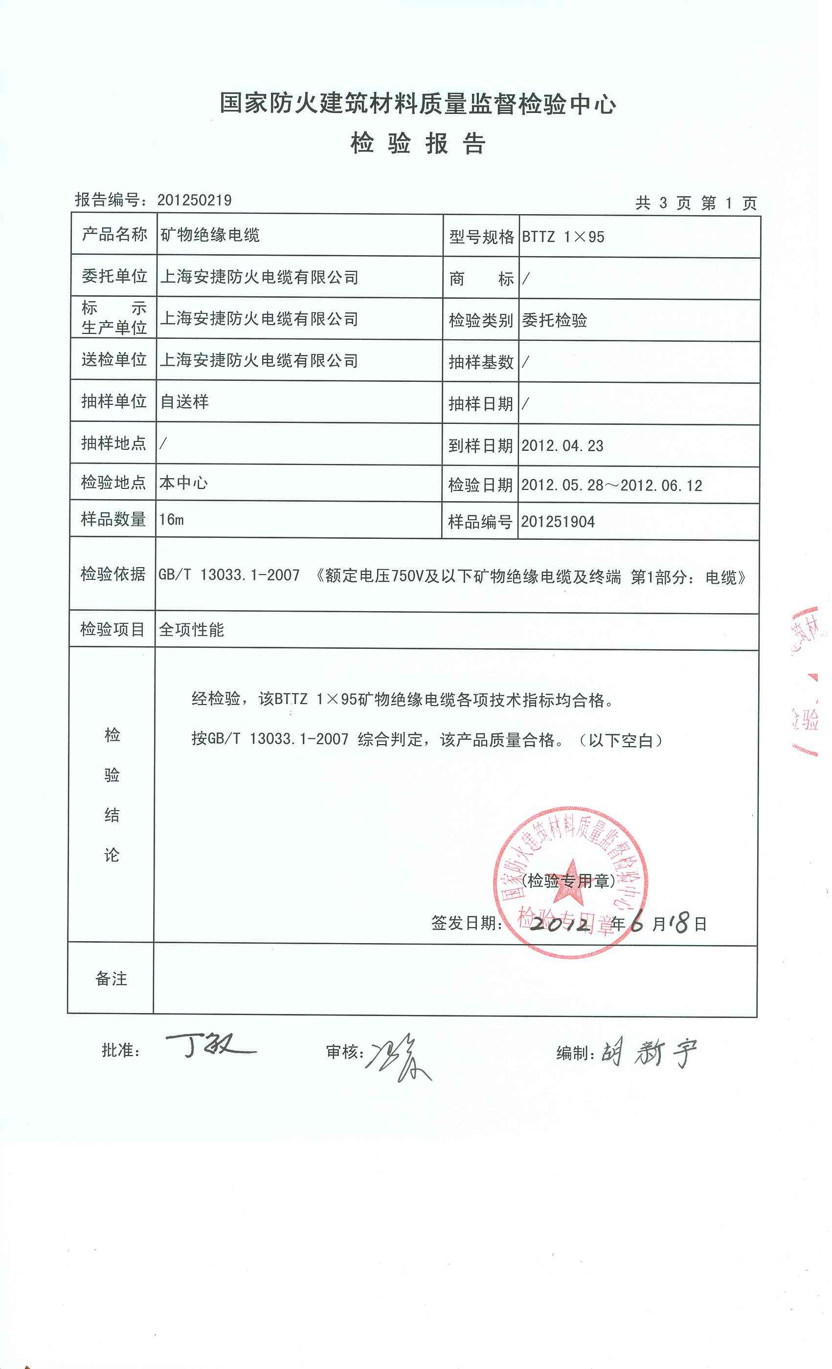 经检验,该BTTZ 1×95矿物绝缘电缆各项技术指标均合格。 按GB/T 13033.1-2007 综合判定,该产品质量合格。(以下空白)