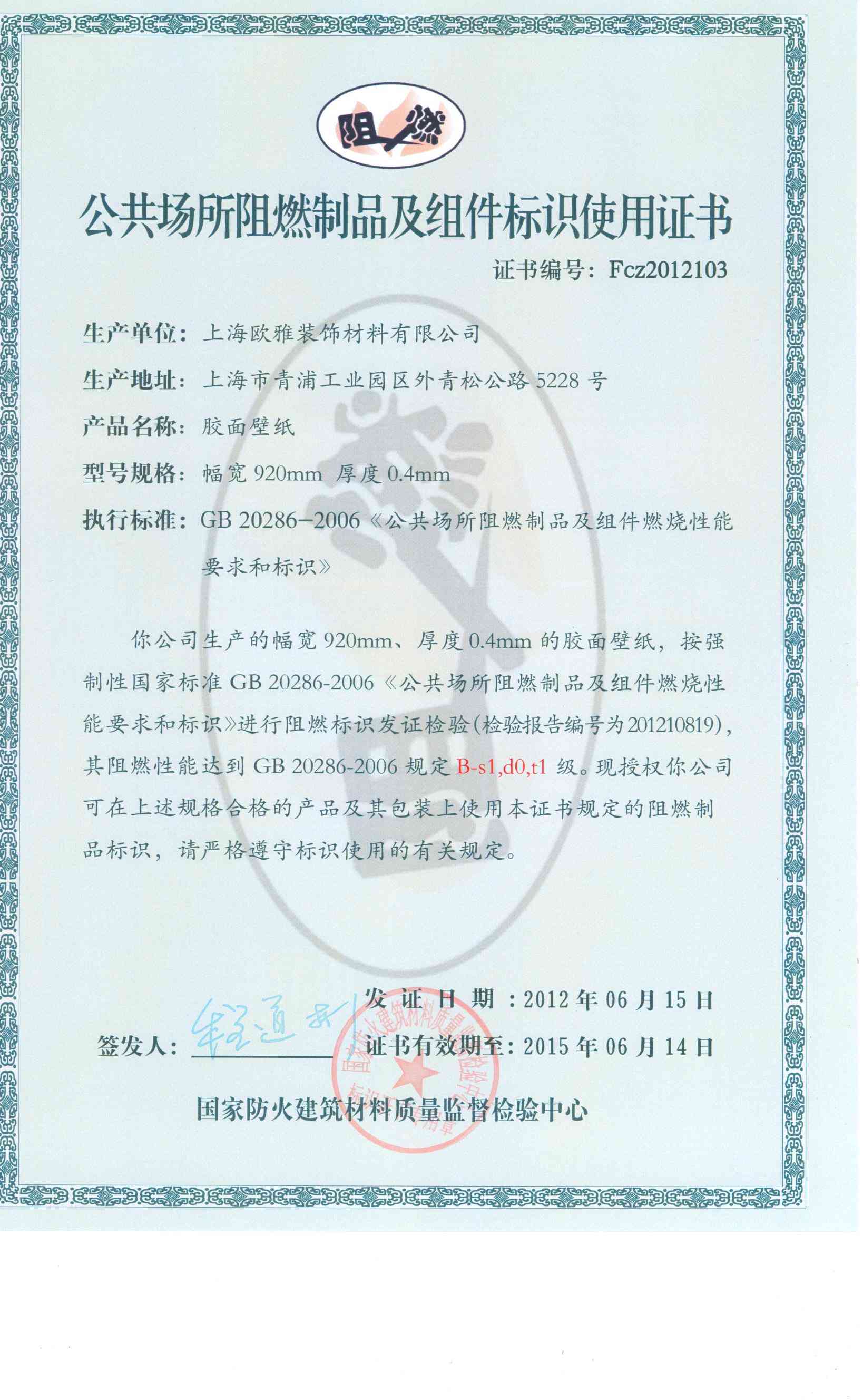 经检验,该幅宽920mm 厚度0.4mm的胶面壁纸燃烧性能符合GB 20286-2006规定的B-s1,d0,t1级要求。 按GB 20286-2006判定,该制品燃烧性能符合公共场所使用的阻燃建筑制品的规定要求。(以下空白)