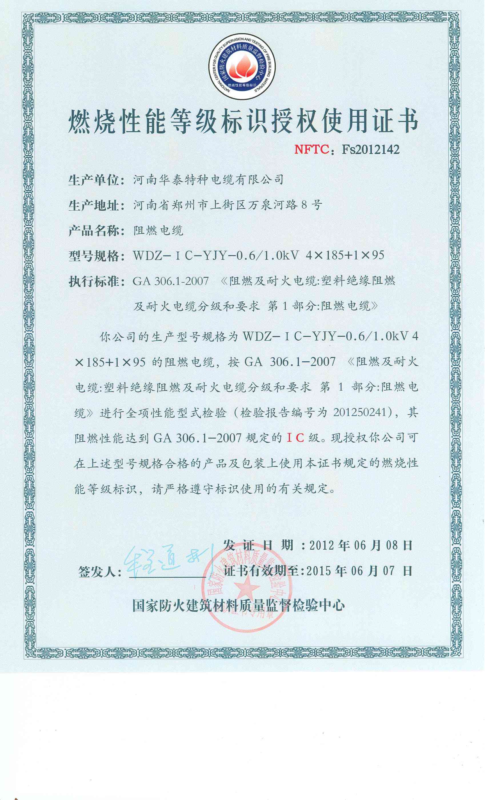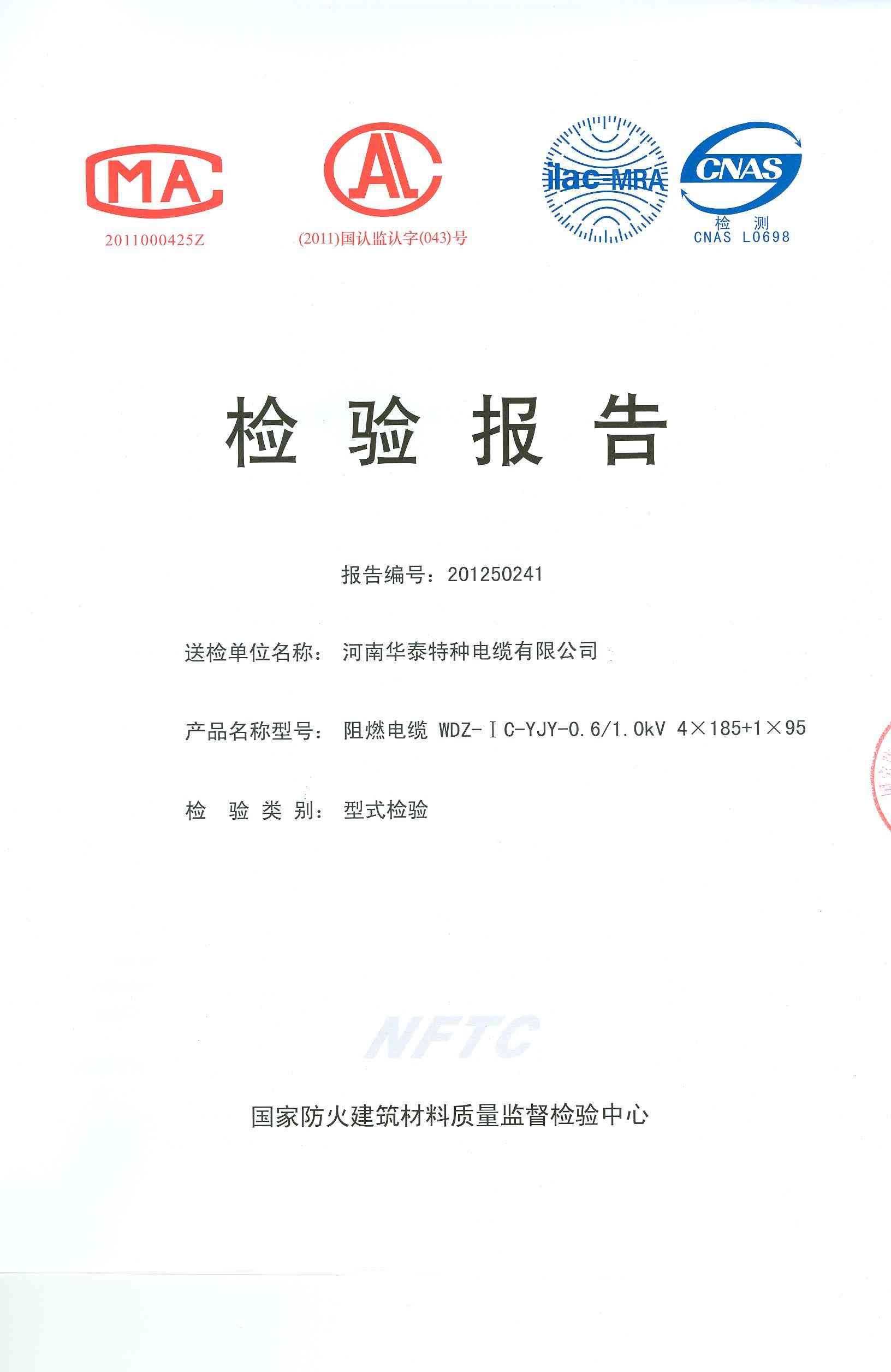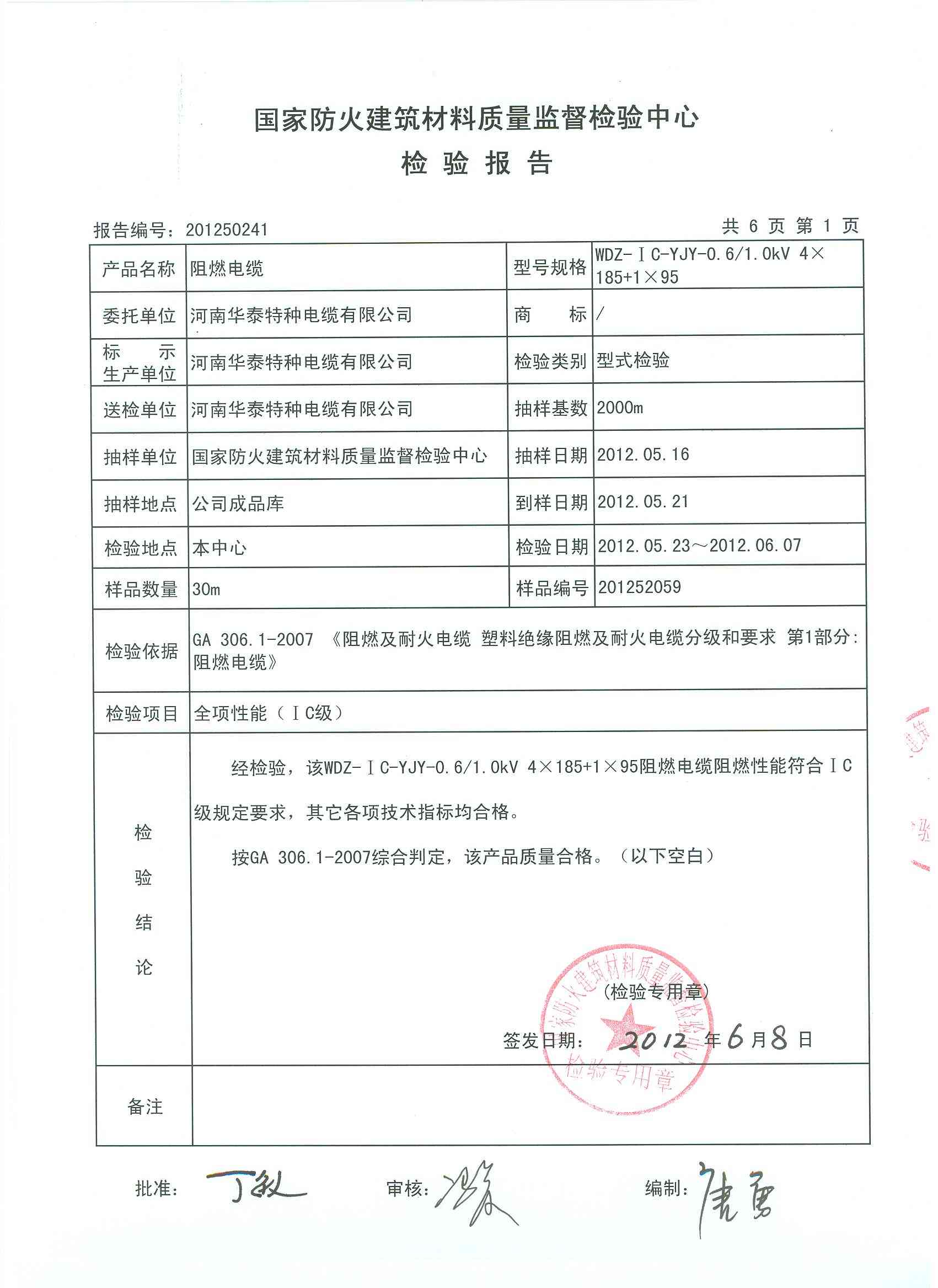 经检验,该WDZ-ⅠC-YJY-0.6/1.0kV 4×185+1×95阻燃电缆阻燃性能符合ⅠC级规定要求,其它各项技术指标均合格。 按GA 306.1-2007综合判定,该产品质量合格。(以下空白)