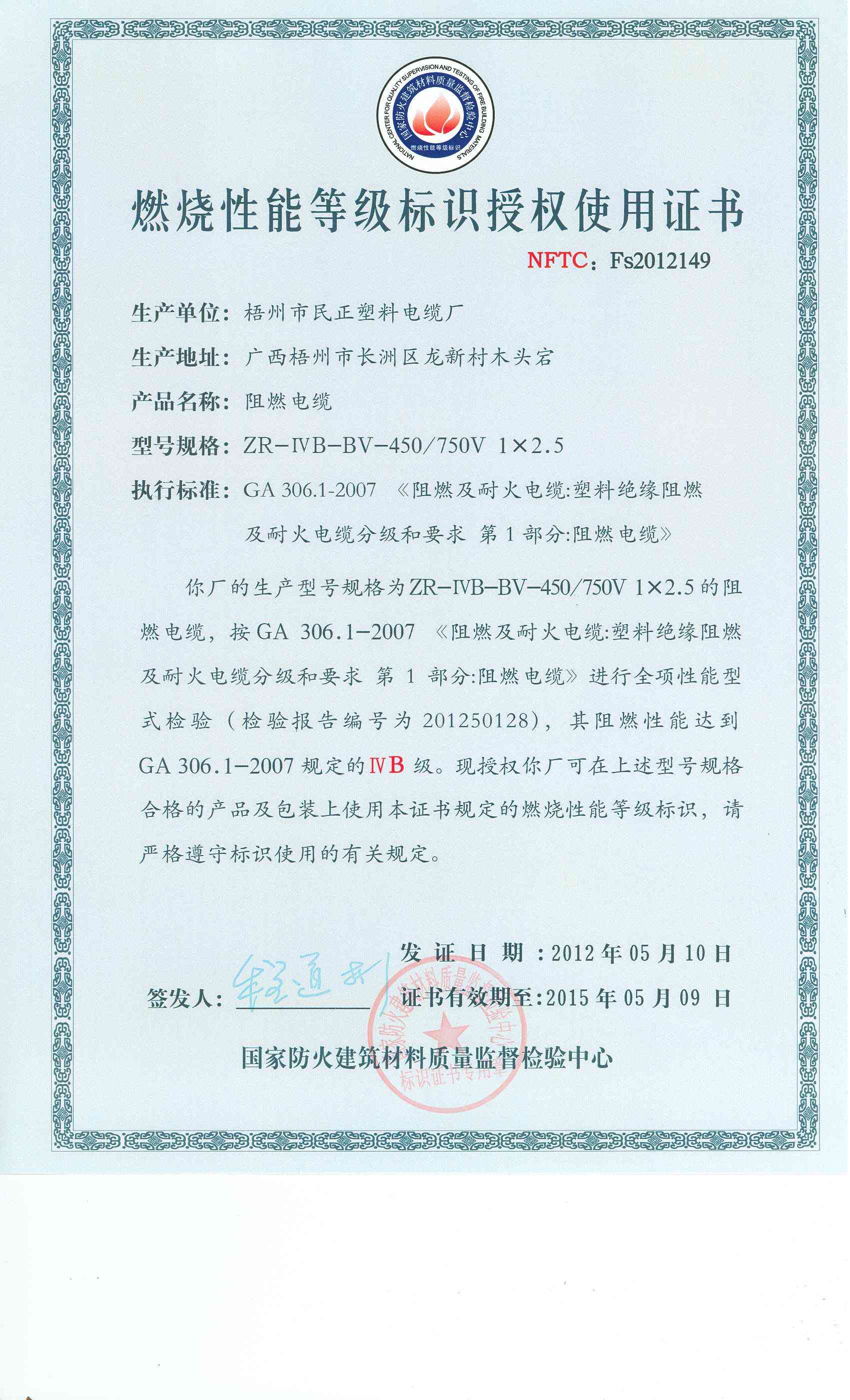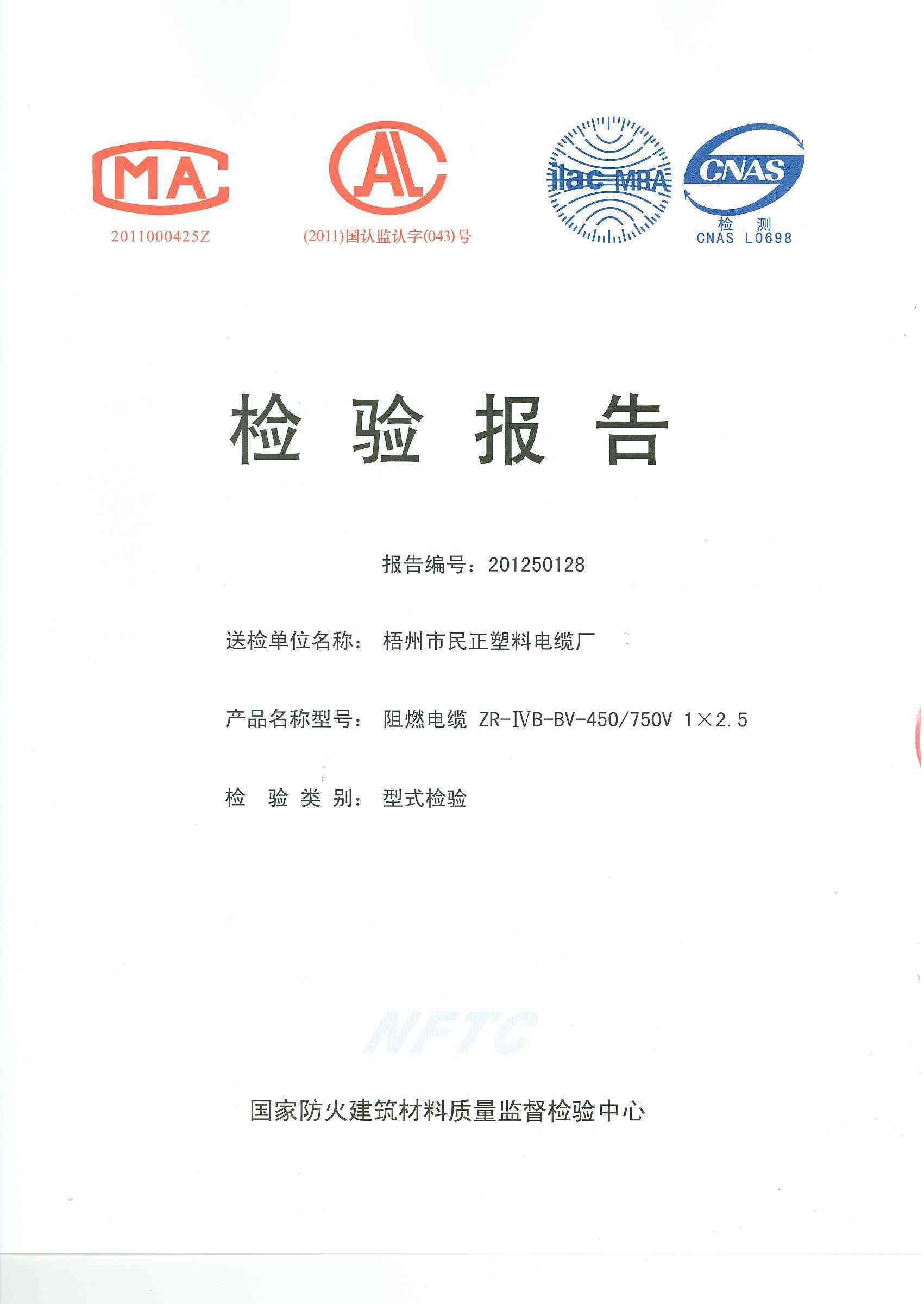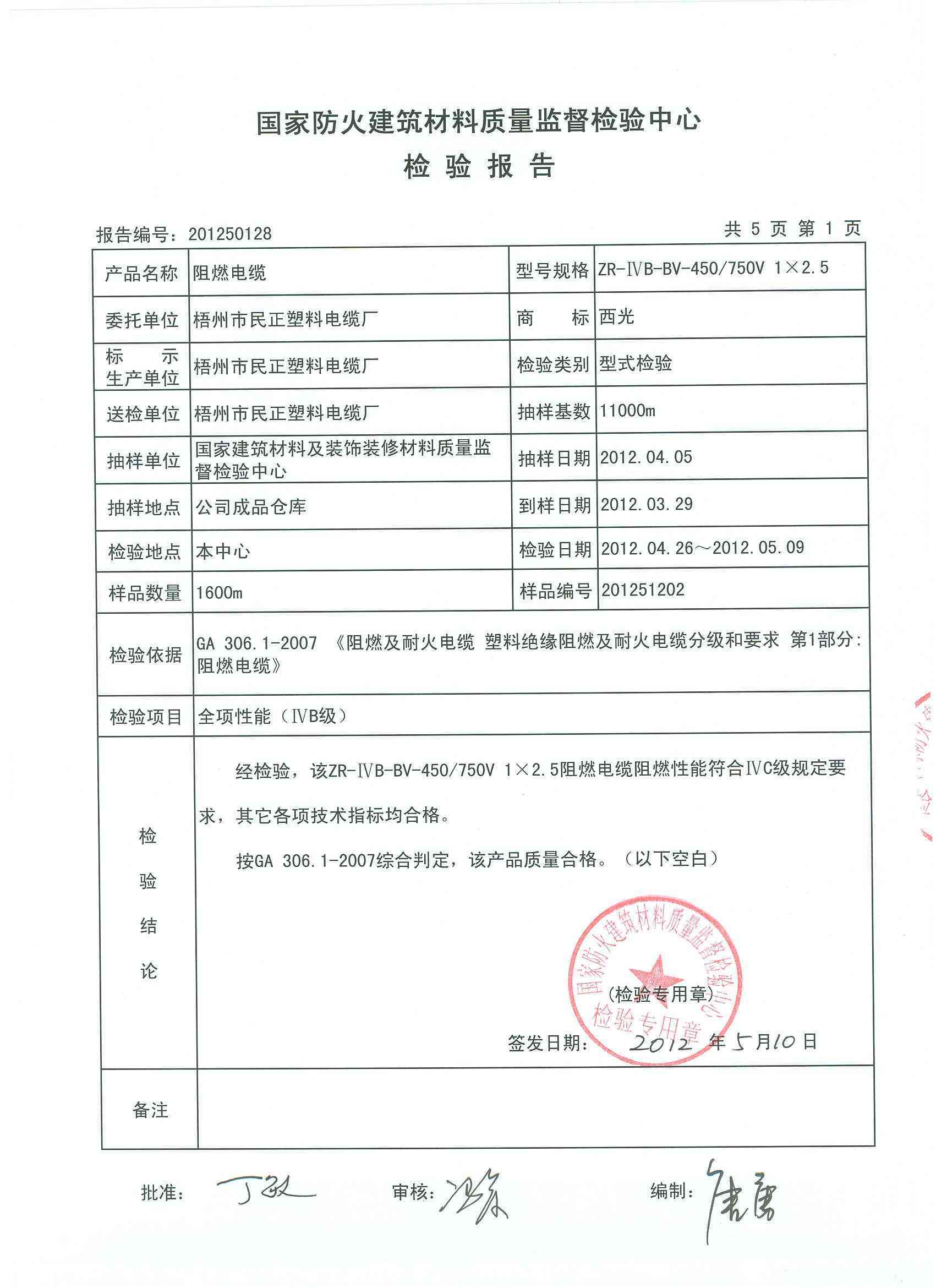 经检验,该ZR-ⅣB-BV-450/750V 1×2.5阻燃电缆阻燃性能符合ⅣB级规定要求,其它各项技术指标均合格。 按GA 306.1-2007综合判定,该产品质量合格。(以下空白)