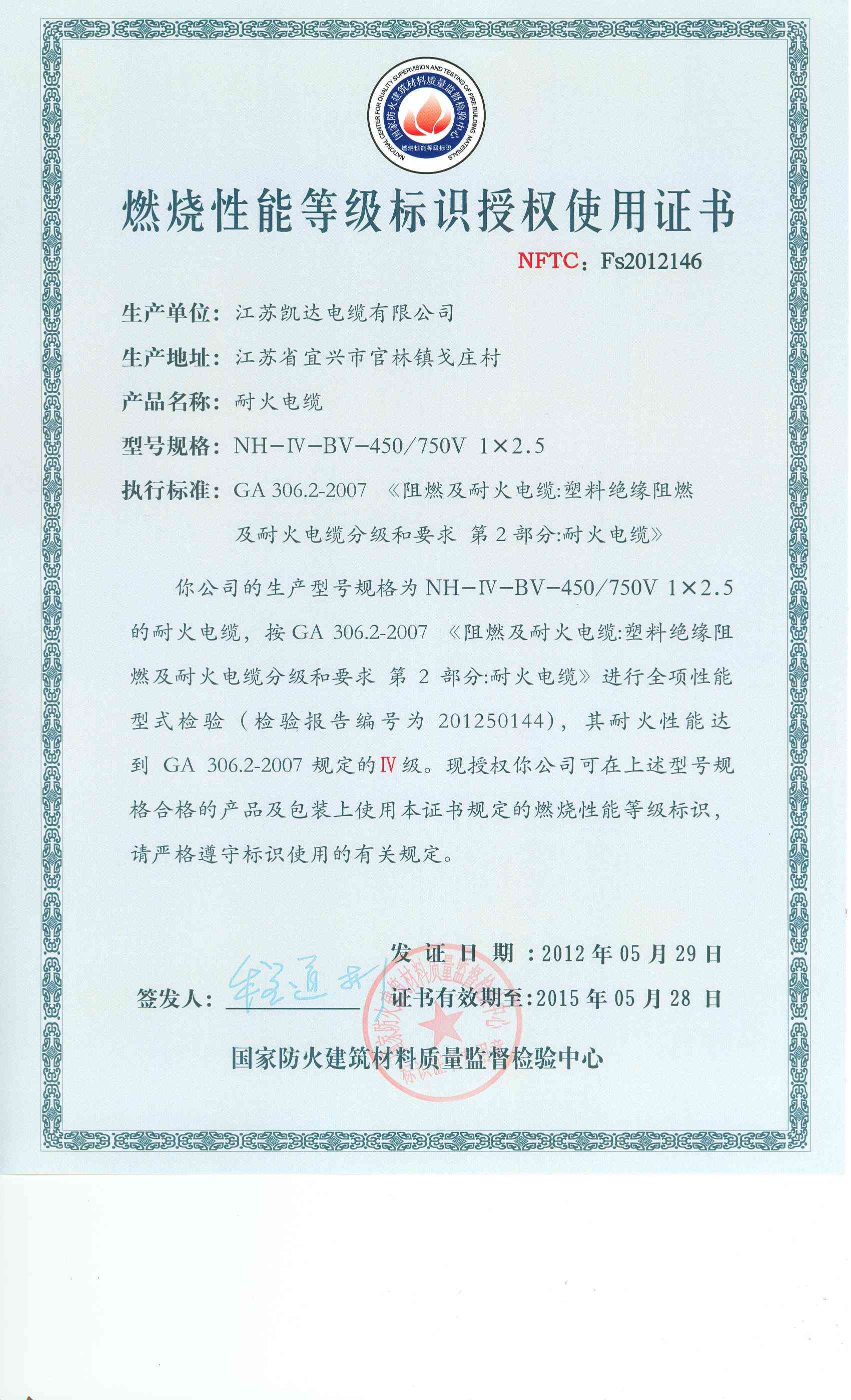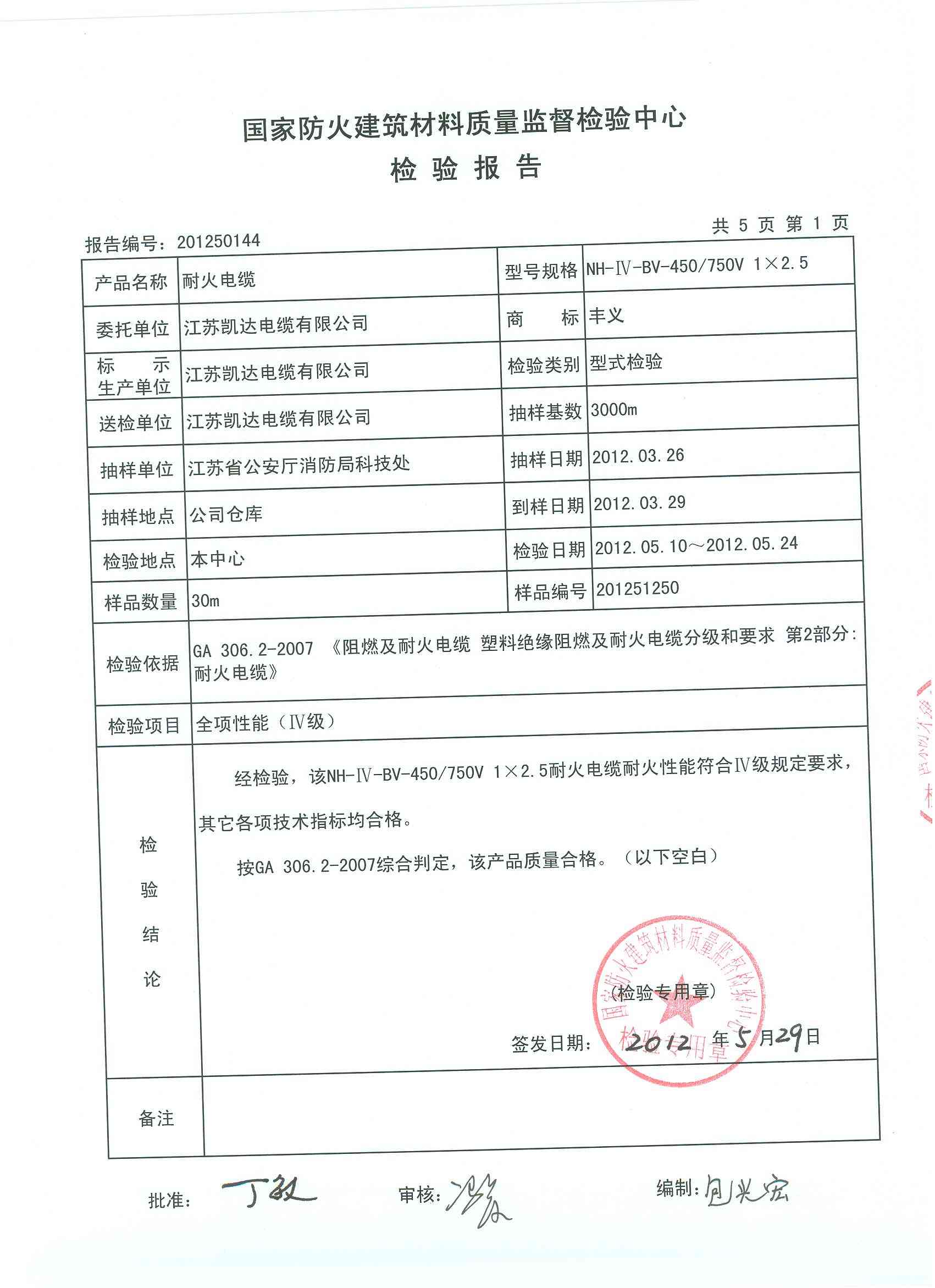 经检验,该NH-Ⅳ-BV-450/750V 1×2.5耐火电缆耐火性能符合Ⅳ级规定要求,其它各项技术指标均合格。 按GA 306.2-2007综合判定,该产品质量合格。(以下空白)
