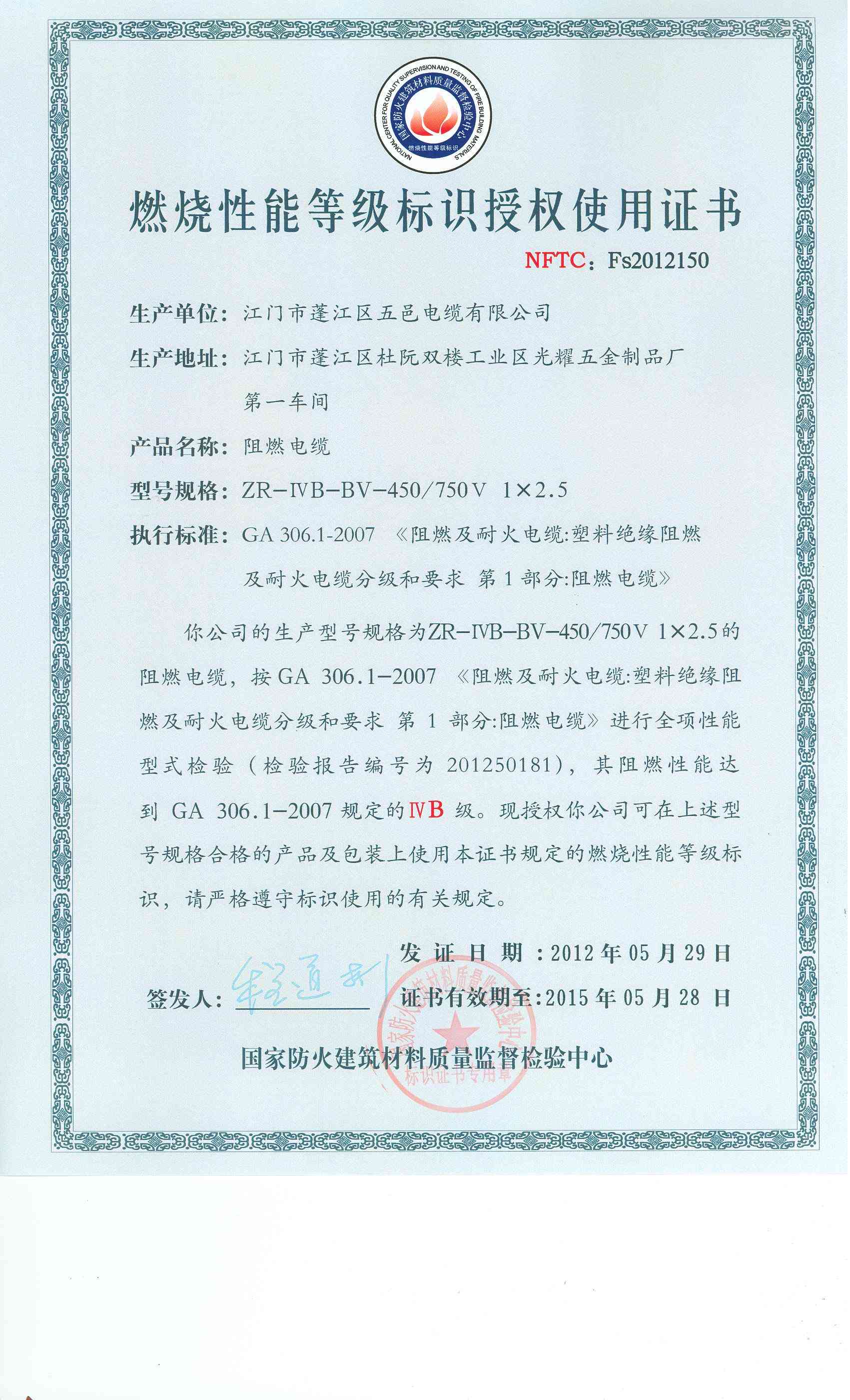 经检验,该ZR-ⅣB-BV-450/750V 1×2.5阻燃电缆阻燃性能符合ⅣB级规定要求,其它各项技术指标均合格。 按GA 306.1-2007综合判定,该产品质量合格。(以下空白)