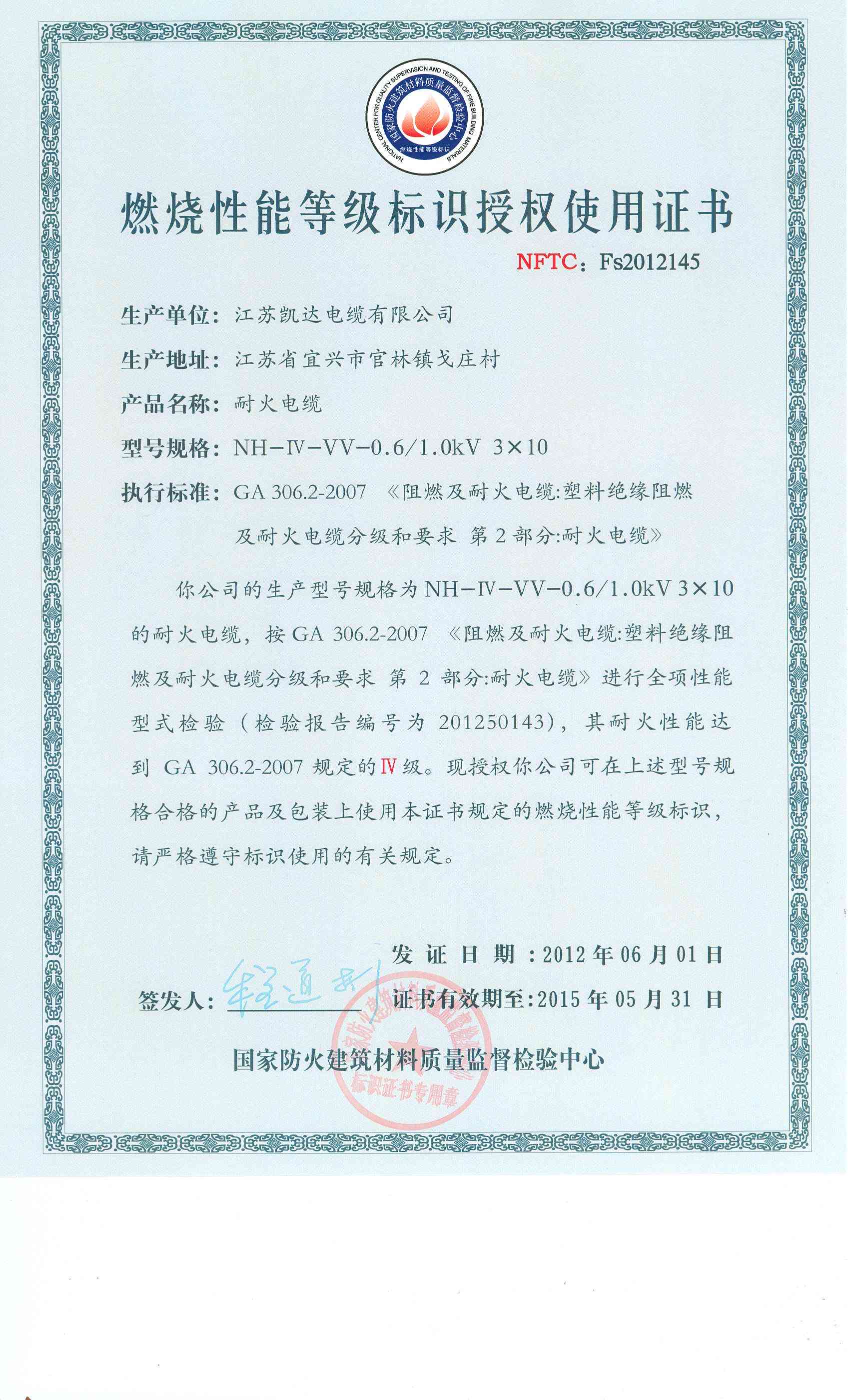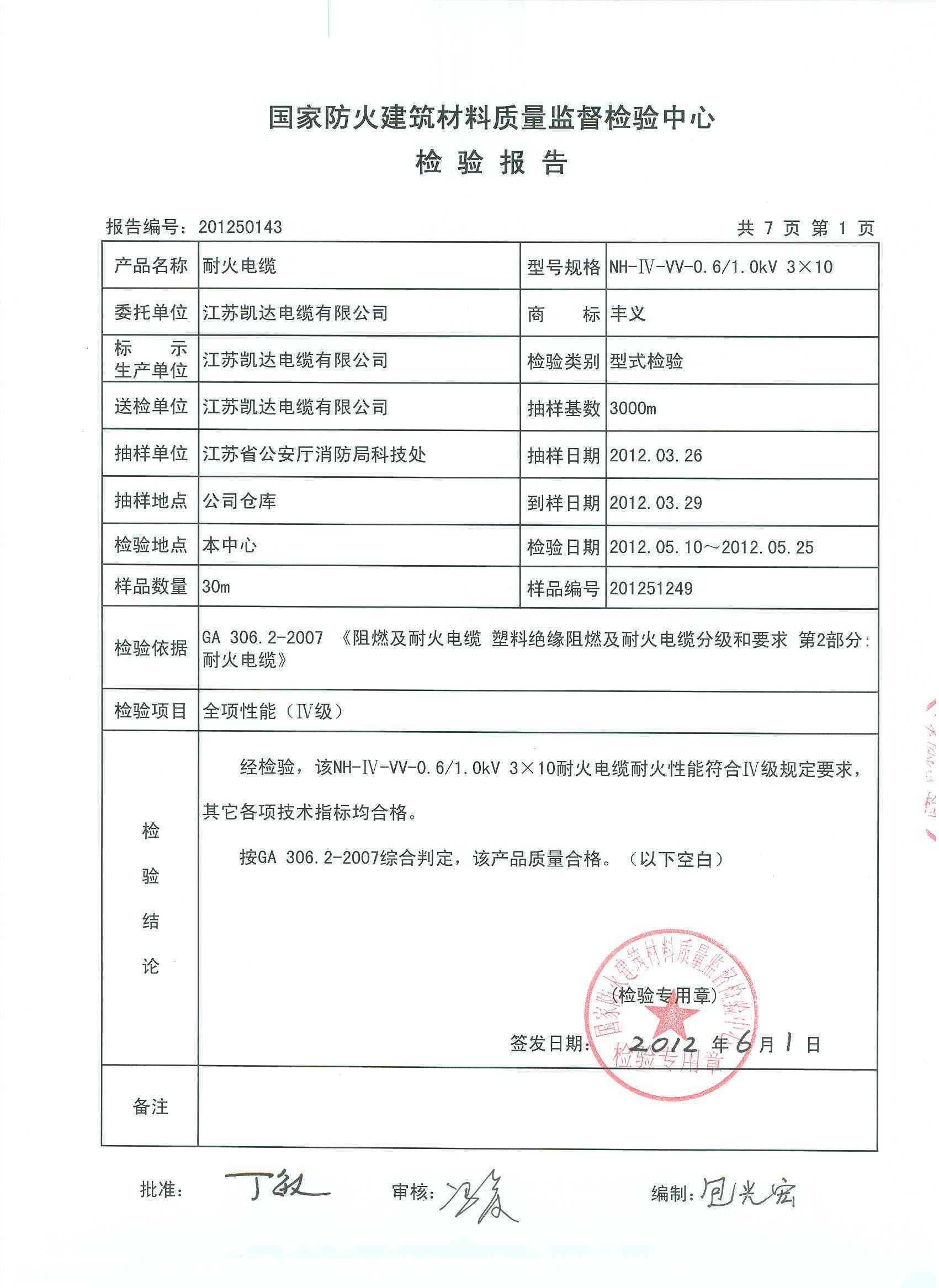 经检验,该NH-Ⅳ-VV-0.6/1.0kV 3×10耐火电缆耐火性能符合Ⅳ级规定要求,其它各项技术指标均合格。 按GA 306.2-2007综合判定,该产品质量合格。(以下空白)