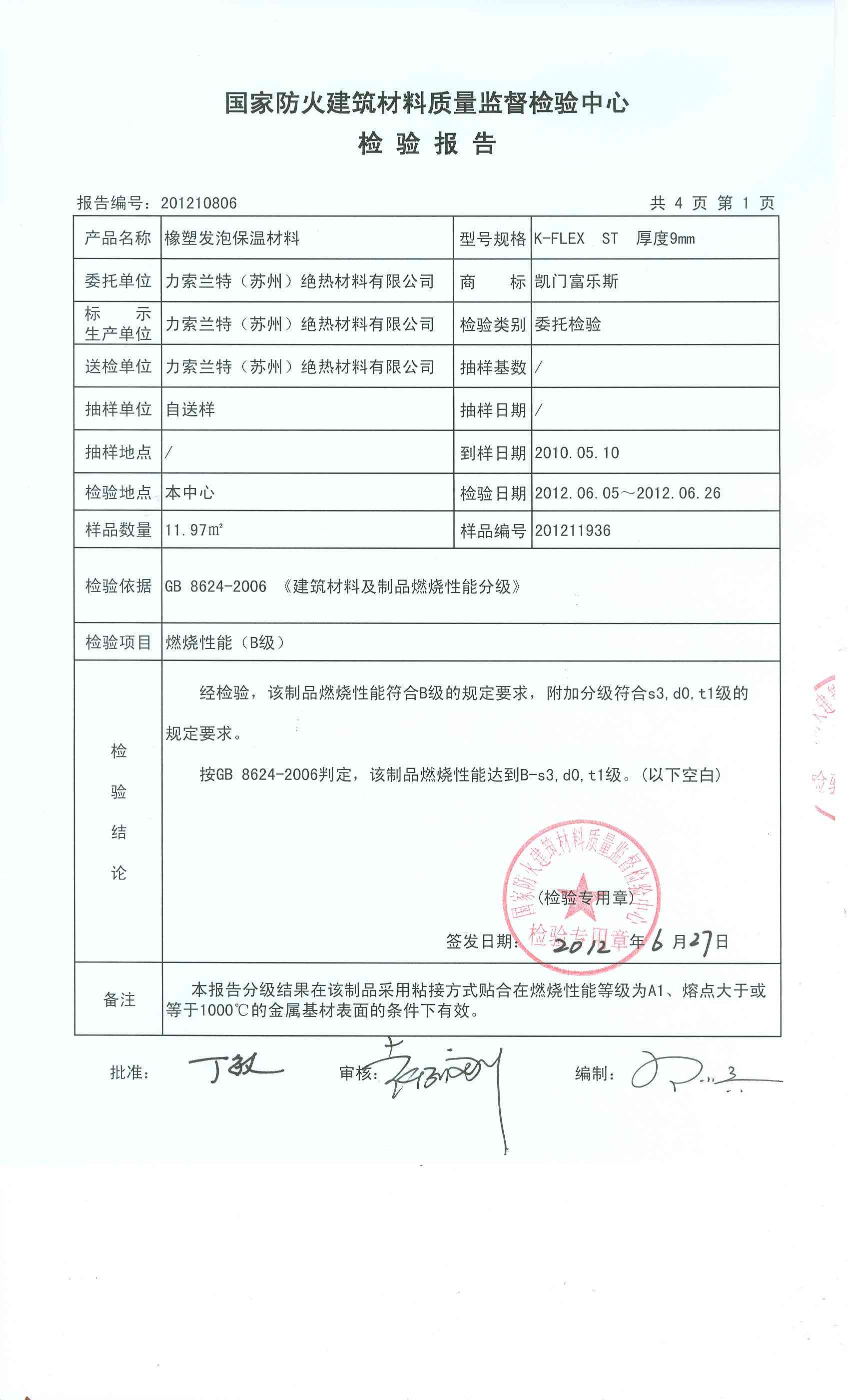 经检验,该制品燃烧性能符合B级的规定要求,附加分级符合s3,d0,t1级的 规定要求。 按GB 8624-2006判定,该制品燃烧性能达到B-s3,d0,t1级。(以下空白)