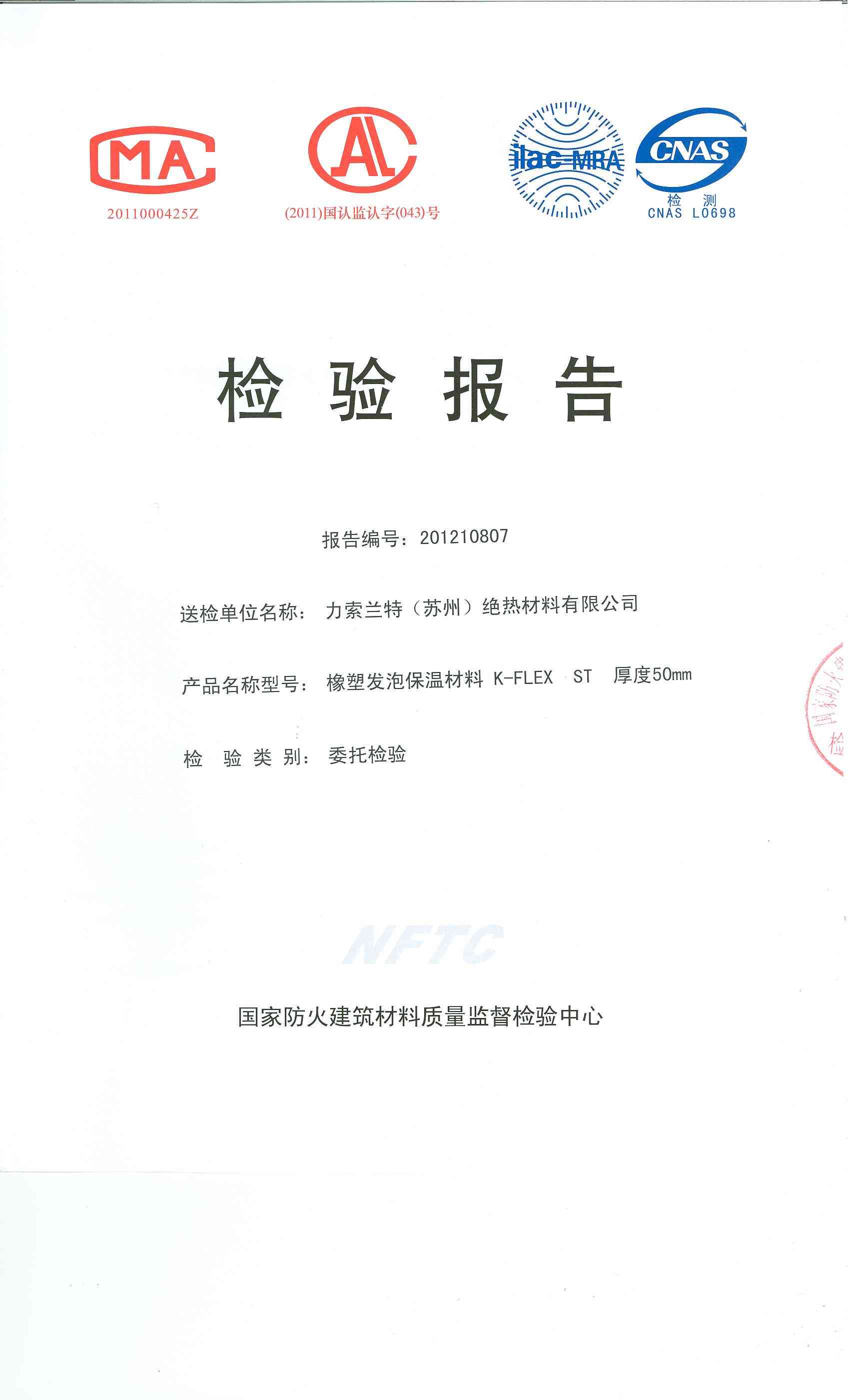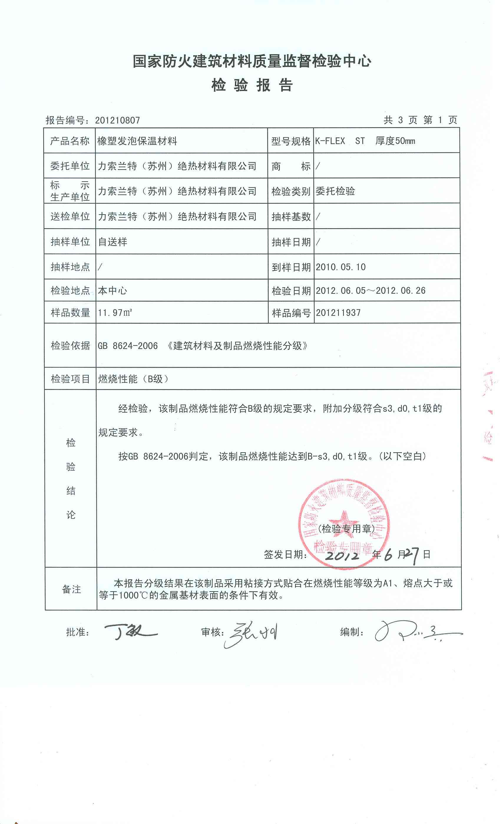 经检验,该制品燃烧性能符合B级的规定要求,附加分级符合s3,d0,t1级的 规定要求。 按GB 8624-2006判定,该制品燃烧性能达到B-s3,d0,t1级。(以下空白)