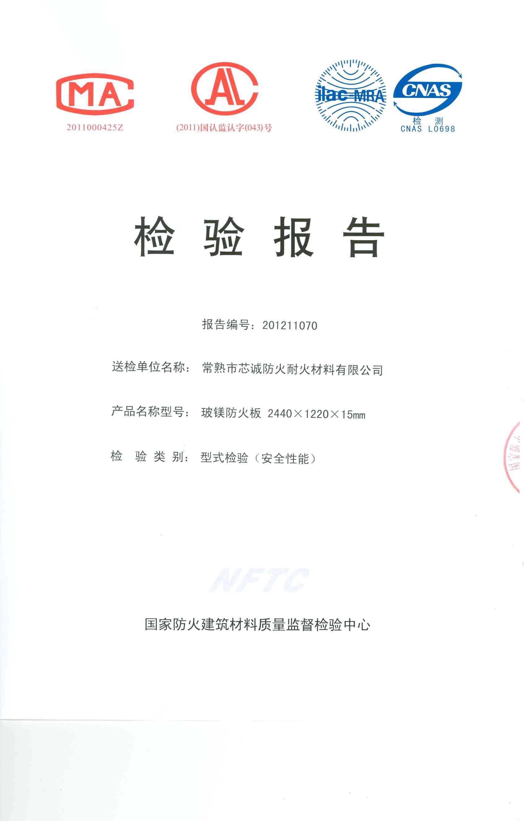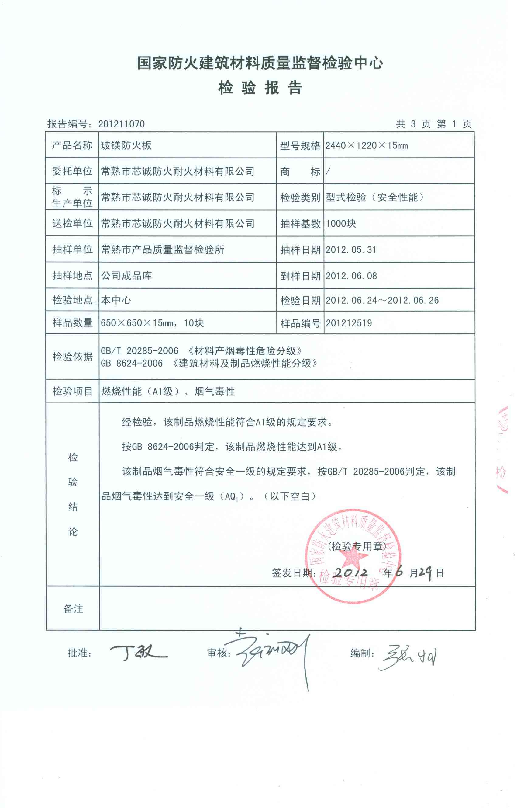 经检验,该制品燃烧性能符合A1级的规定要求。 按GB 8624-2006判定,该制品燃烧性能达到A1级。 该制品烟气毒性符合安全一级的规定要求,按GB/T 20285-2006判定,该制品烟气毒性达到安全一级(AQ1)。(以下空白)