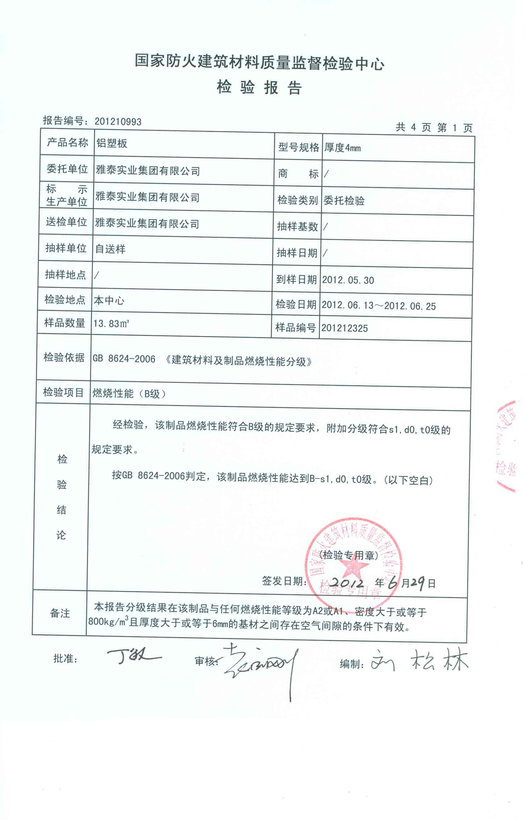 经检验,该制品燃烧性能符合B级的规定要求,附加分级符合s1,d0,t0级的 规定要求。 按GB 8624-2006判定,该制品燃烧性能达到B-s1,d0,t0级。(以下空白)