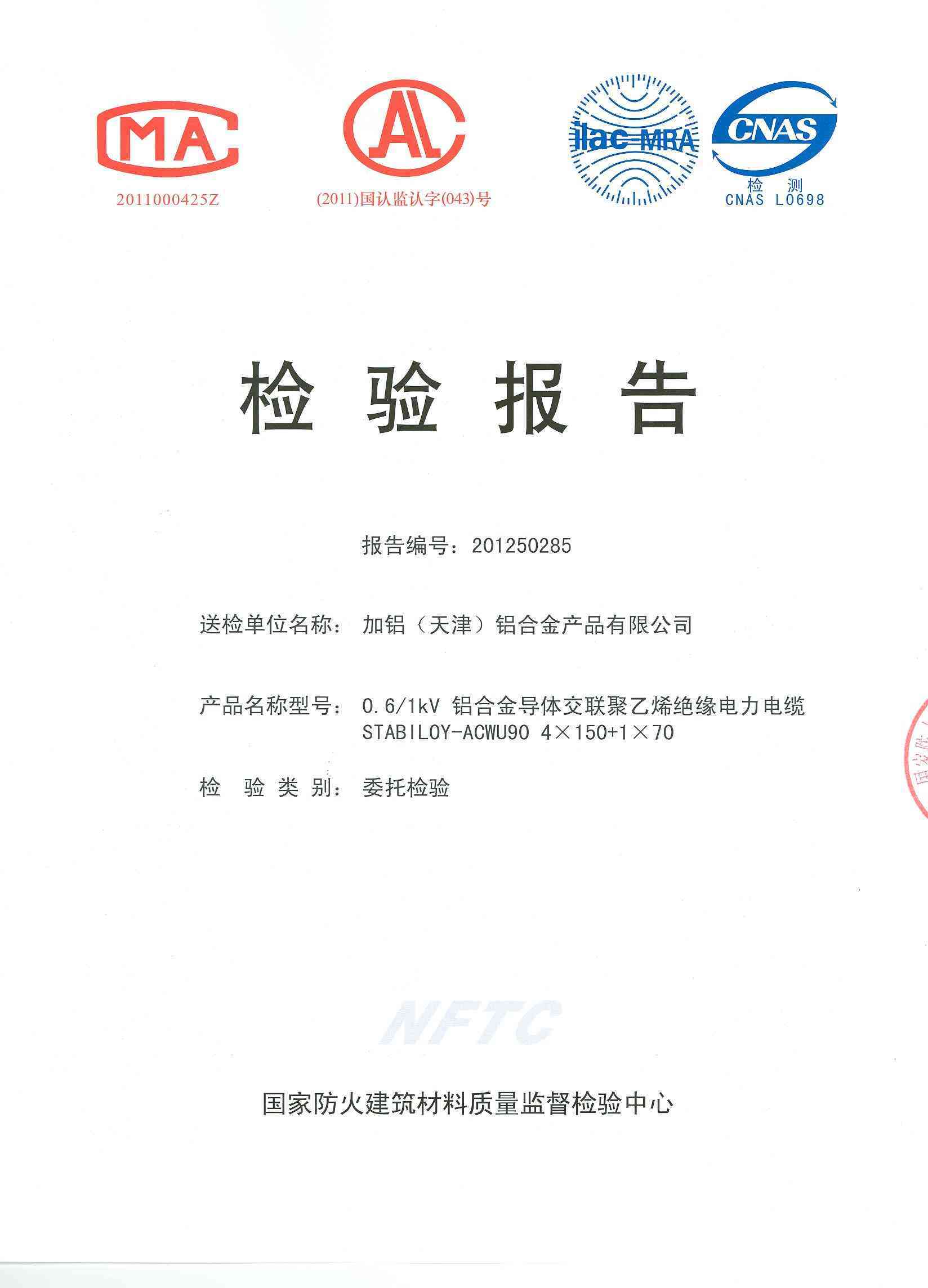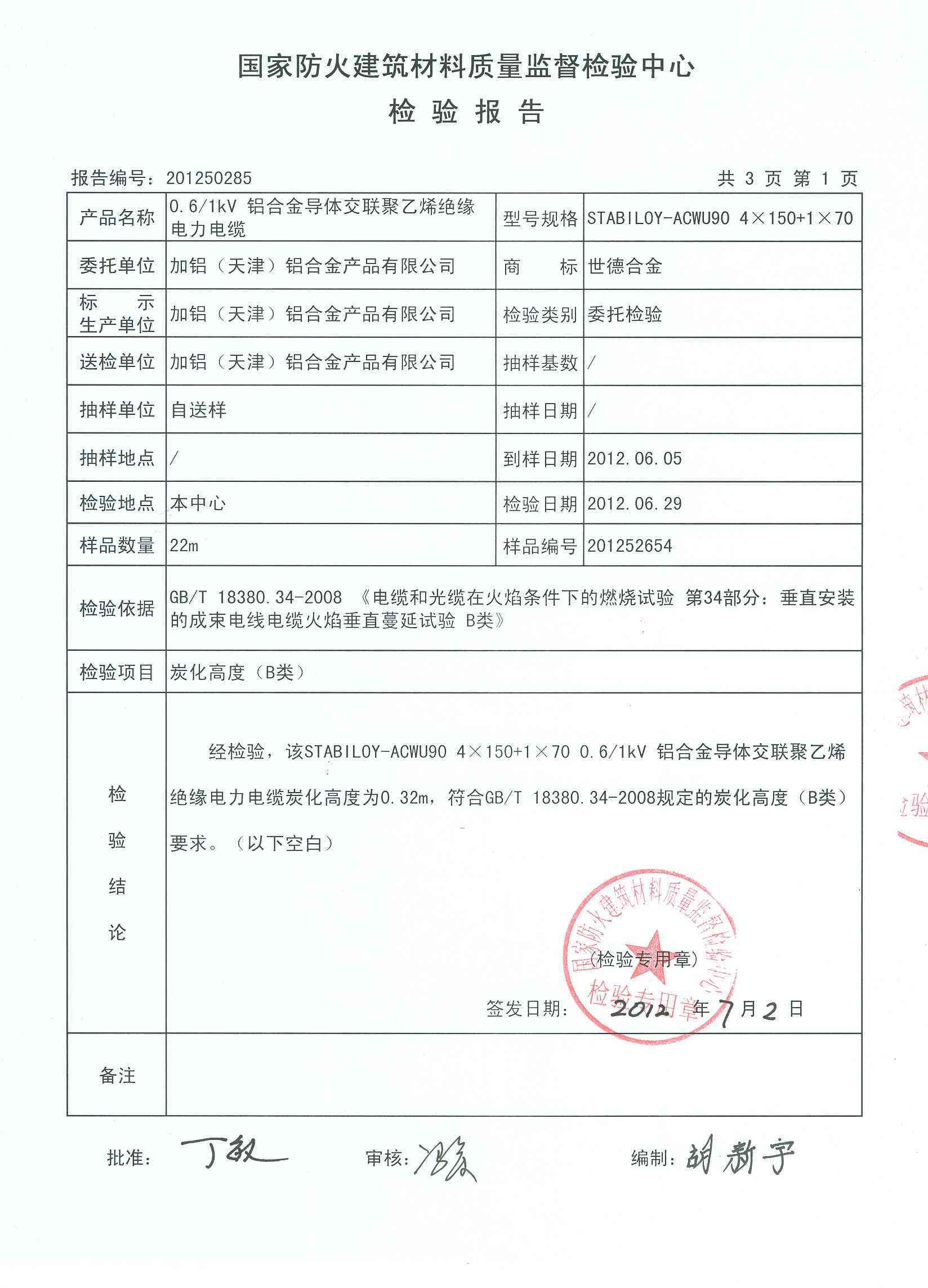 经检验,该STABILOY-ACWU90 4×150+1×70 0.6/1kV 铝合金导体交联聚乙烯绝缘电力电缆炭化高度为0.32m,符合GB/T 18380.34-2008规定的炭化高度(B类)要求。(以下空白)
