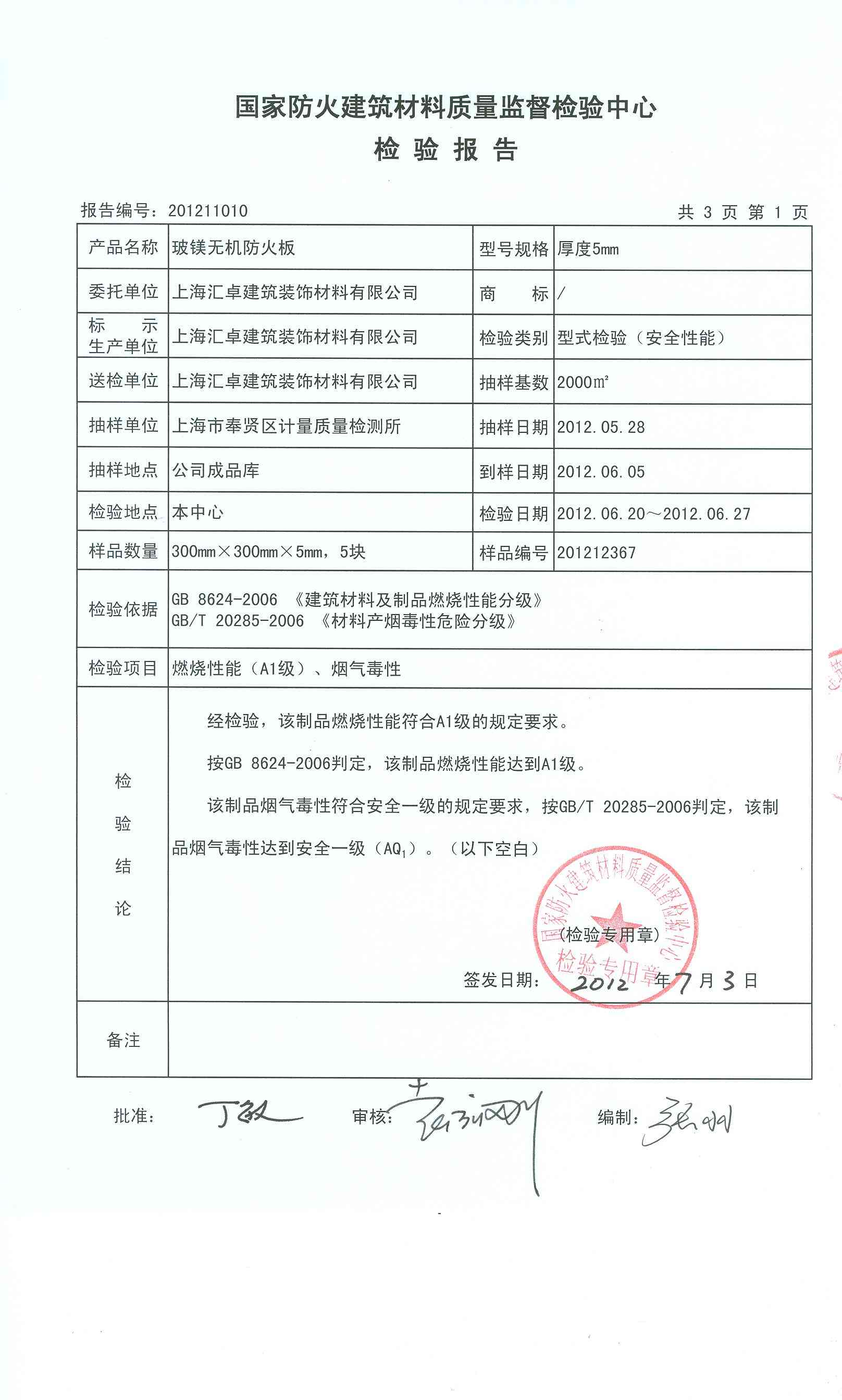 经检验,该制品燃烧性能符合A1级的规定要求。 按GB 8624-2006判定,该制品燃烧性能达到A1级。 该制品烟气毒性符合安全一级的规定要求,按GB/T 20285-2006判定,该制品烟气毒性达到安全一级(AQ1)。(以下空白)