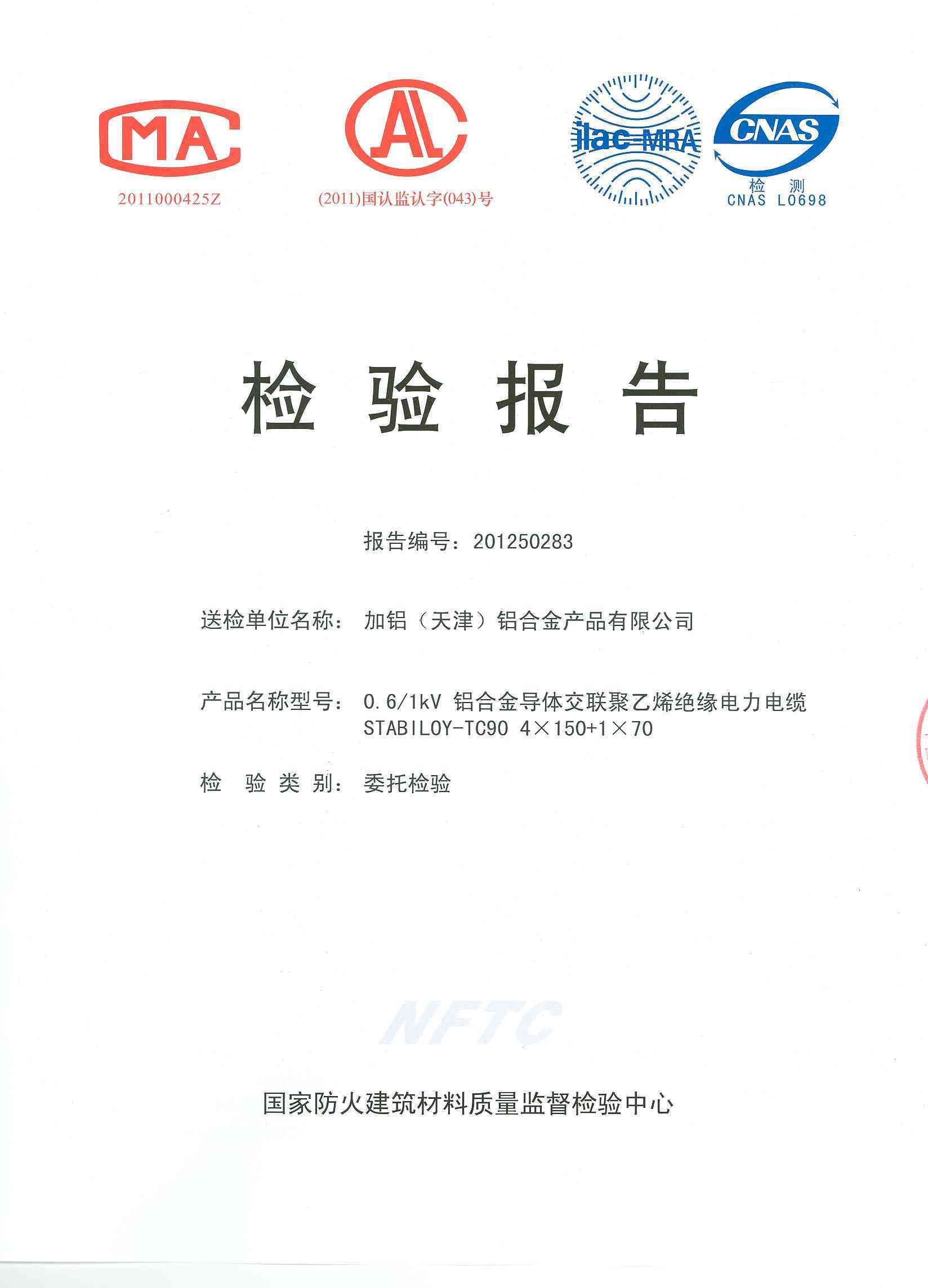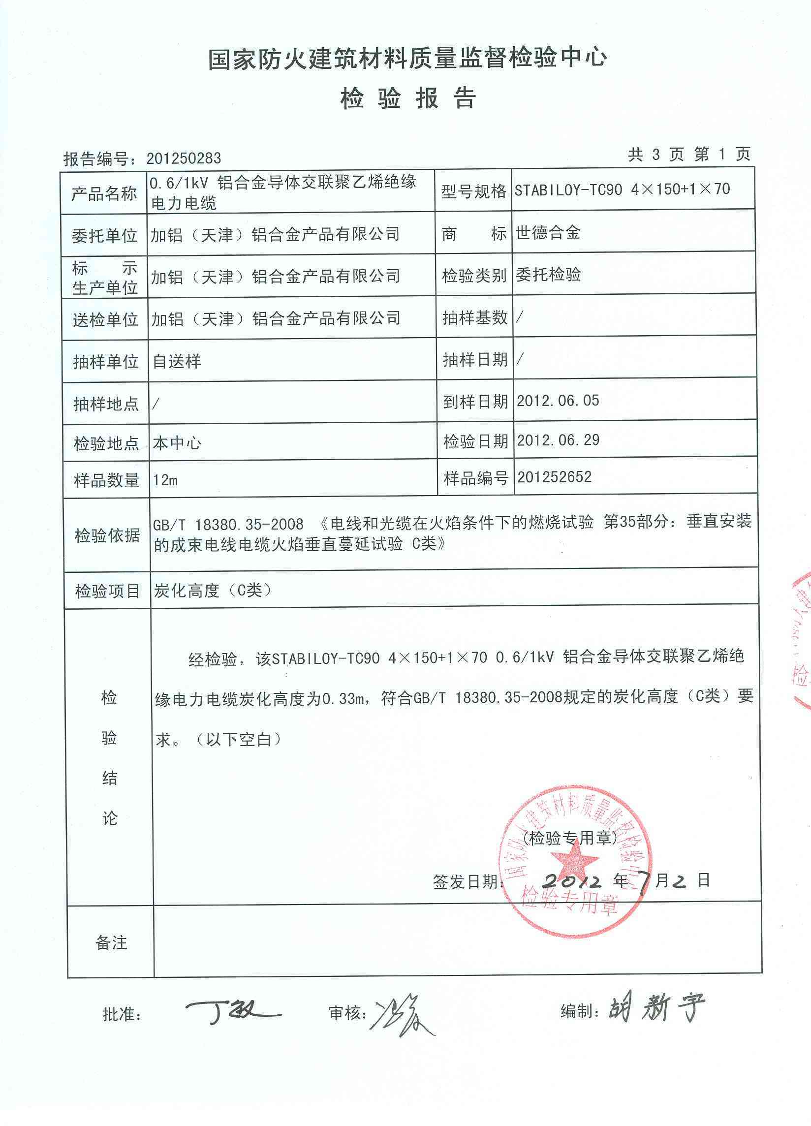 经检验,该STABILOY-TC90 4×150+1×70 0.6/1kV 铝合金导体交联聚乙烯绝缘电力电缆炭化高度为0.33m,符合GB/T 18380.35-2008规定的炭化高度(C类)要求。(以下空白)