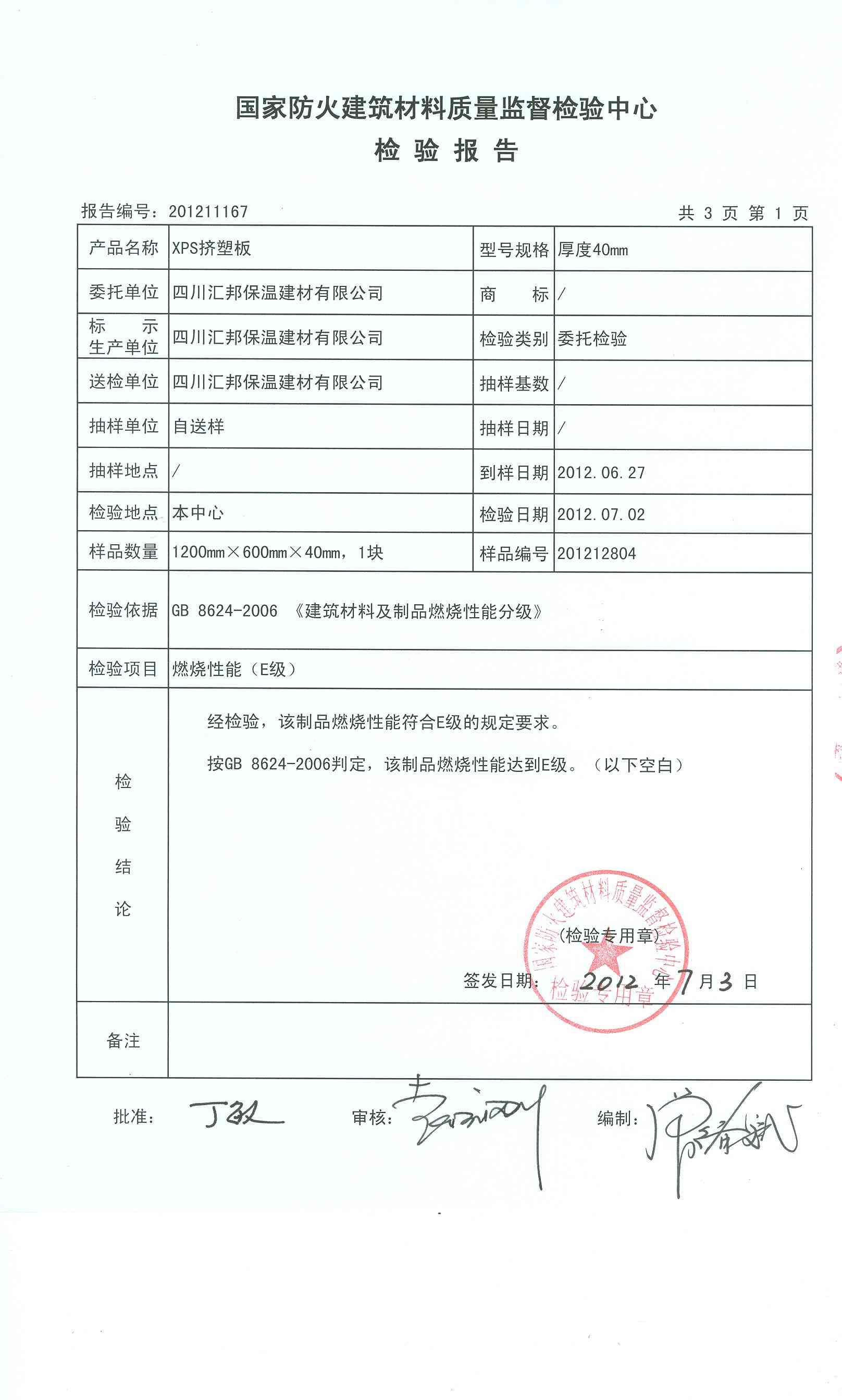 经检验,该制品燃烧性能符合E级的规定要求。 按GB 8624-2006判定,该制品燃烧性能达到E级。(以下空白)