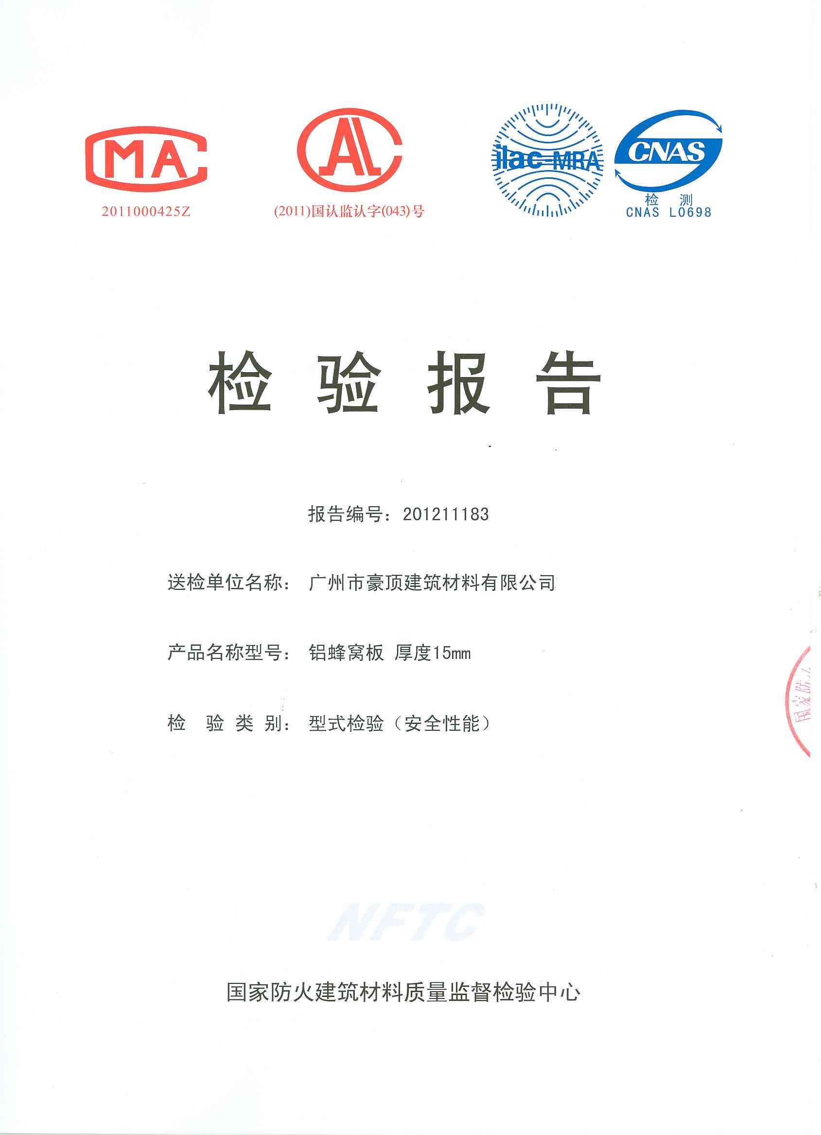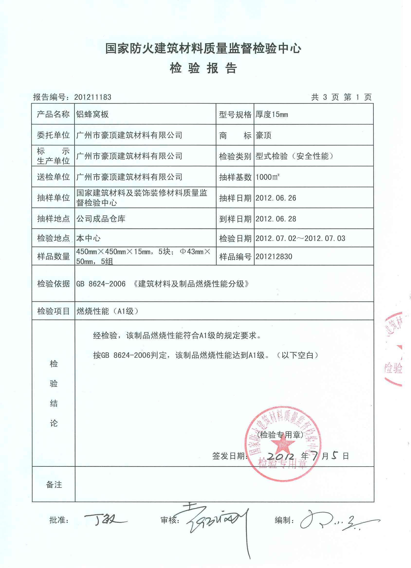 经检验,该制品燃烧性能符合A1级的规定要求。 按GB 8624-2006判定,该制品燃烧性能达到A1级。(以下空白)