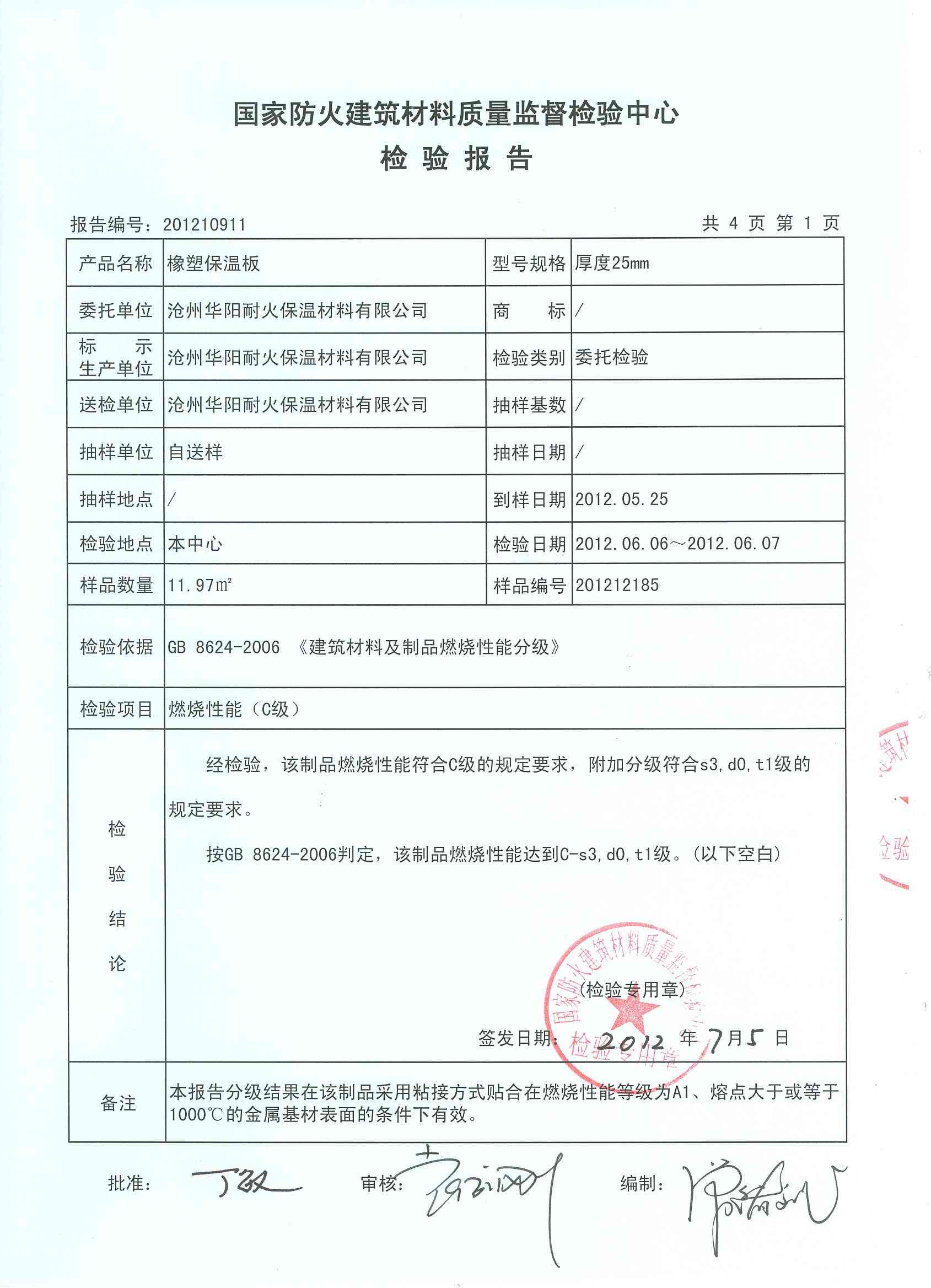经检验,该制品燃烧性能符合C级的规定要求,附加分级符合s3,d0,t1级的 规定要求。 按GB 8624-2006判定,该制品燃烧性能达到C-s3,d0,t1级。(以下空白)