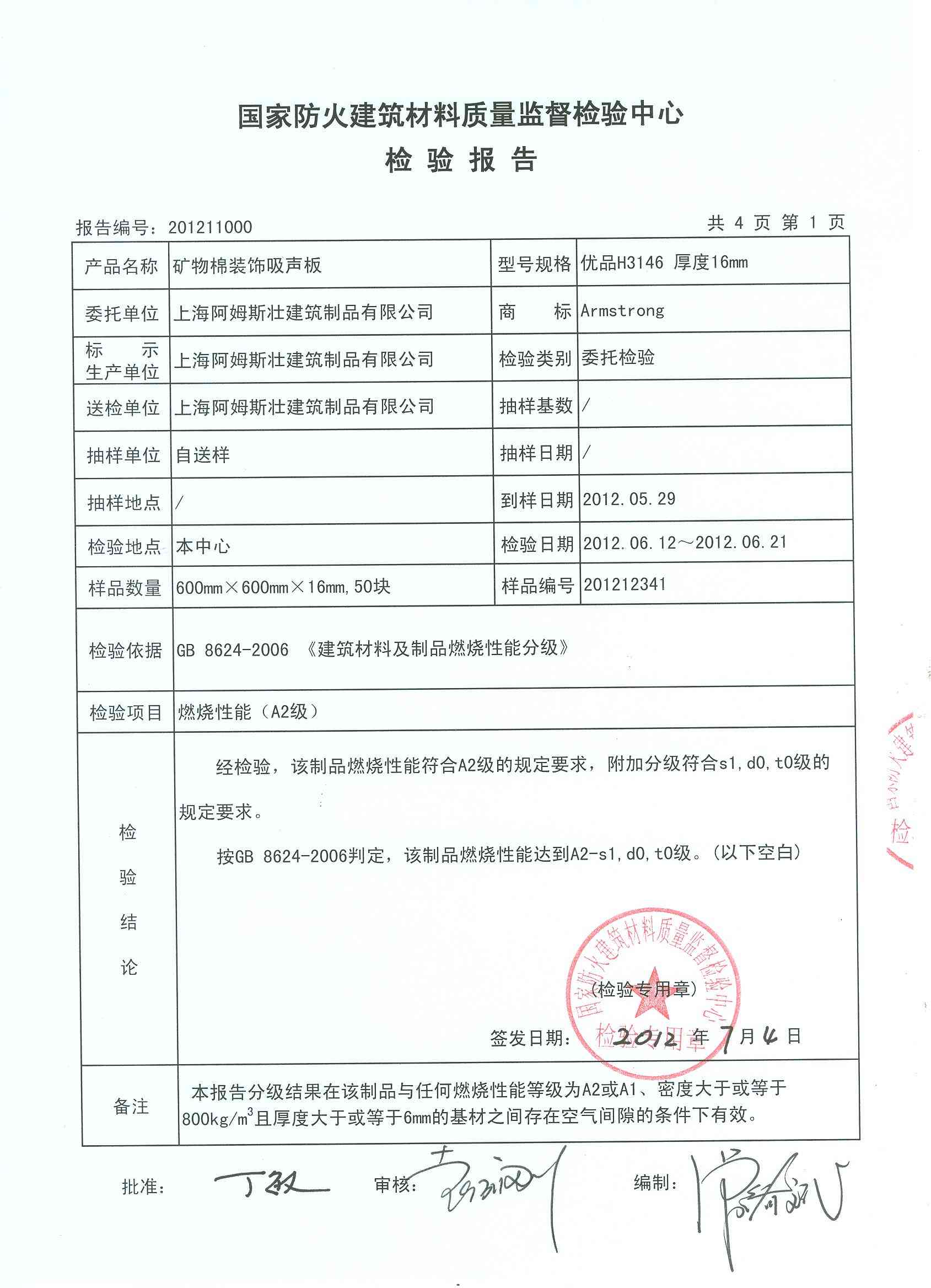 经检验,该制品燃烧性能符合A2级的规定要求,附加分级符合s1,d0,t0级的 规定要求。 按GB 8624-2006判定,该制品燃烧性能达到A2-s1,d0,t0级。(以下空白)