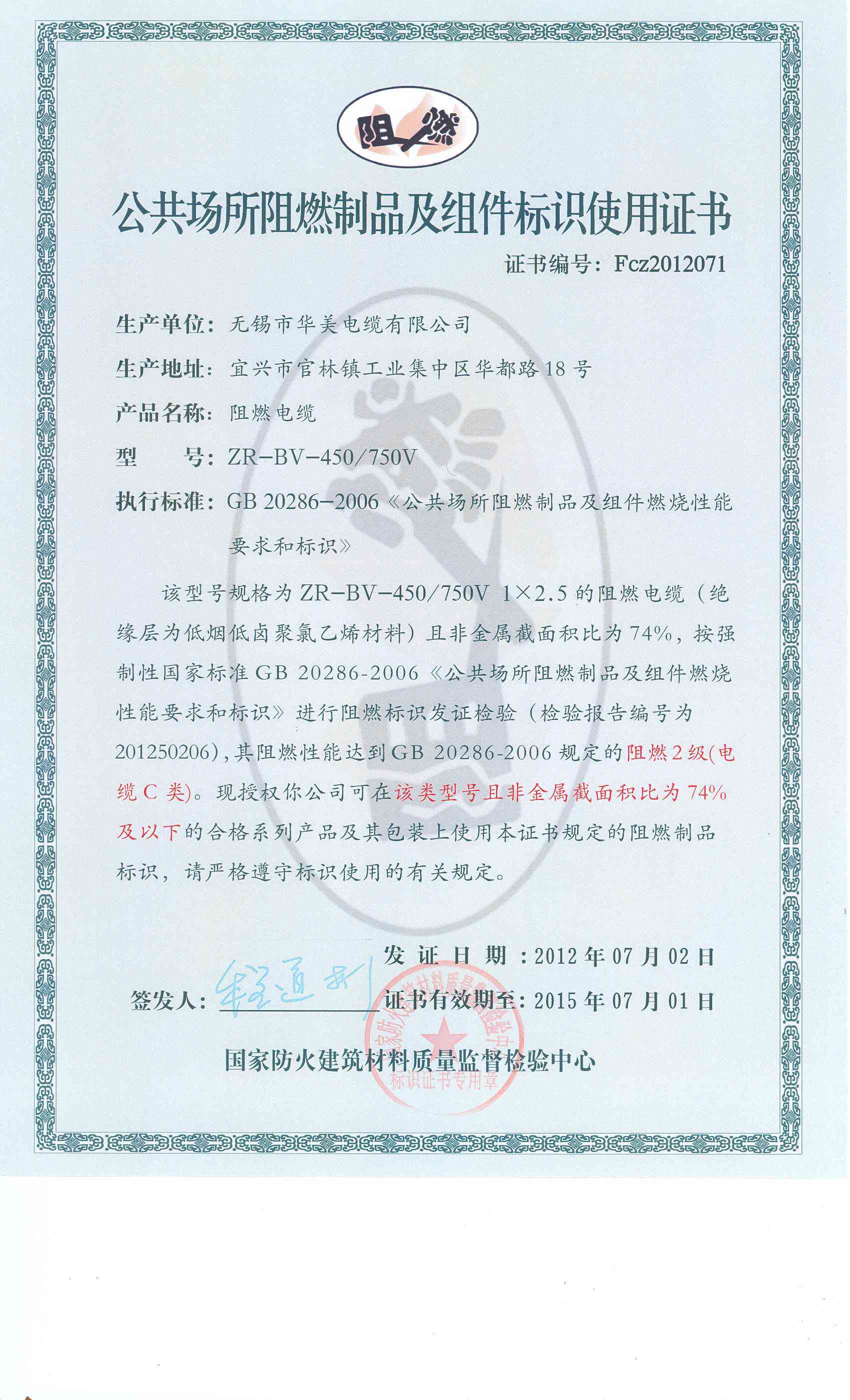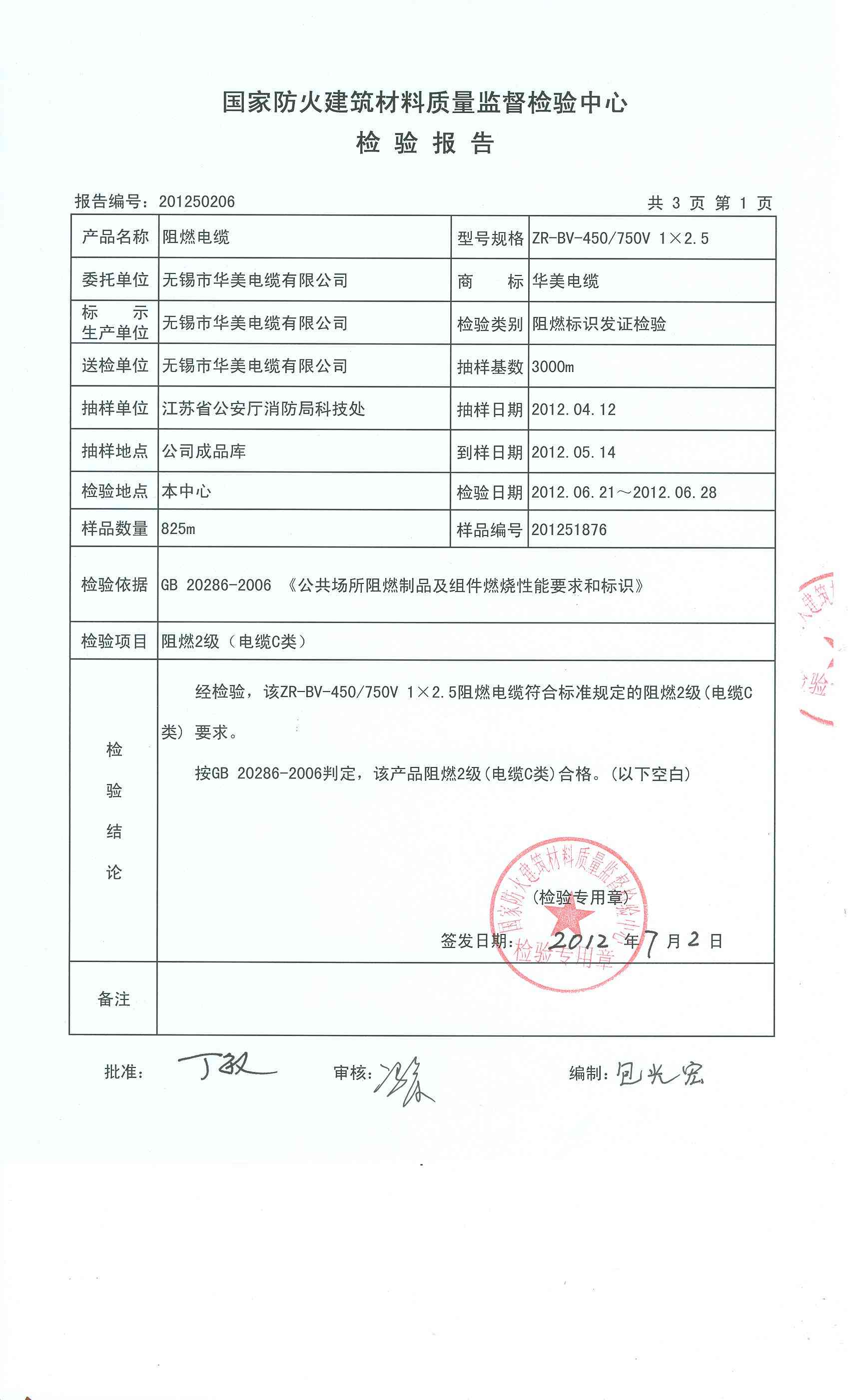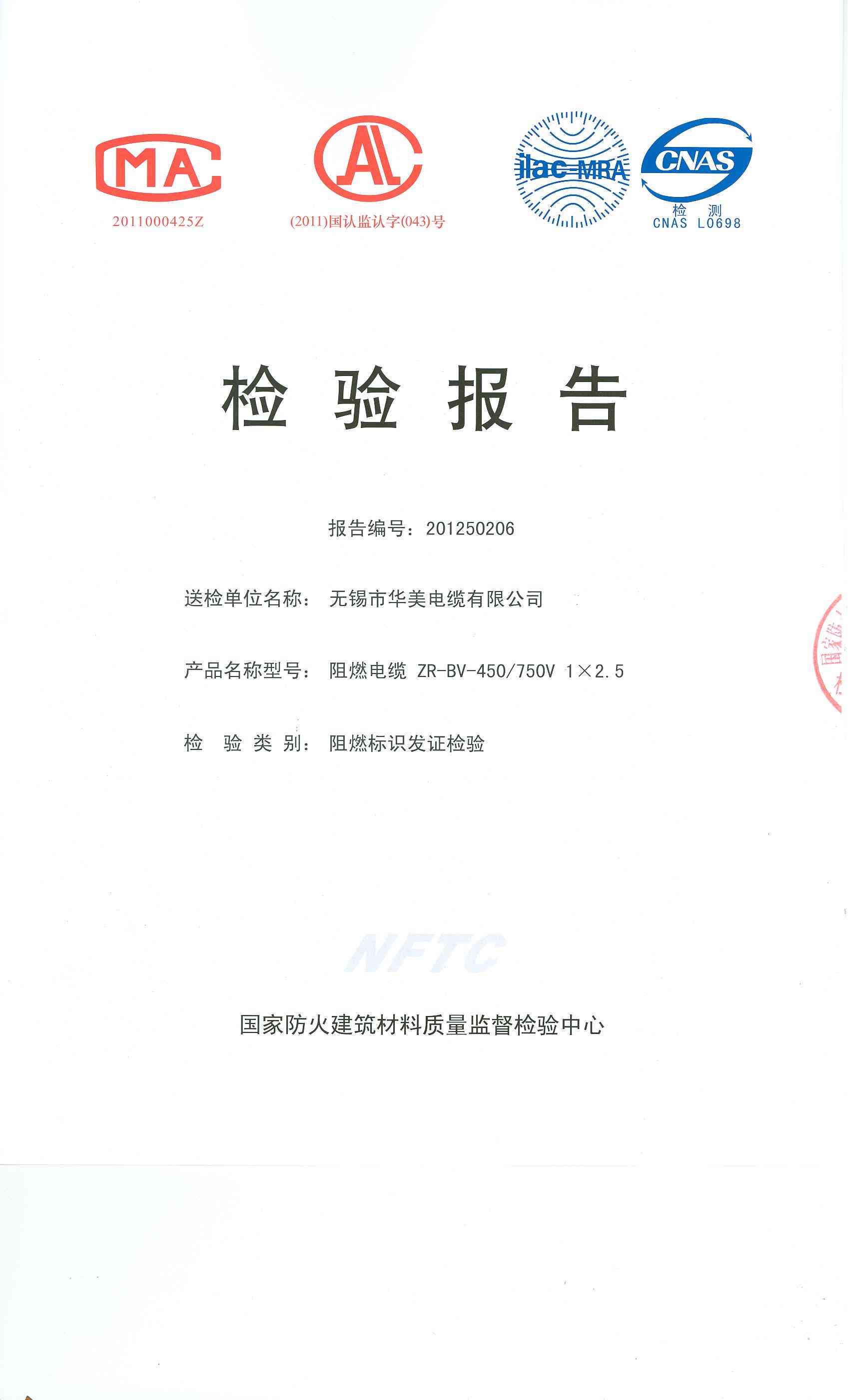 经检验,该ZR-BV-450/750V 1×2.5阻燃电缆符合标准规定的阻燃2级(电缆C类) 要求。 按GB 20286-2006判定,该产品阻燃2级(电缆C类)合格。(以下空白)