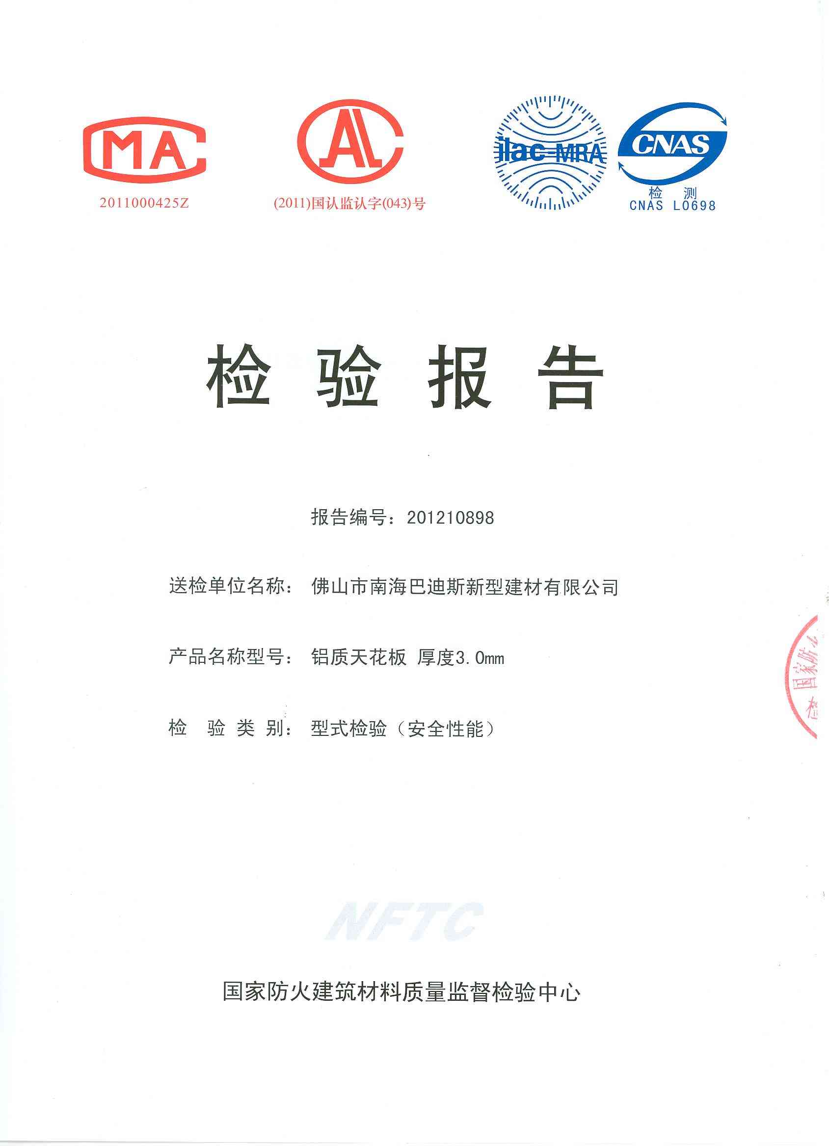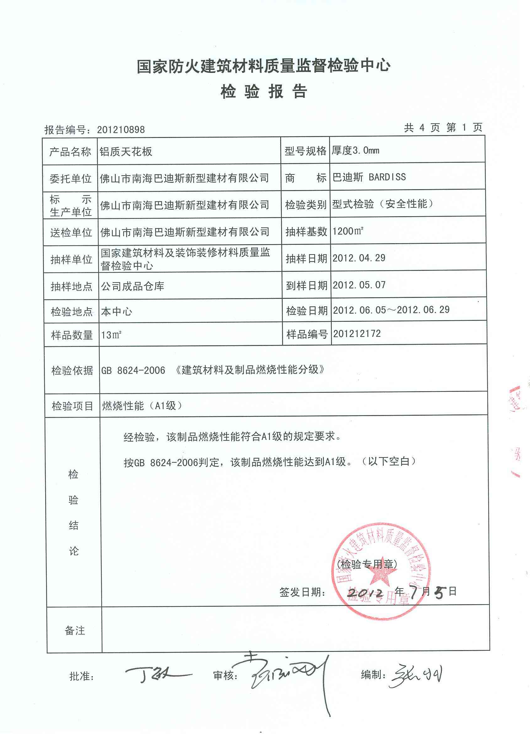 经检验,该制品燃烧性能符合A1级的规定要求。 按GB 8624-2006判定,该制品燃烧性能达到A1级。(以下空白)