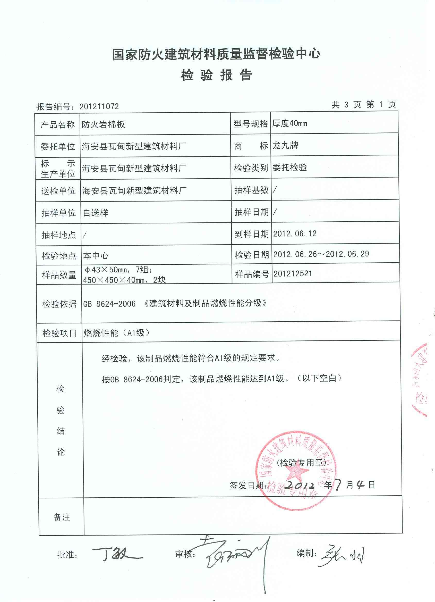 经检验,该制品燃烧性能符合A1级的规定要求。 按GB 8624-2006判定,该制品燃烧性能达到A1级。(以下空白)