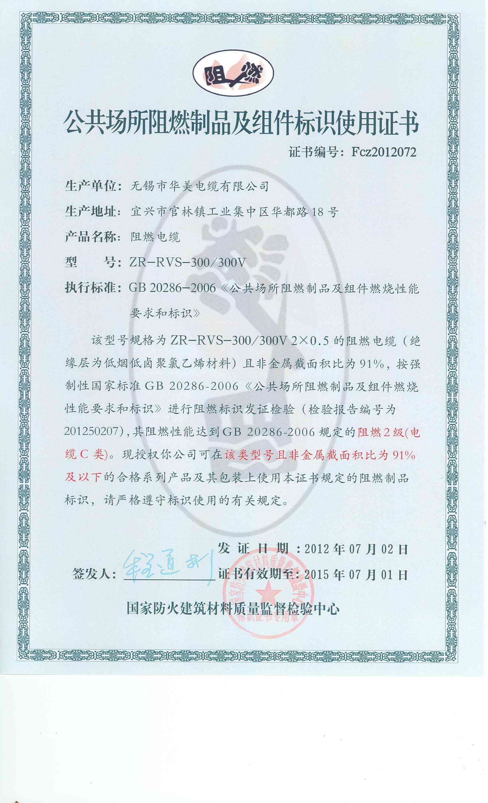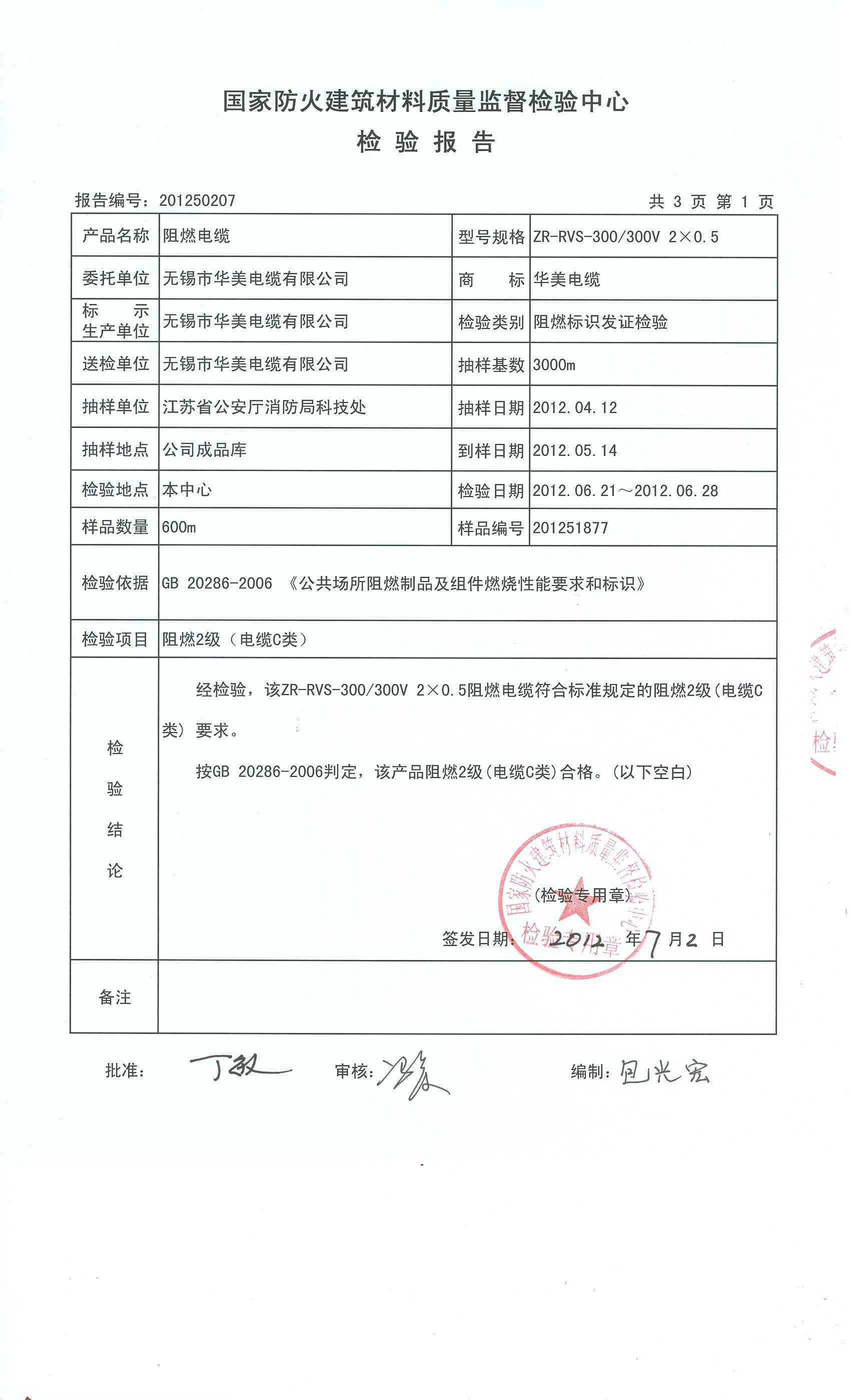 经检验,该ZR-RVS-300/300V 2×0.5阻燃电缆符合标准规定的阻燃2级(电缆C类) 要求。 按GB 20286-2006判定,该产品阻燃2级(电缆C类)合格。(以下空白)