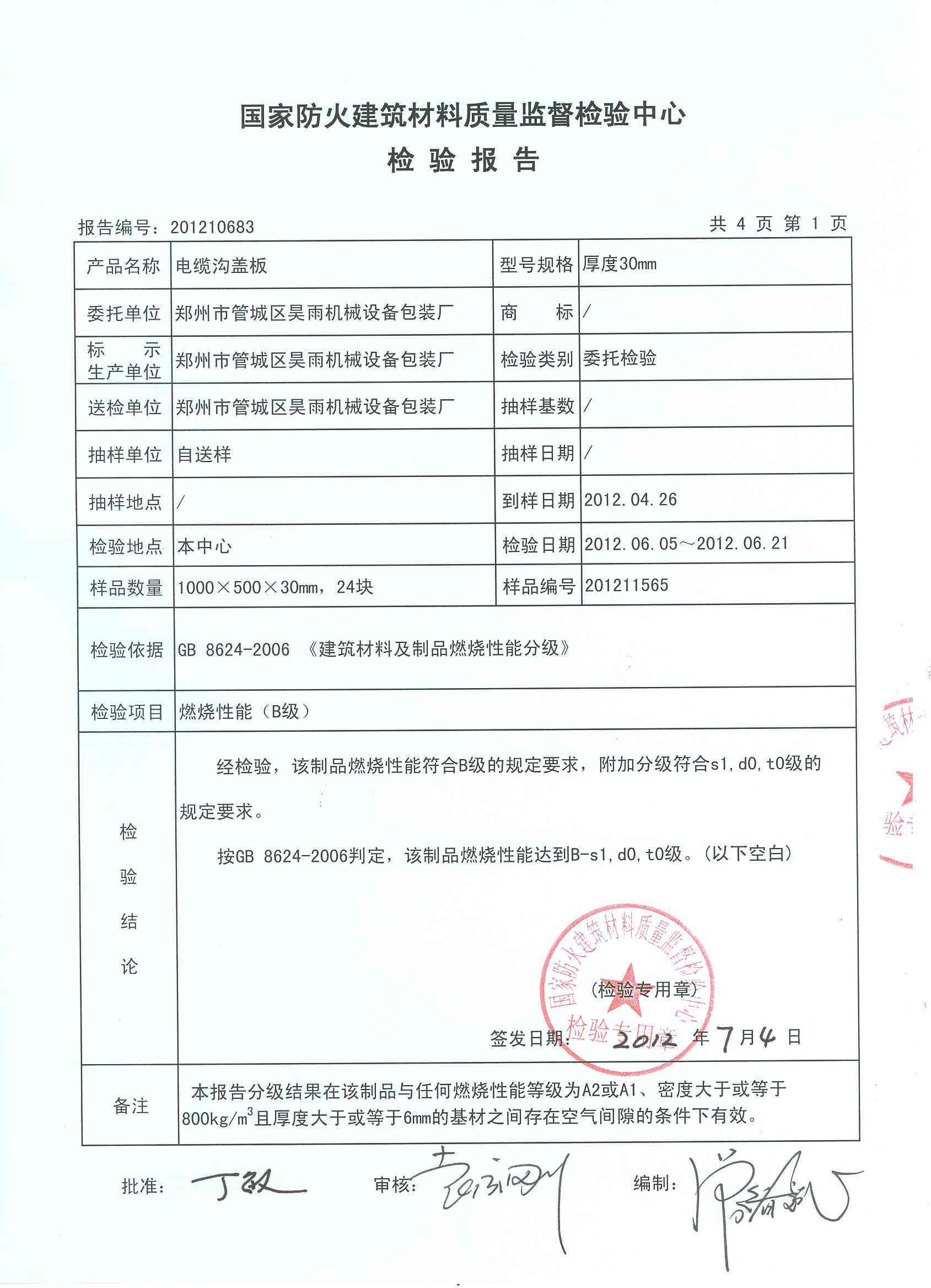 经检验,该制品燃烧性能符合B级的规定要求,附加分级符合s1,d0,t0级的 规定要求。 按GB 8624-2006判定,该制品燃烧性能达到B-s1,d0,t0级。(以下空白)