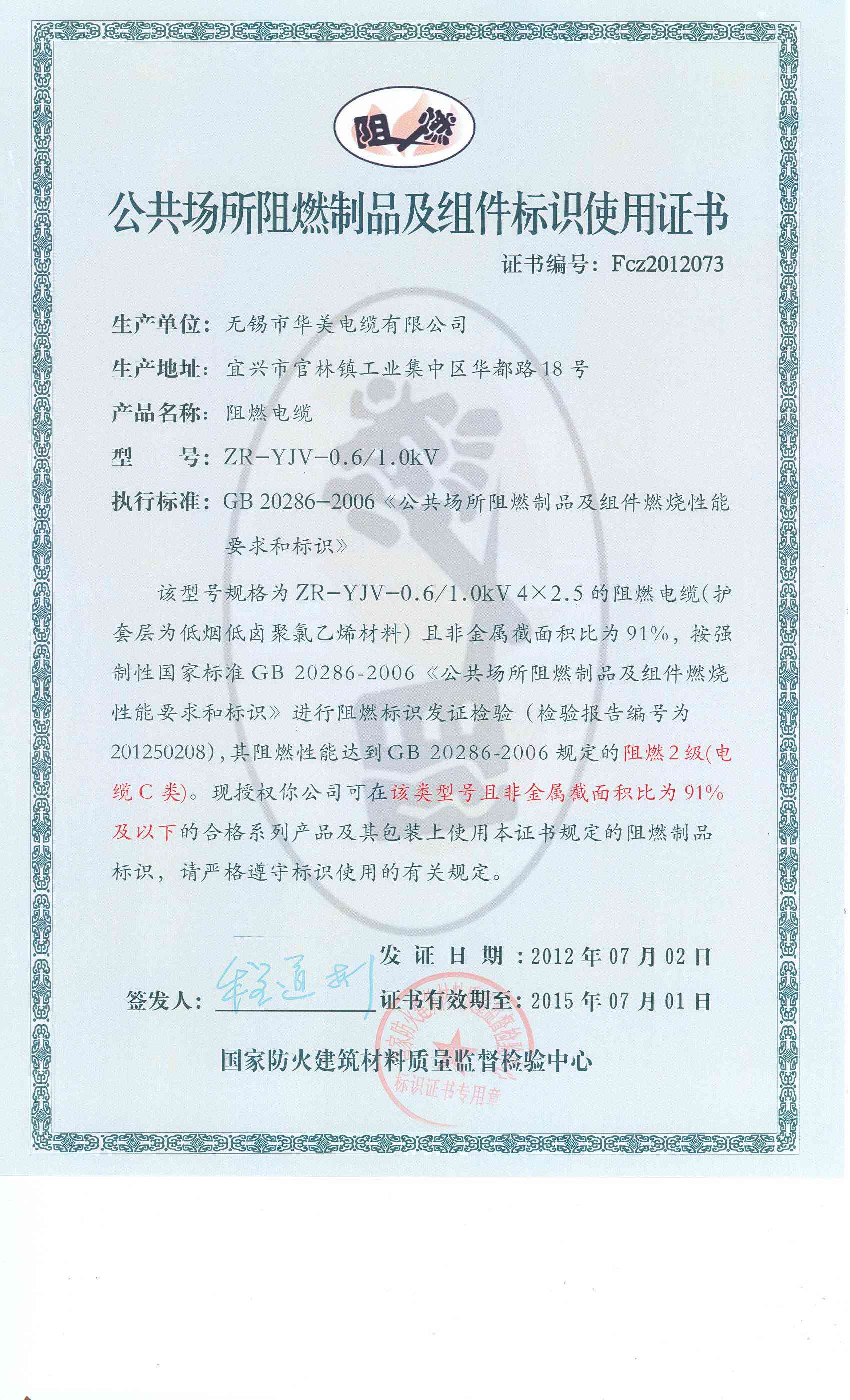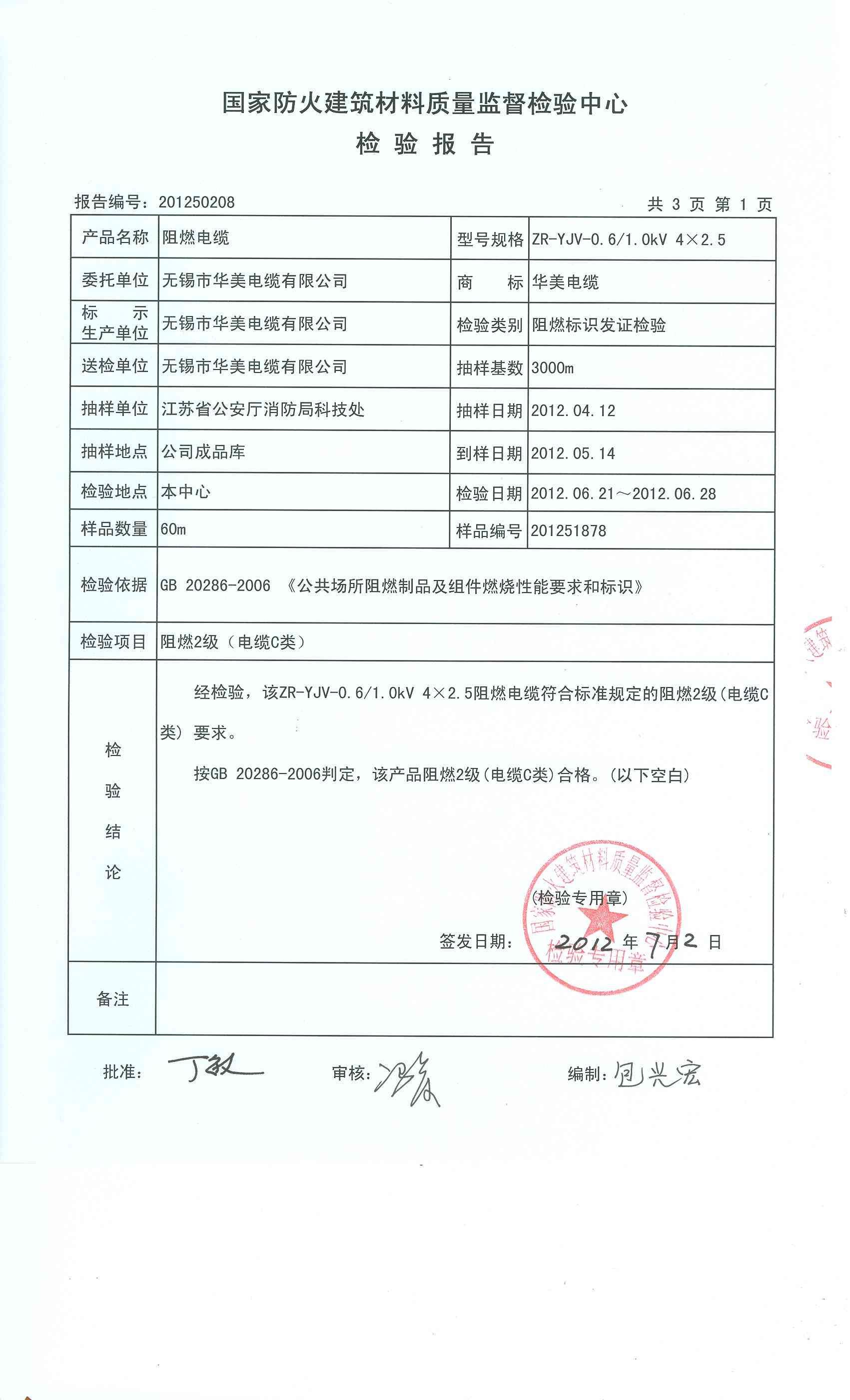 经检验,该ZR-YJV-0.6/1.0kV 4×2.5阻燃电缆符合标准规定的阻燃2级(电缆C类) 要求。 按GB 20286-2006判定,该产品阻燃2级(电缆C类)合格。(以下空白)