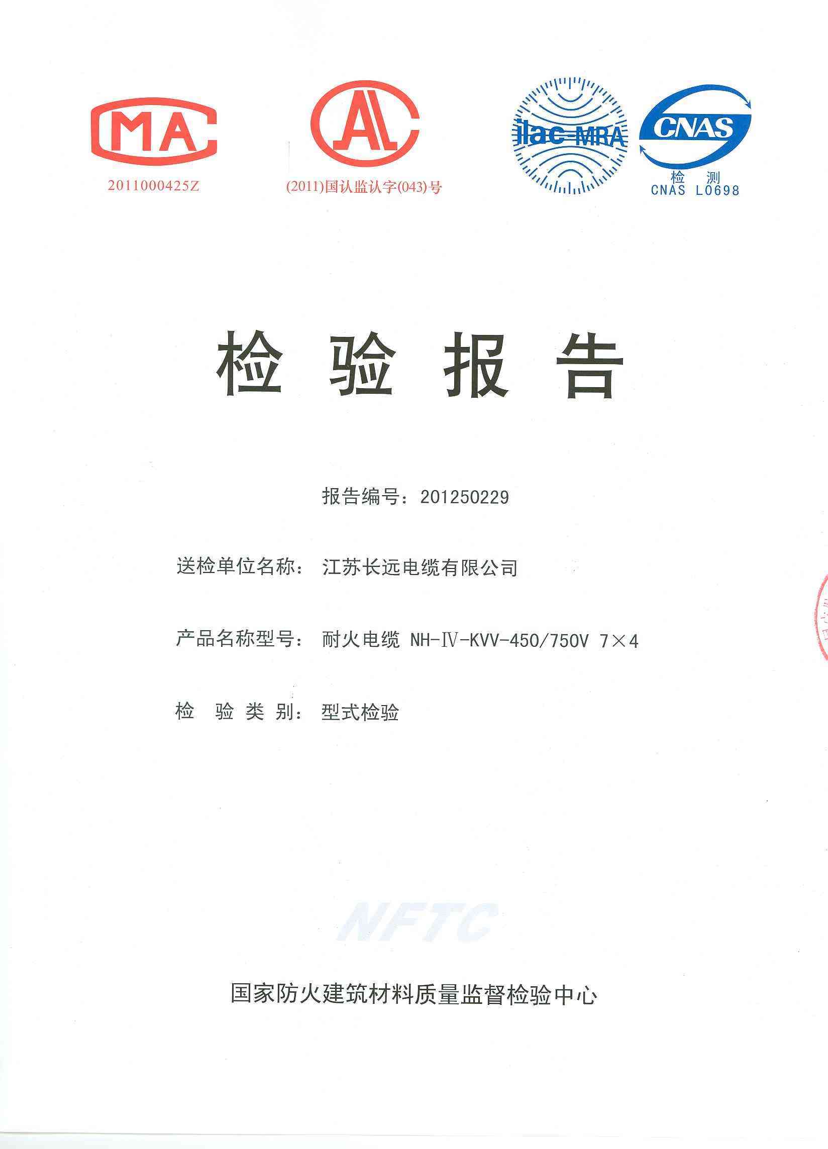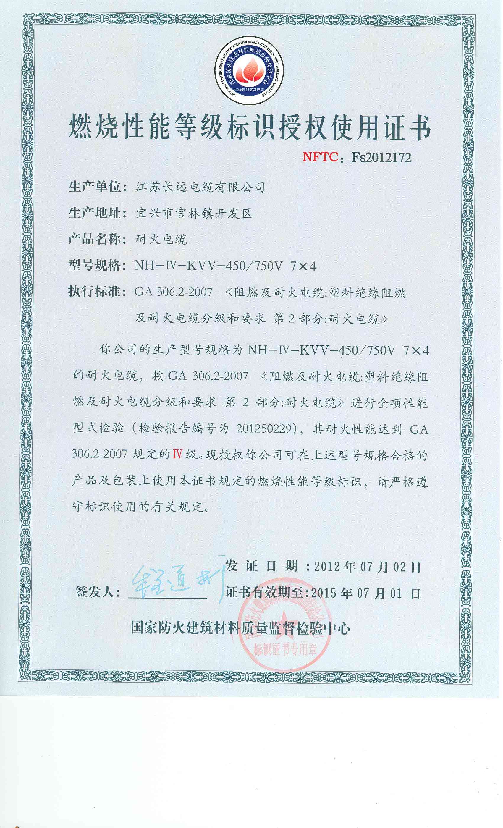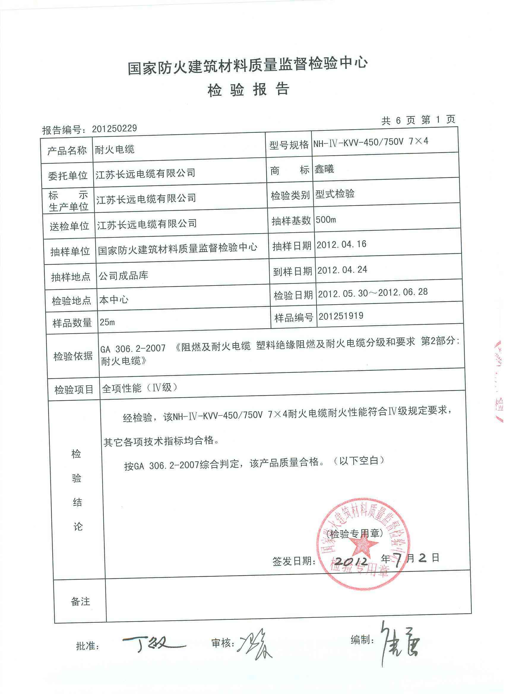 经检验,该NH-Ⅳ-KVV-450/750V 7×4耐火电缆耐火性能符合Ⅳ级规定要求,其它各项技术指标均合格。 按GA 306.2-2007综合判定,该产品质量合格。(以下空白)
