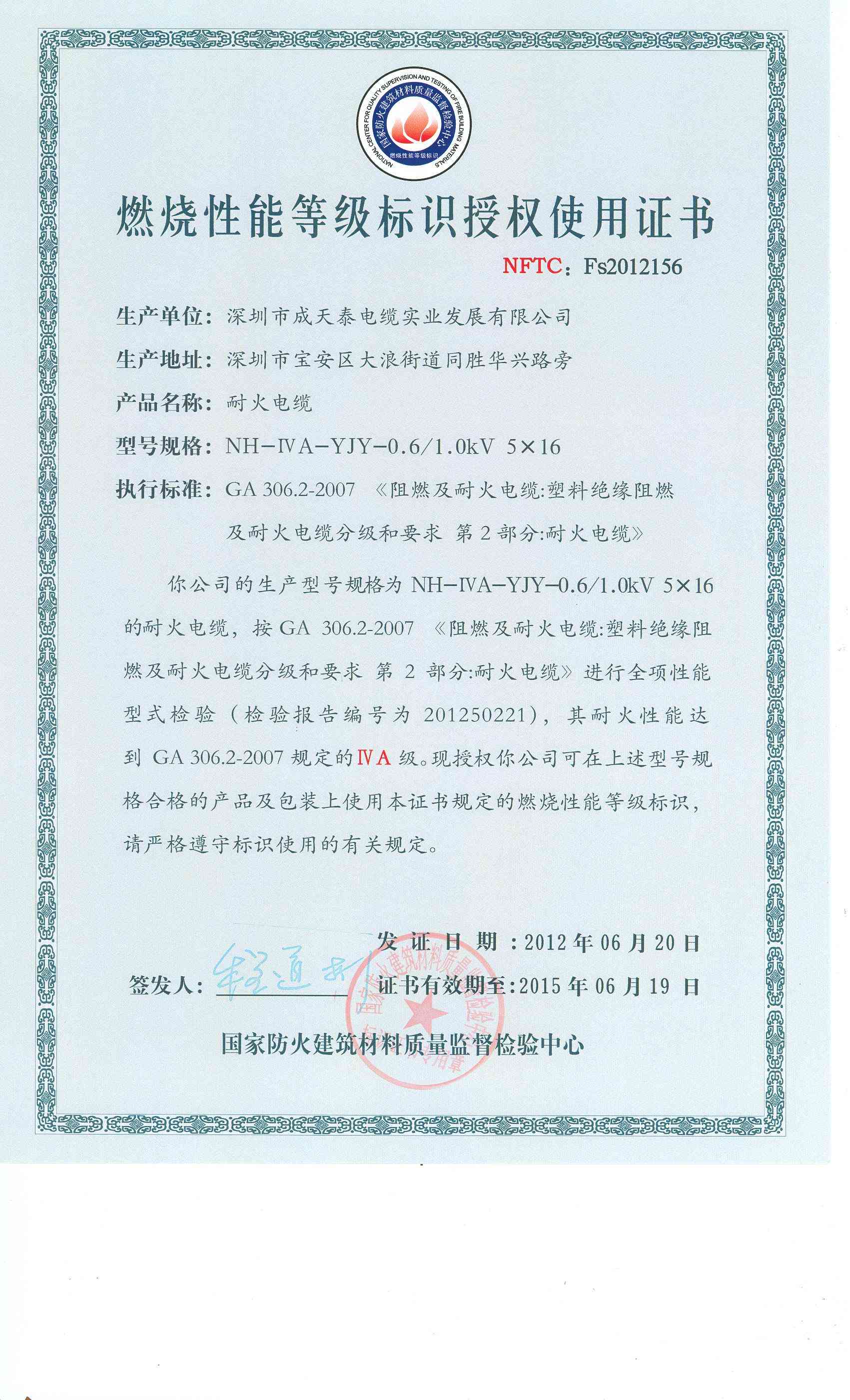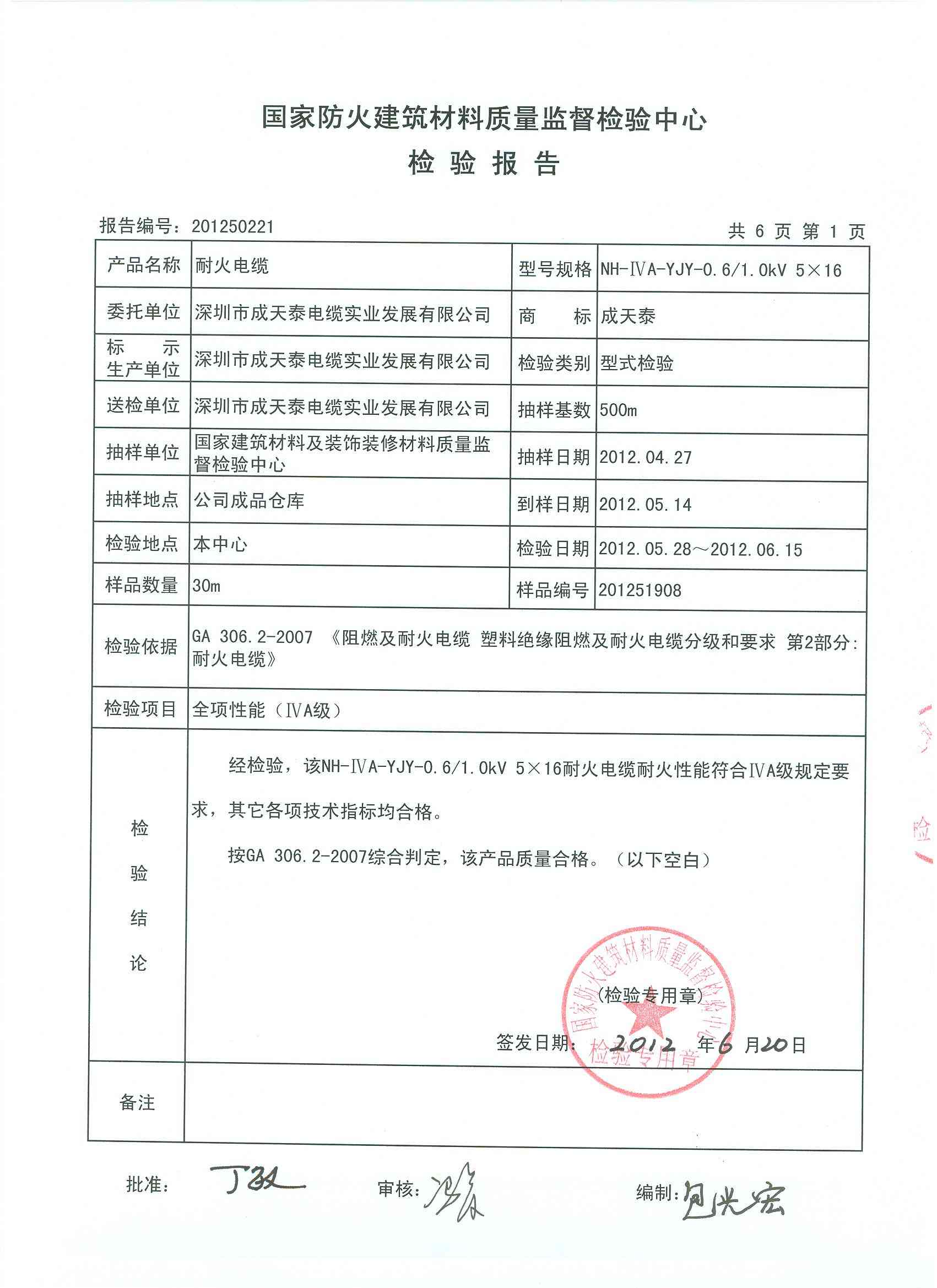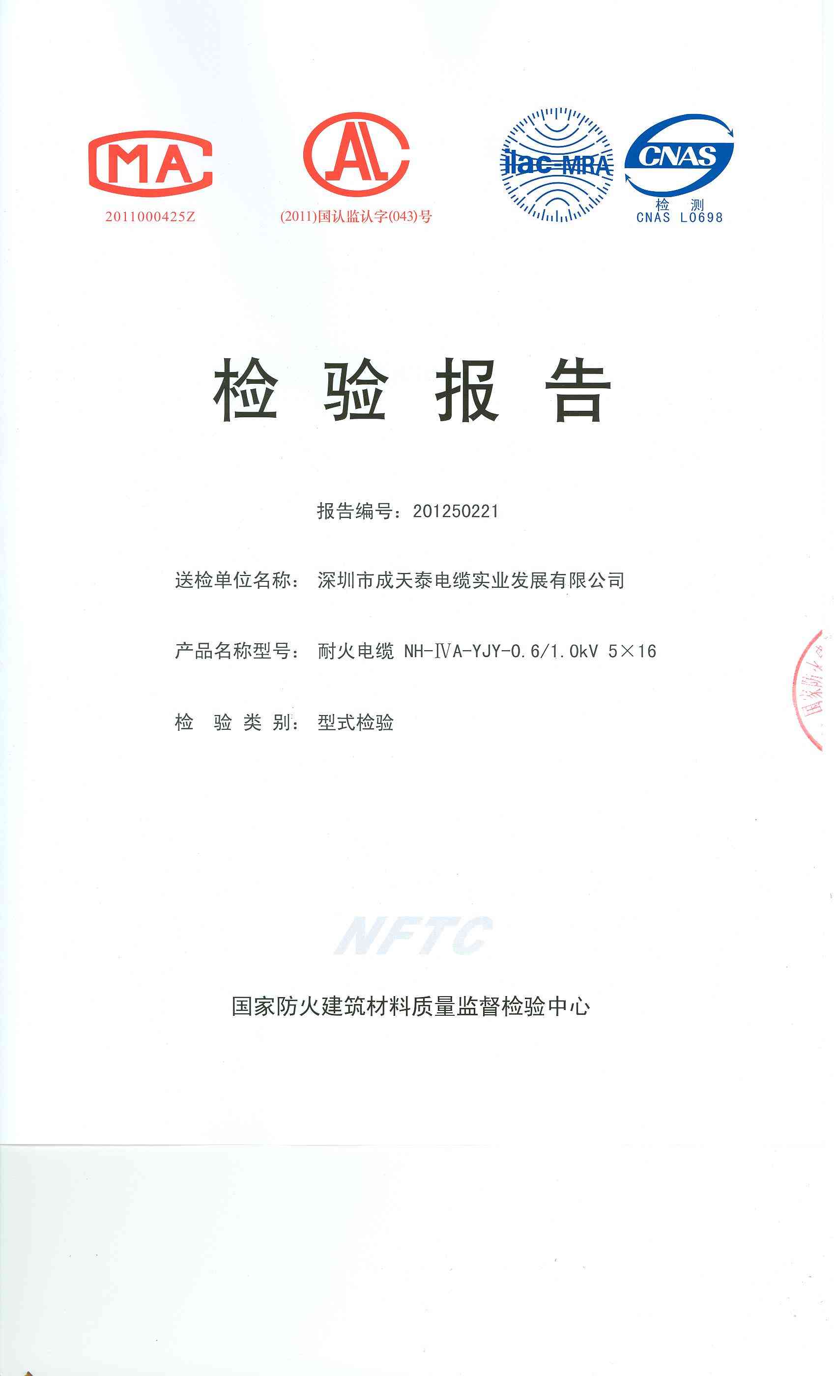 经检验,该NH-ⅣA-YJY-0.6/1.0kV 5×16耐火电缆耐火性能符合ⅣA级规定要求,其它各项技术指标均合格。 按GA 306.2-2007综合判定,该产品质量合格。(以下空白)