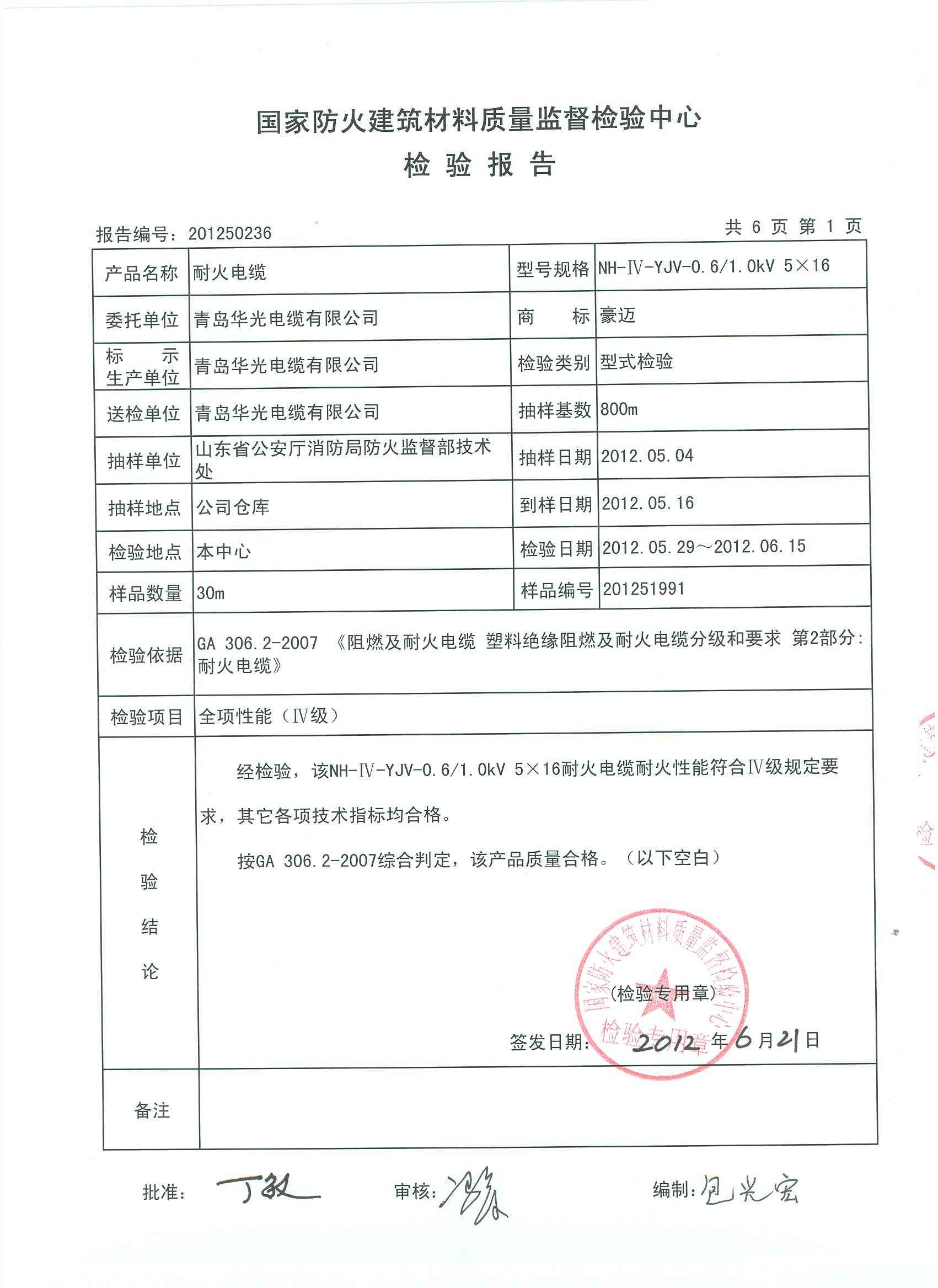 经检验,该NH-Ⅳ-YJV-0.6/1.0kV 5×16耐火电缆耐火性能符合Ⅳ级规定要求,其它各项技术指标均合格。 按GA 306.2-2007综合判定,该产品质量合格。(以下空白)
