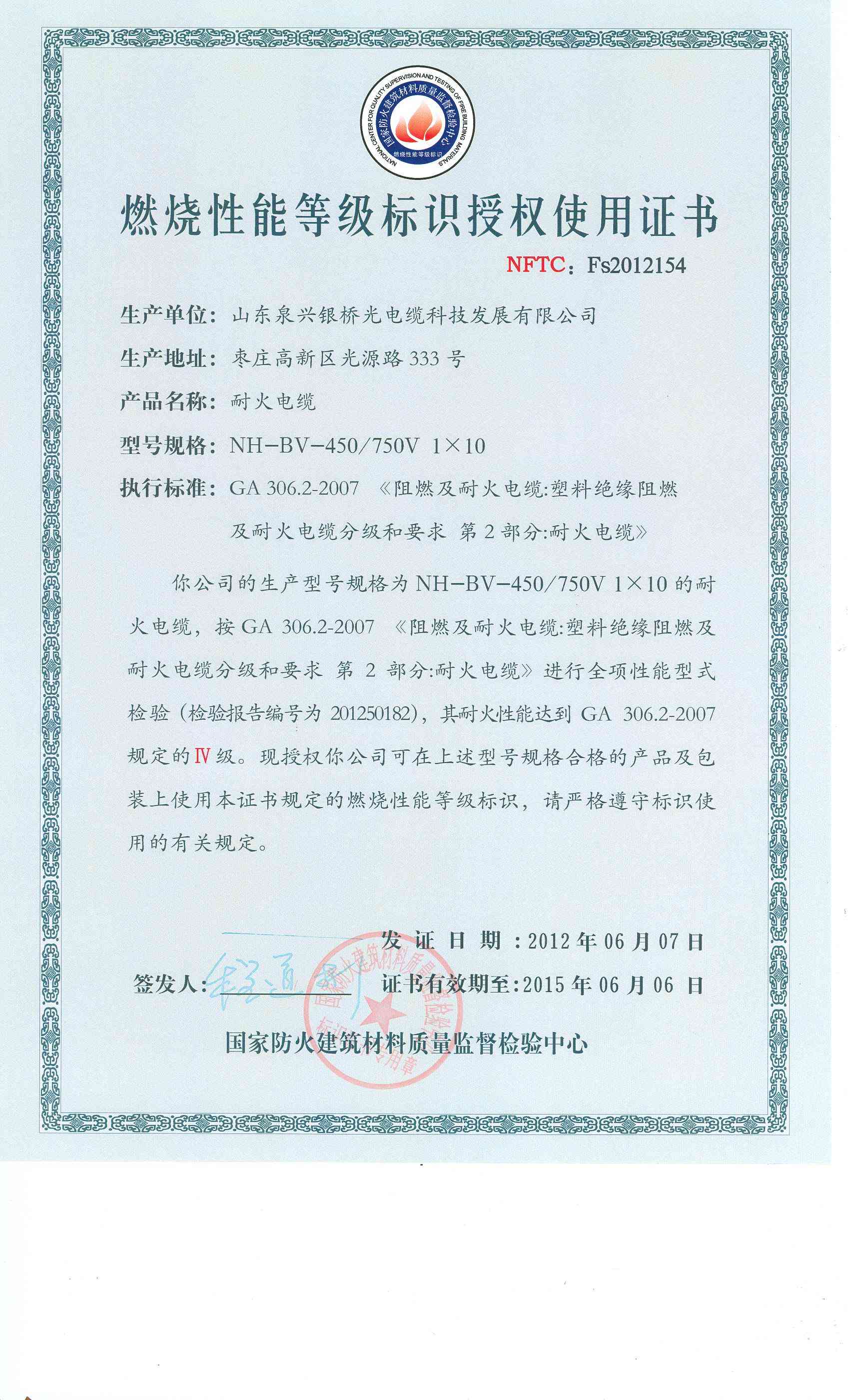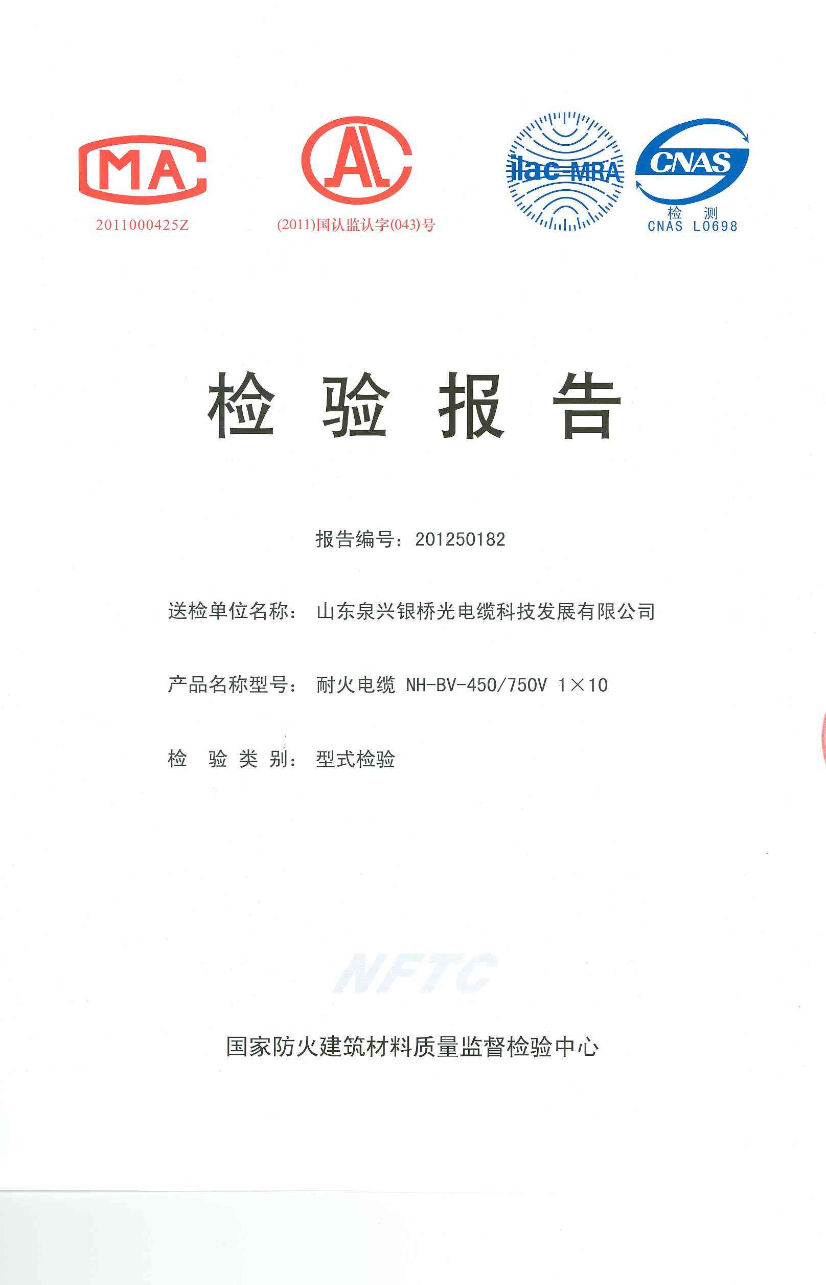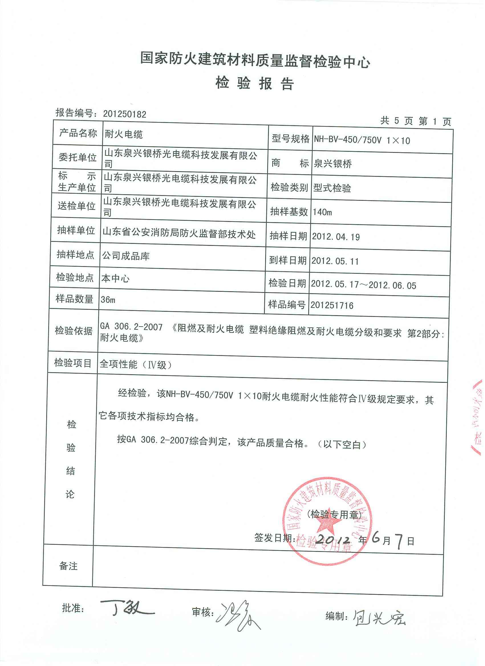 经检验,该NH-BV-450/750V 1×10耐火电缆耐火性能符合Ⅳ级规定要求,其它各项技术指标均合格。 按GA 306.2-2007综合判定,该产品质量合格。(以下空白)